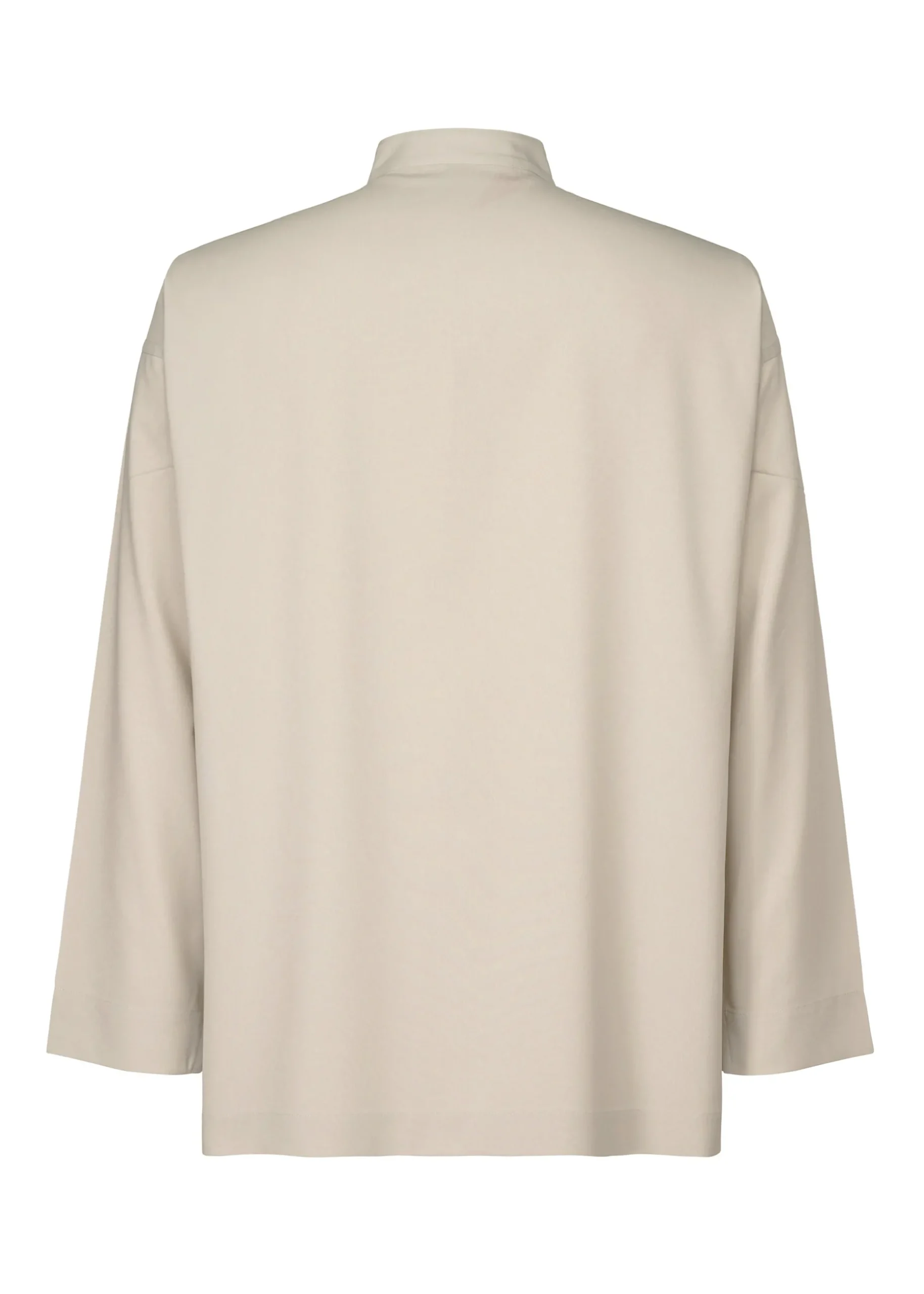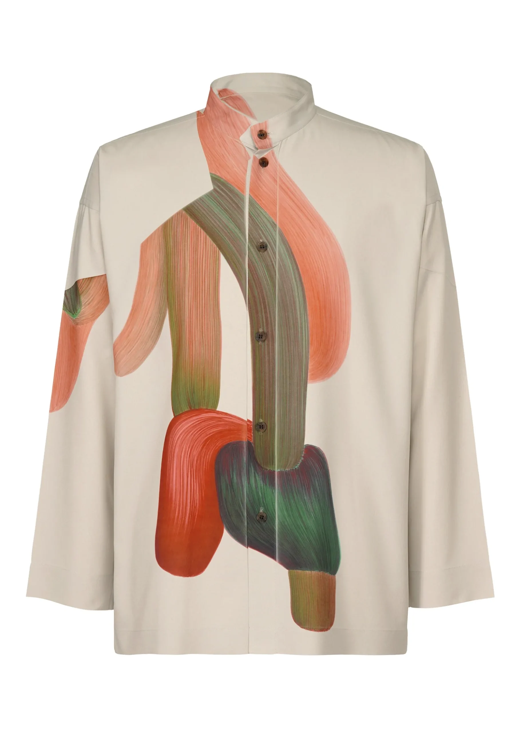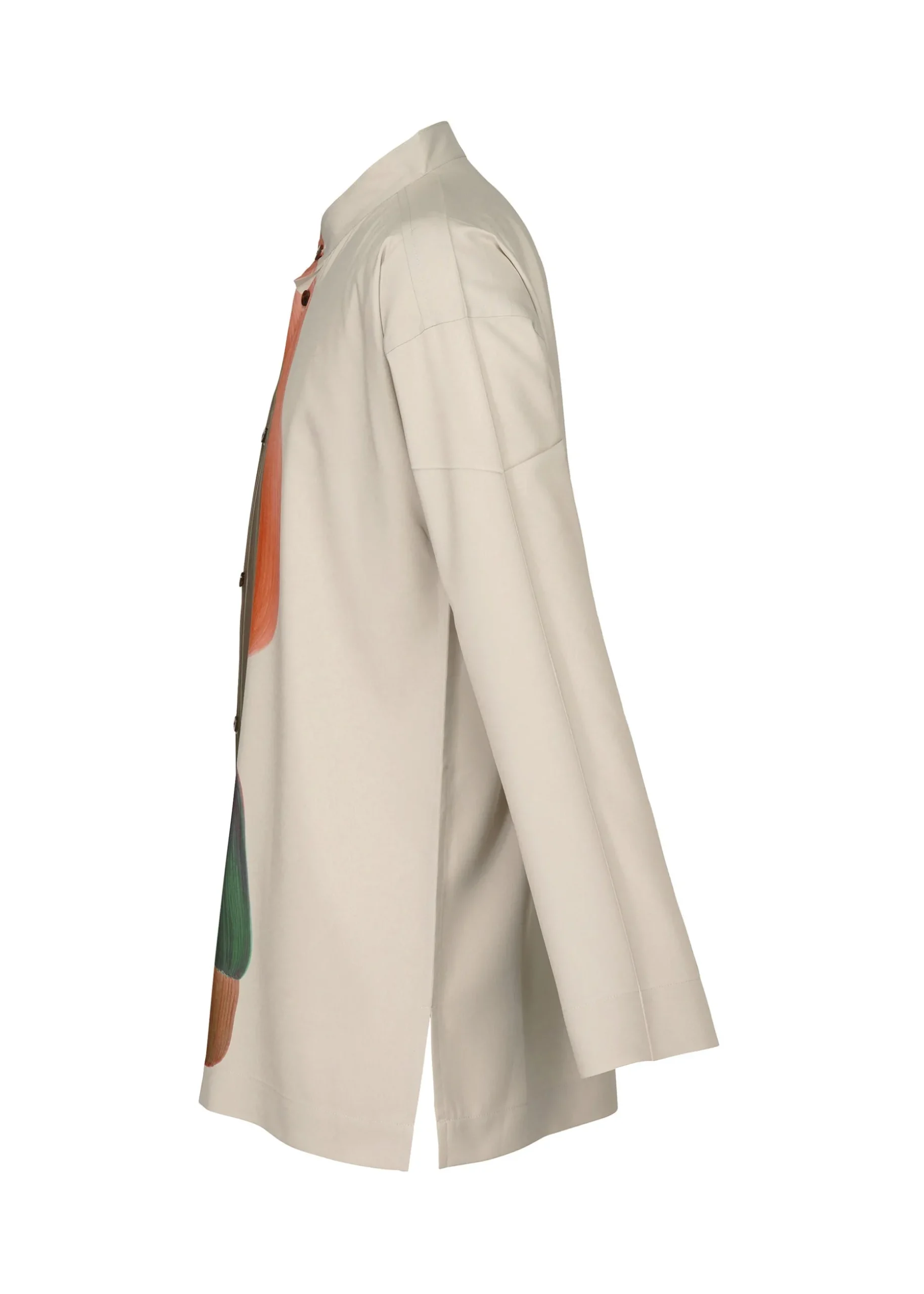 This shirt with a standing collar has a transfer print featuring designer/artist Ronan Bouroullec’s drawings. The sleeves and torso area are folded in a way that brings out the inherent impact of the pattern. There are slits on both sides.
