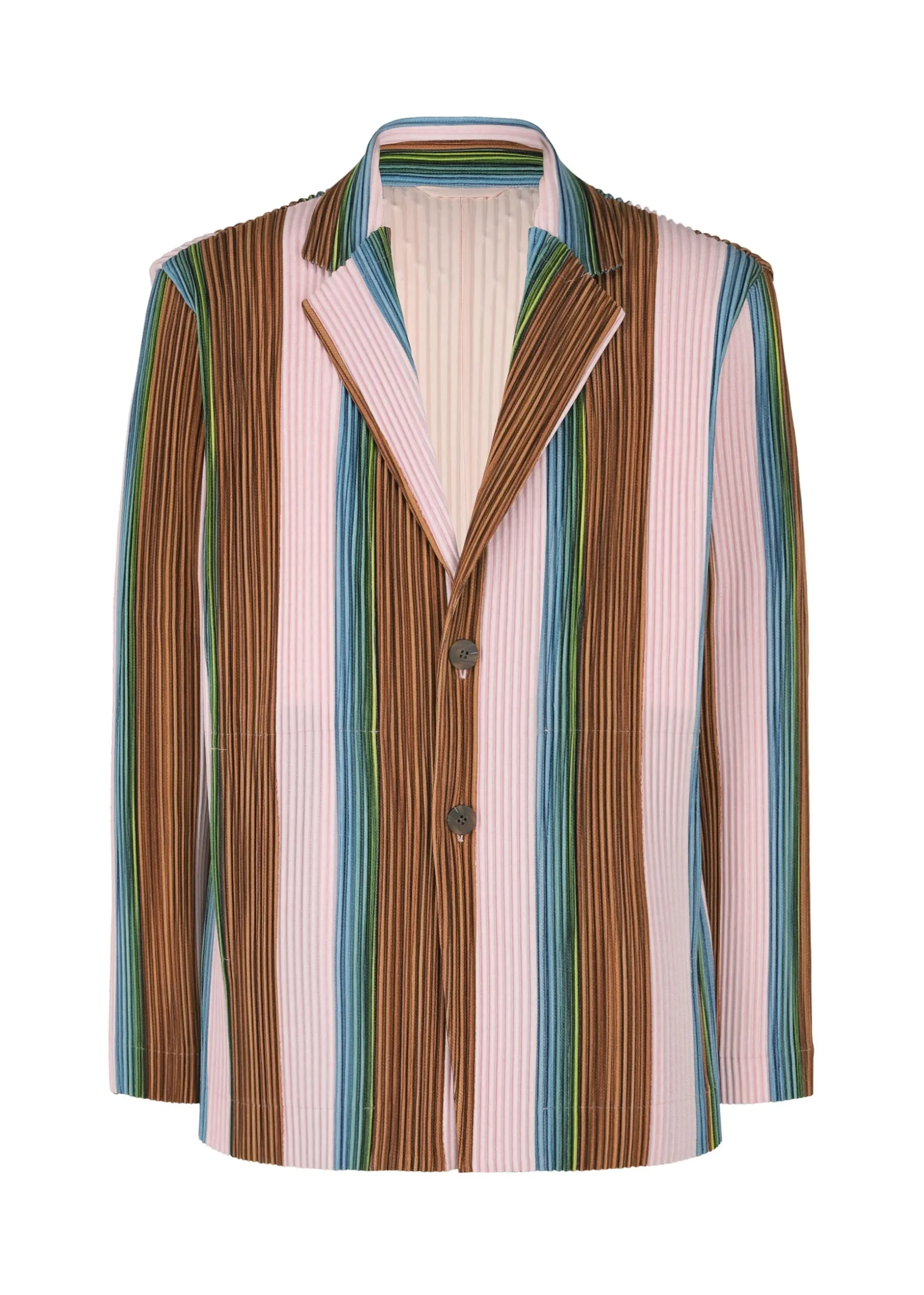 This tailored jacket has a striped print cut from part of a drawing by designer/artist Ronan Bouroullec. The inkjet print on both sides of the kersey fabric gives this jacket a wonderfully colorful finish. You can enjoy it as an item with a presence. It has pockets on both sides as well as inside pockets, and a center vent at the back.