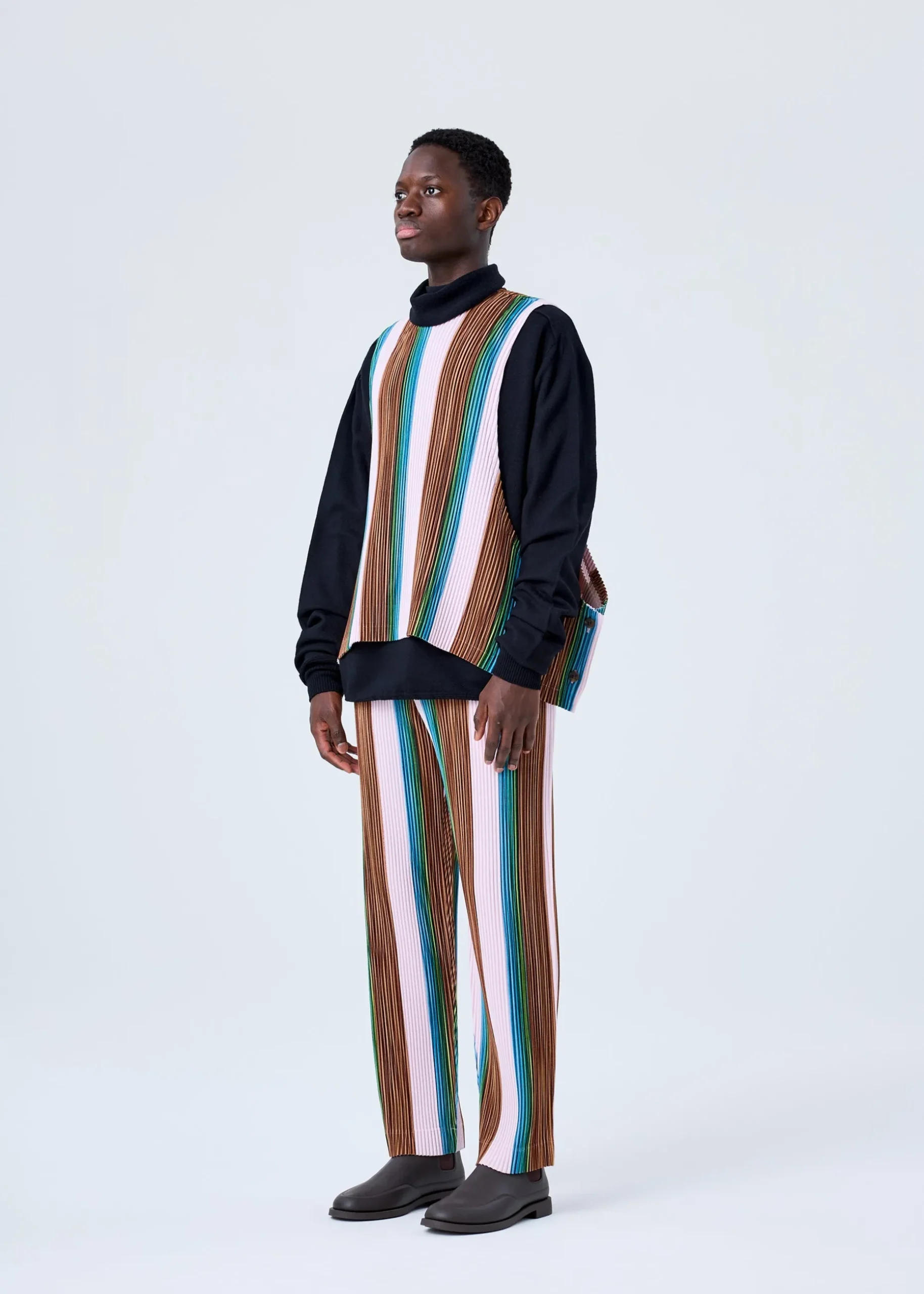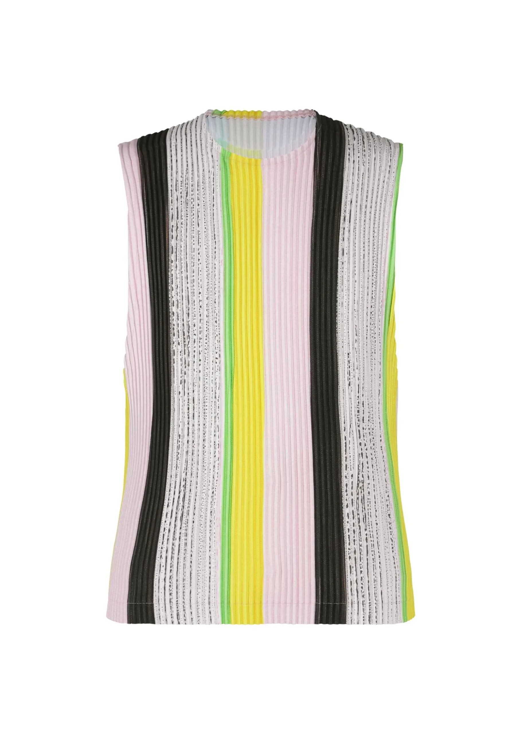 This round-neck vest has a striped print cut from part of a drawing by designer/artist Ronan Bouroullec. The inkjet print on both sides of the kersey fabric gives this vest a wonderfully colorful finish. You can enjoy it as an item with a presence.