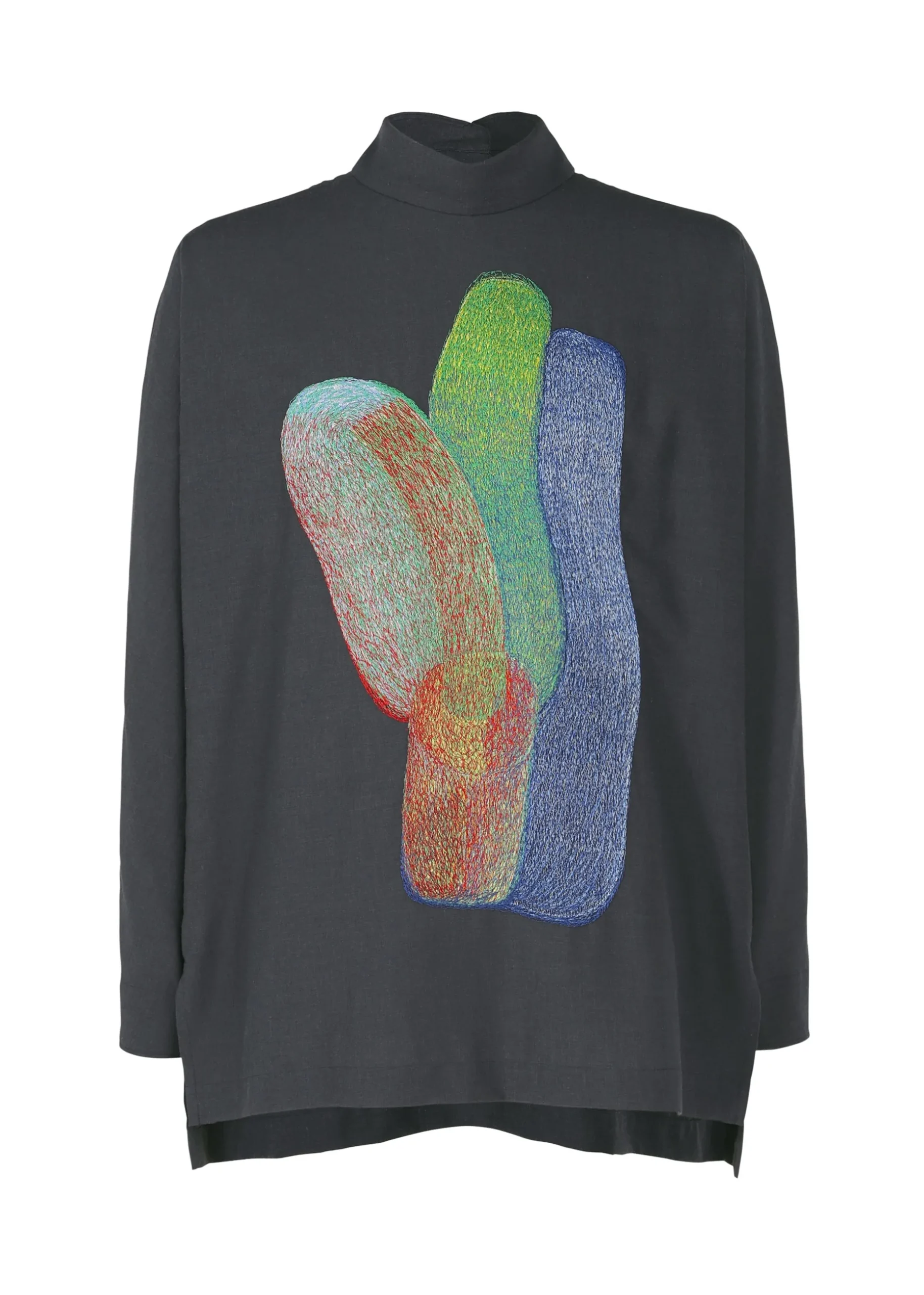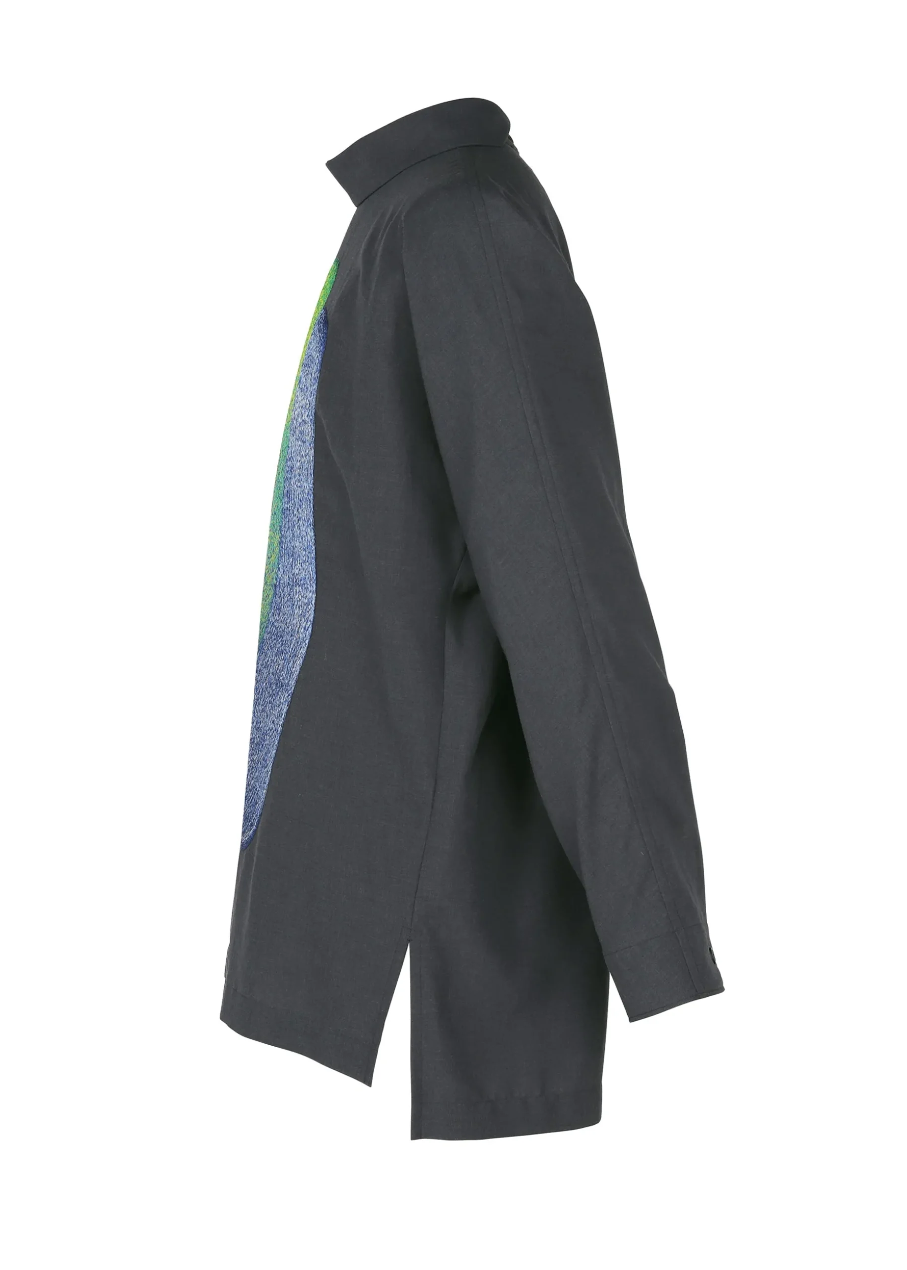 This shirt with a standing collar faithfully reproduces designer/artist Ronan Bouroullec’s “STYLO-BILLE” series drawings using embroidery. The shirt is designed to have large blank spaces in order to maximize the dynamic look of the pattern. It has slits on both sides.