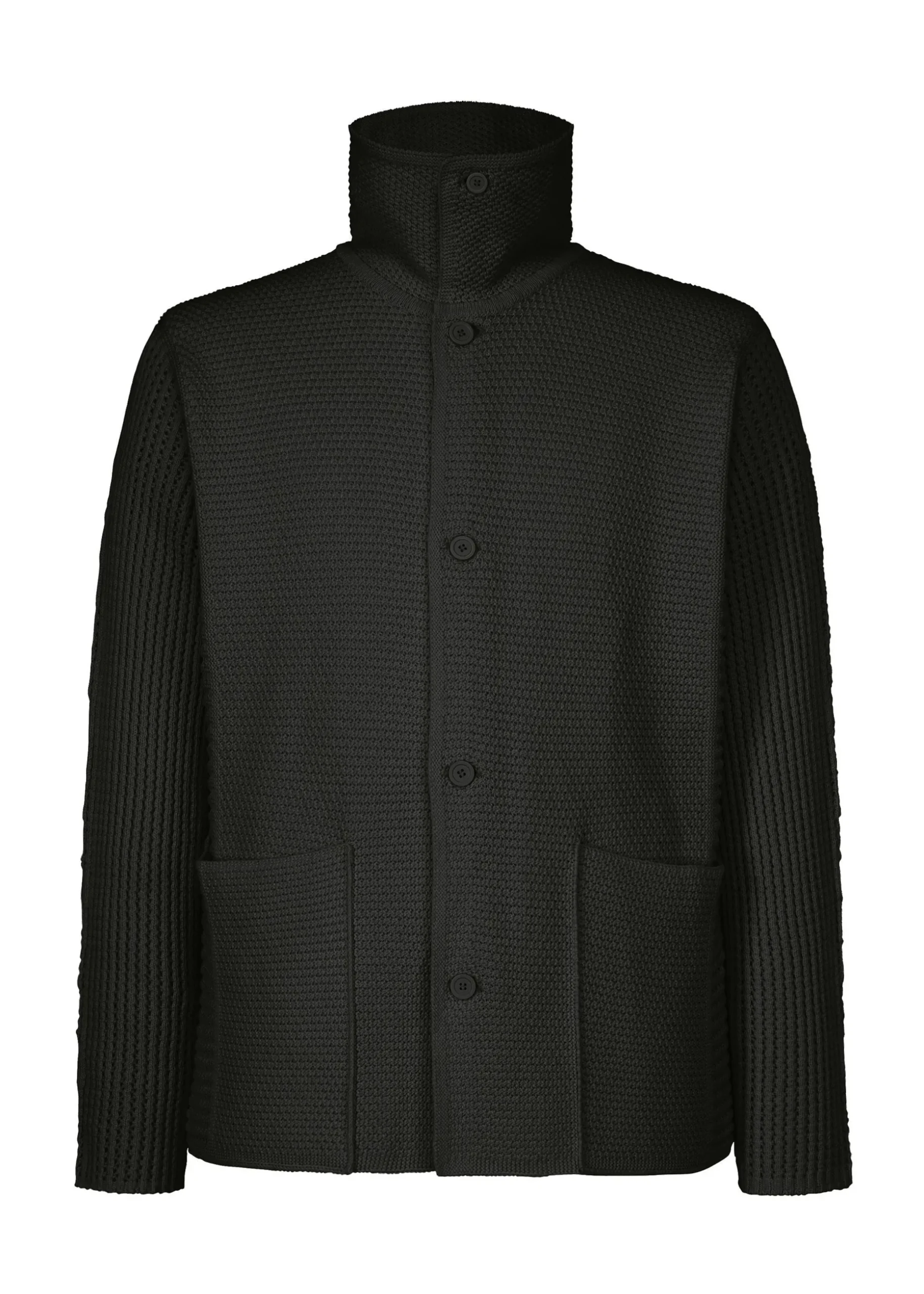 This knit jacket is characterized by its varied silhouette combining standard knitted fabric and ribbing. It has pockets on both sides.