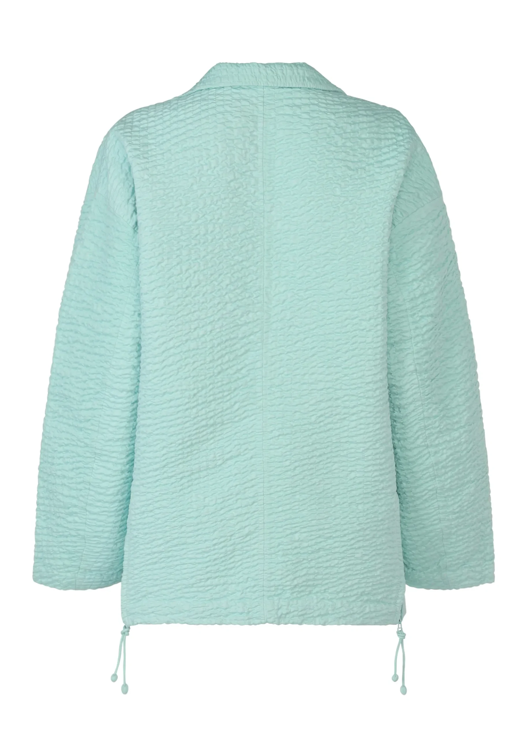 This jacket is fully adorned with Kabira, a traditional Indian embroidery technique. It combines moderately glossy cotton satin with thin, soft gauze, which is lavishly machine-stitched with fine Kabira embroidery at 1.0 cm intervals while gradually gathering the fabric. The zipper with a dori* at the hem serves as an accent.
