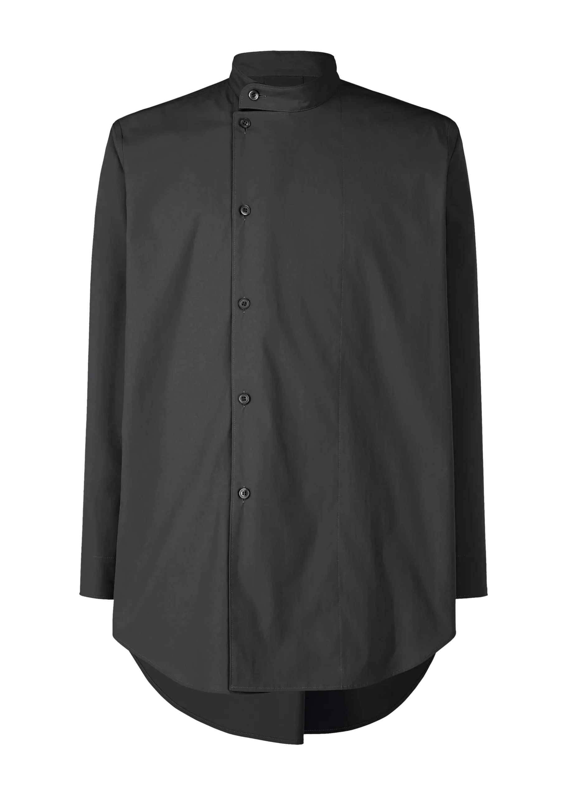 This shirt with a standing collar is available in deep color tones using yarn-dyed thread. It has a simple design that is easy to style in outfits.