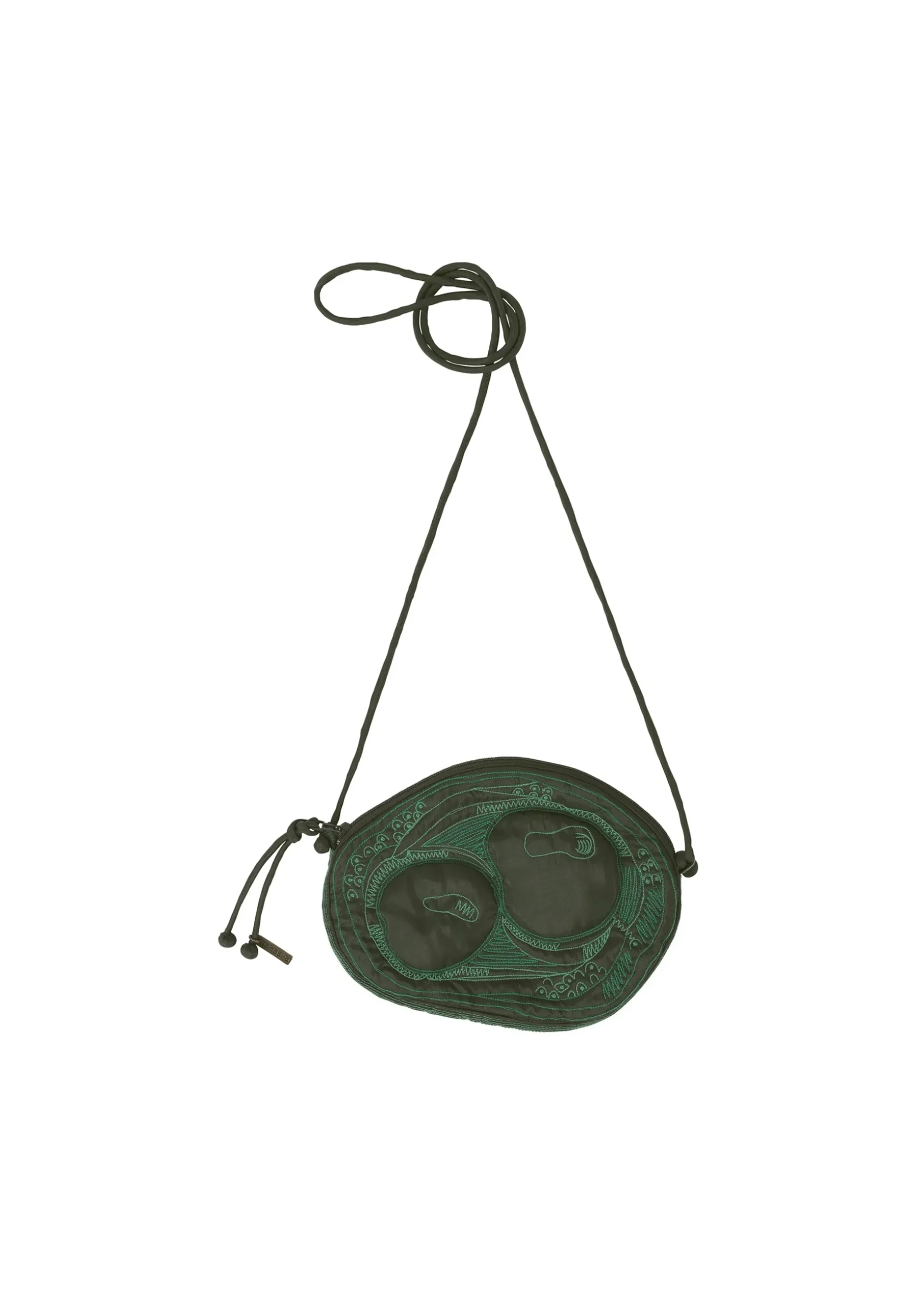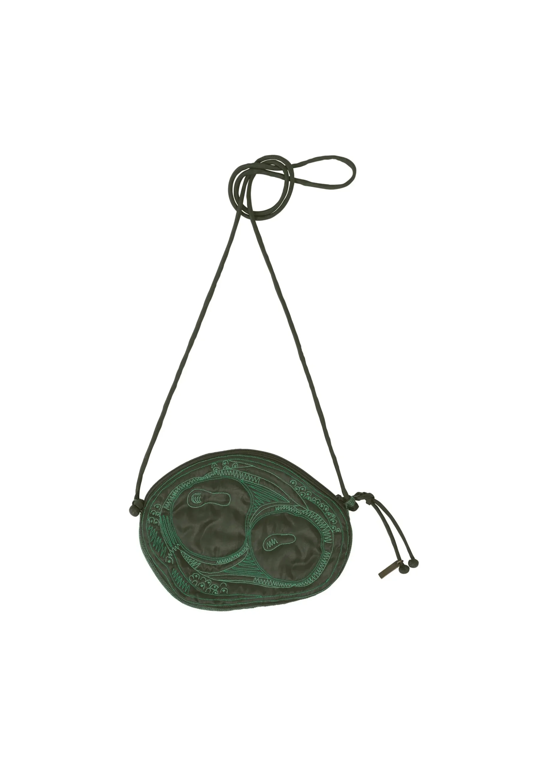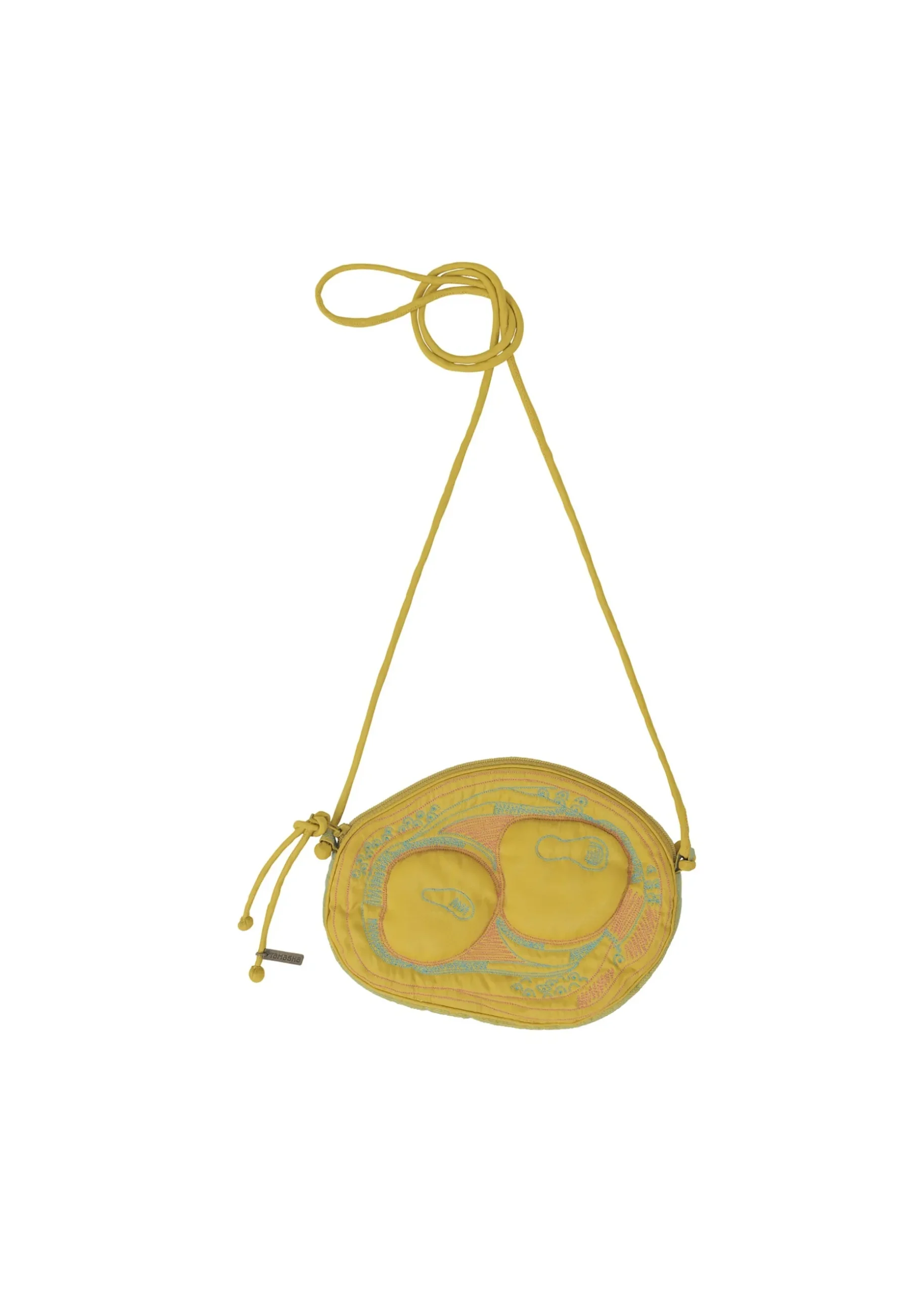 A shoulder bag made in India with BHILL embroidery (*) with motifs of acacia, hickory nuts, eucalyptus, pagoda tree, and akebia fruit and seeds. The design is partially filled with cotton, giving it a fun three-dimensional feel that makes the seeds stand out.