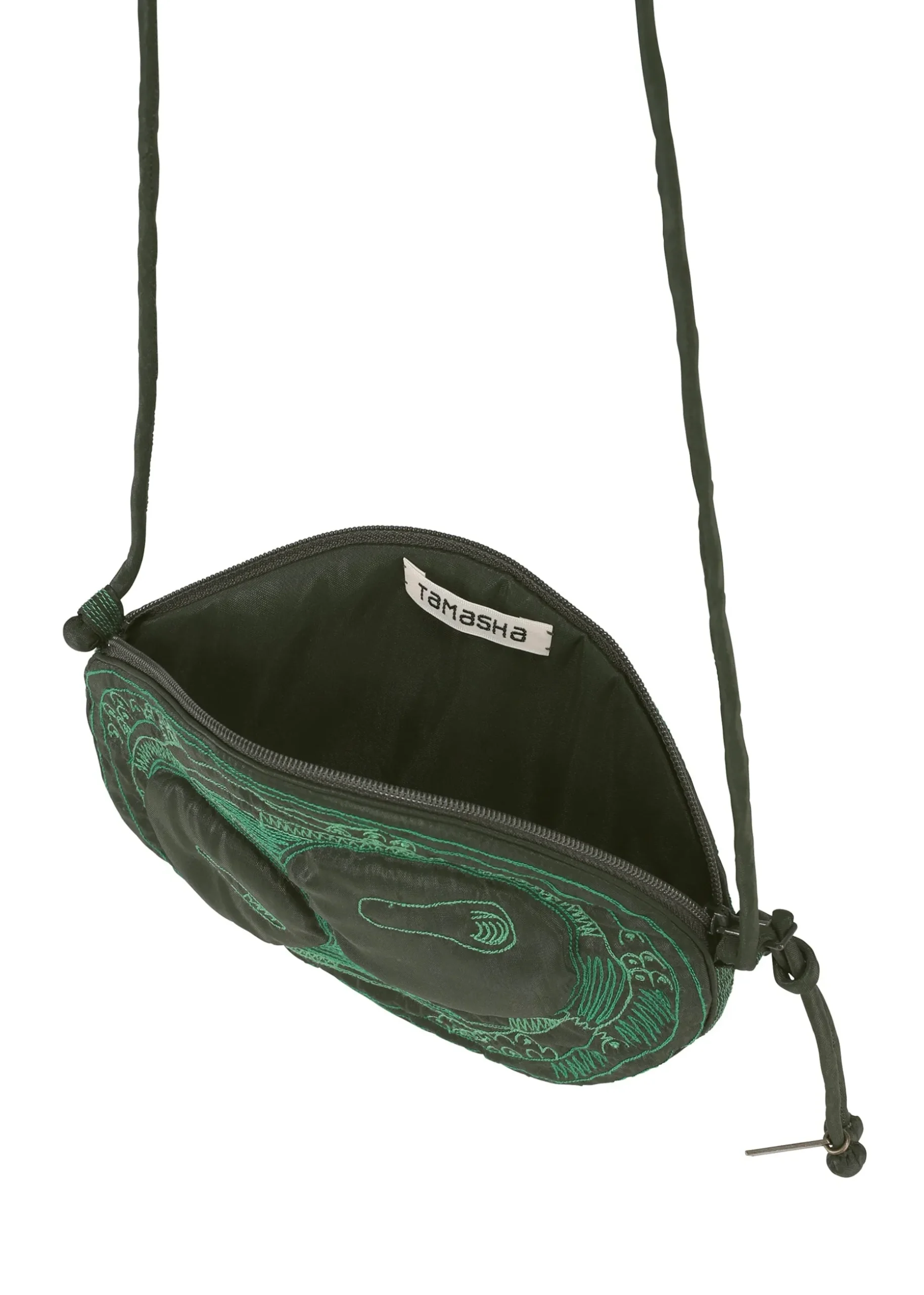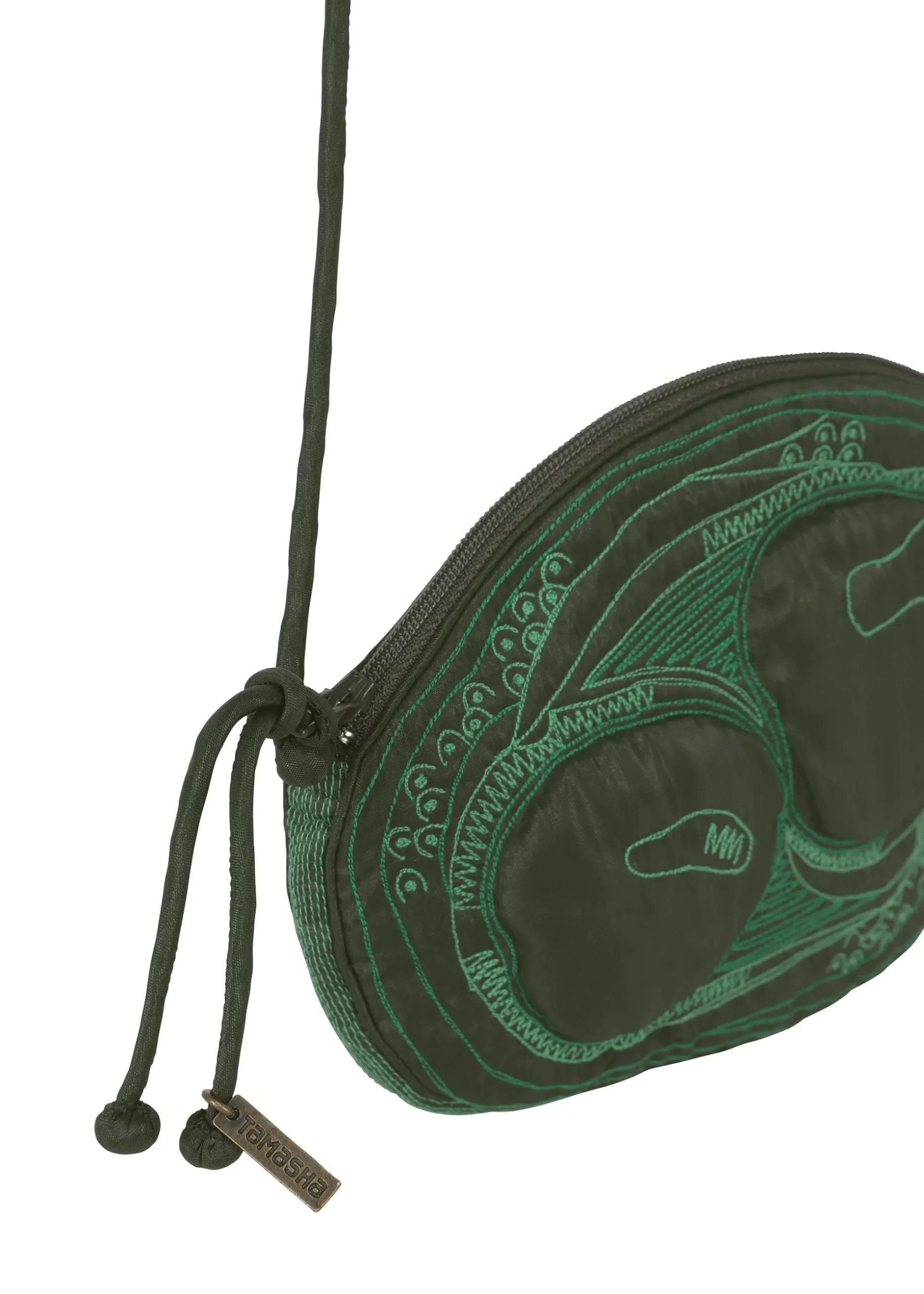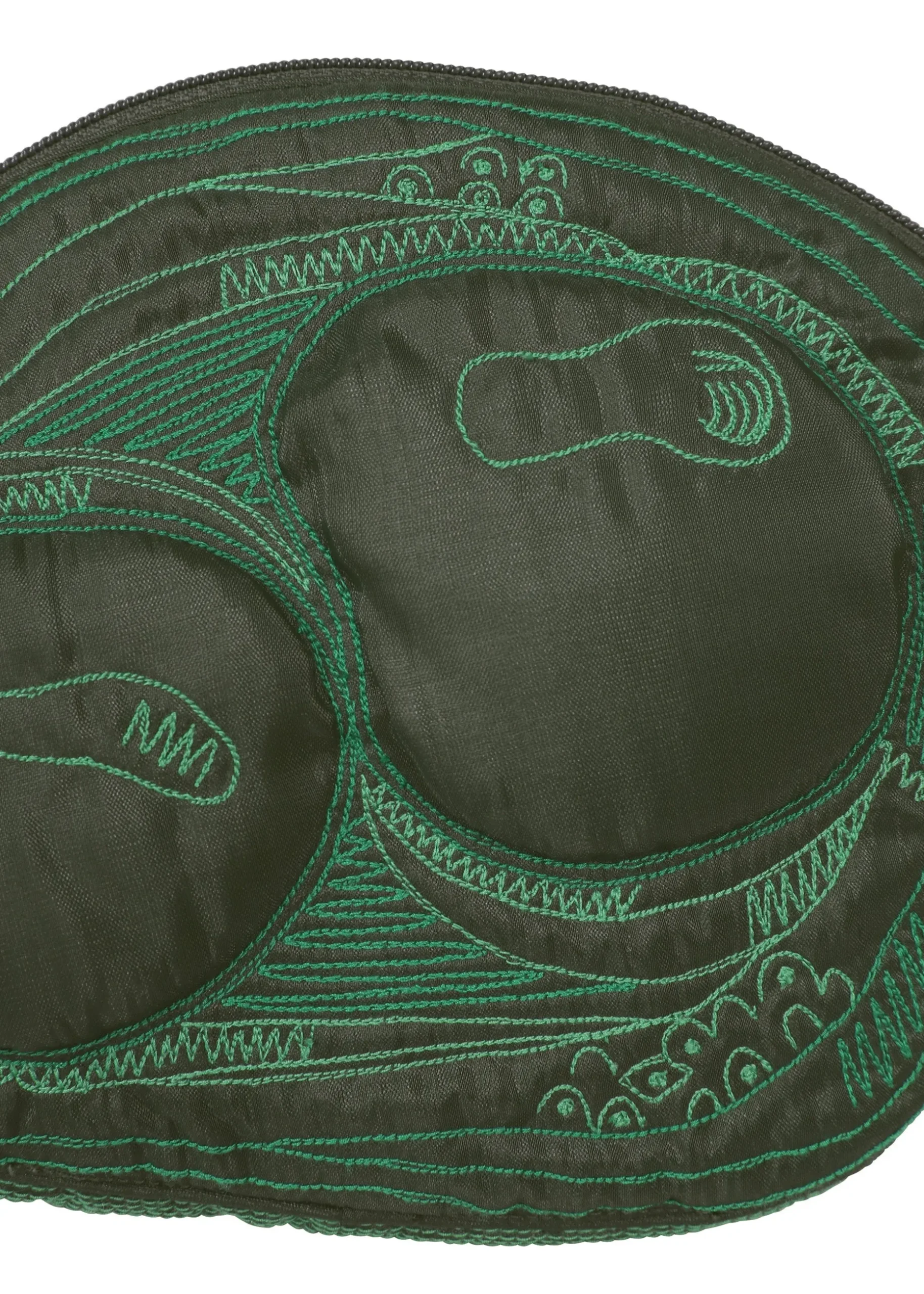 A shoulder bag made in India with BHILL embroidery (*) with motifs of acacia, hickory nuts, eucalyptus, pagoda tree, and akebia fruit and seeds. The design is partially filled with cotton, giving it a fun three-dimensional feel that makes the seeds stand out.