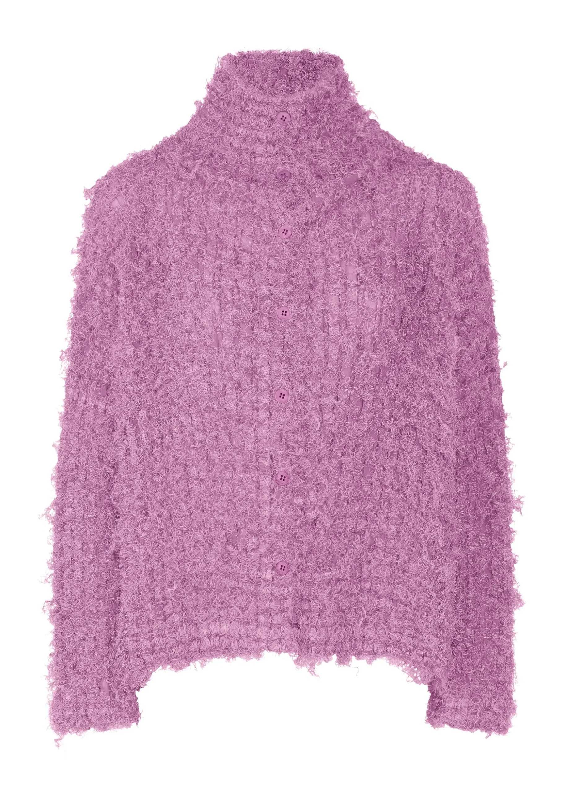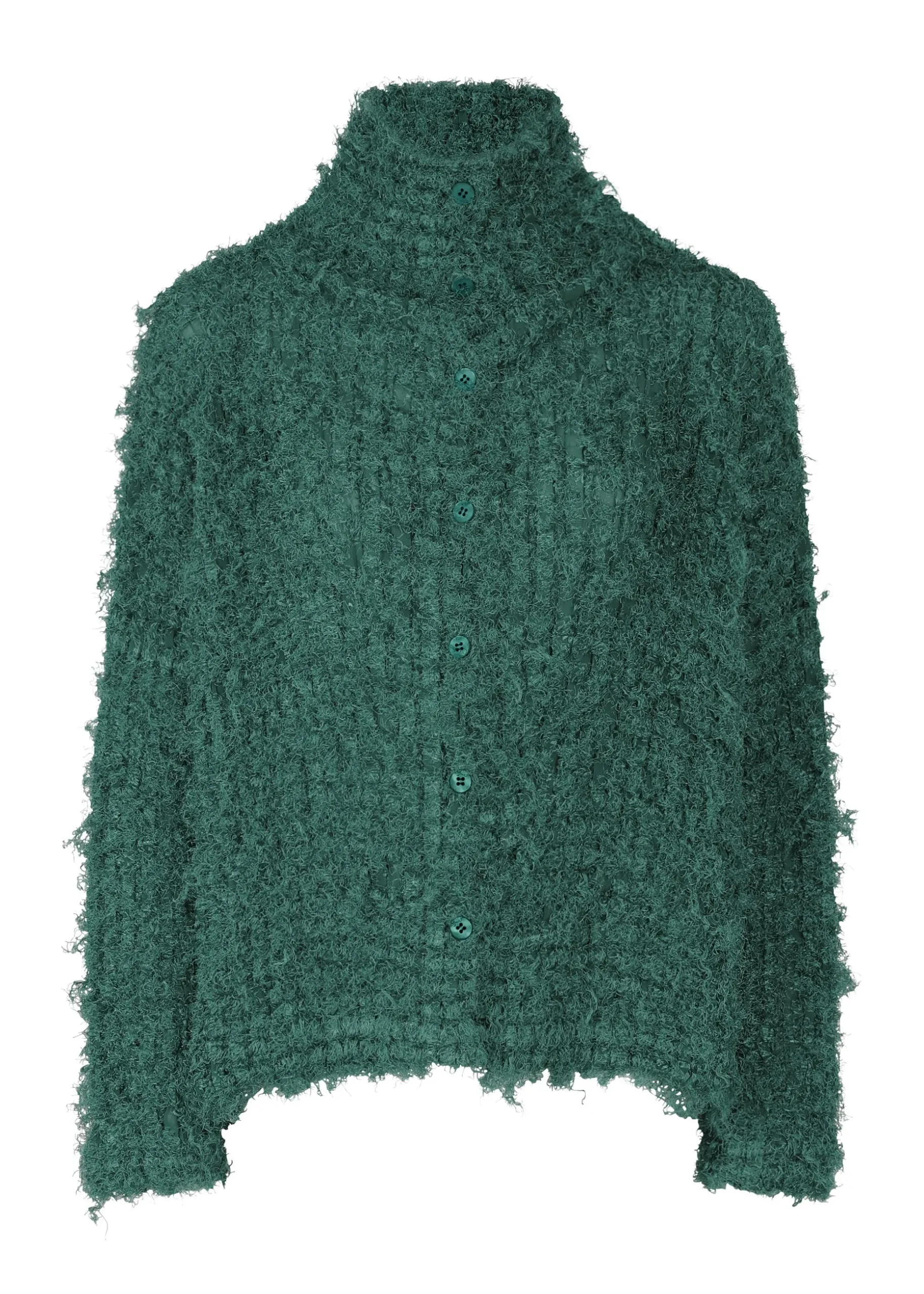 This warm long-sleeved cardigan is made from shaggy cut jacquard fabric with vertical and horizontal pleats. The vivid colors and knit-like volume will add a glamorous touch to your outfit.