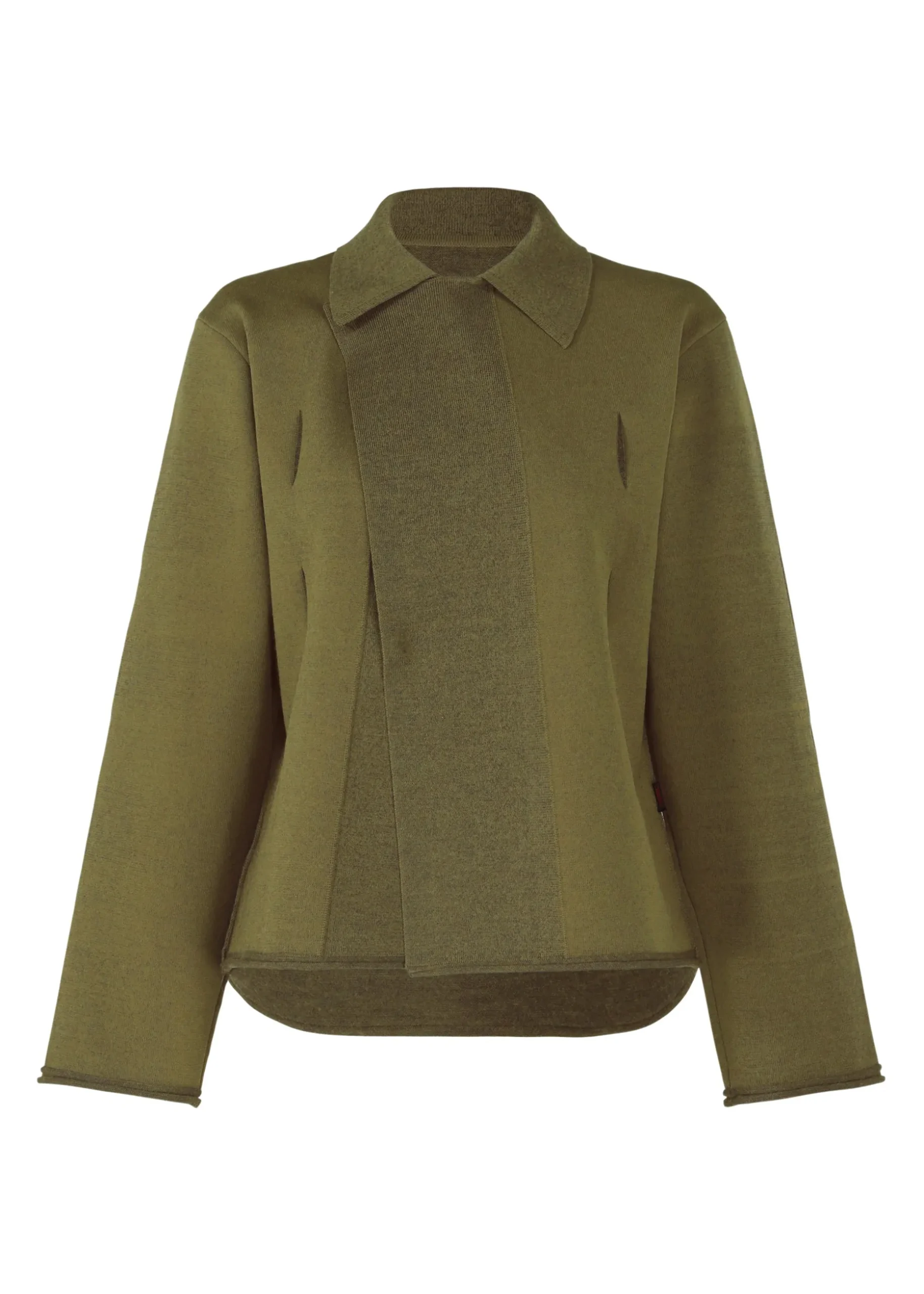 This long-sleeved knit jacket features a square cutout design. Recycled polyester thread is used for the front and 100% wool yarn for the lining, which is fulled to create a fluffy material with moderate thickness.
