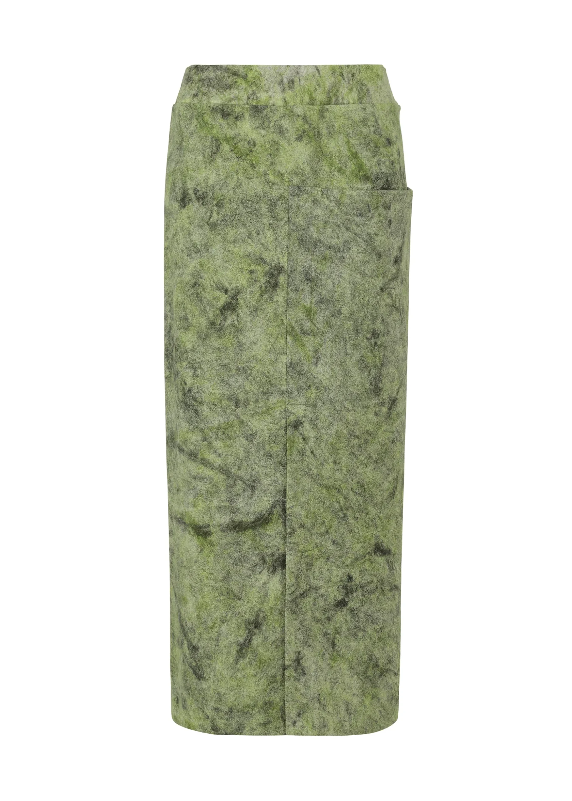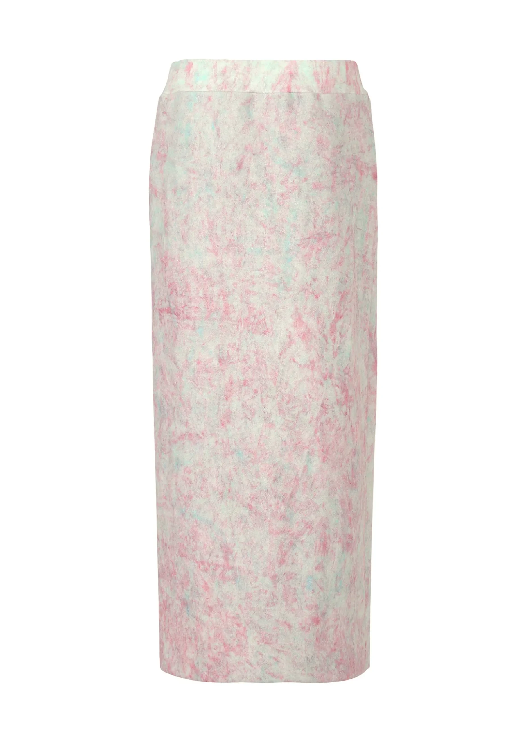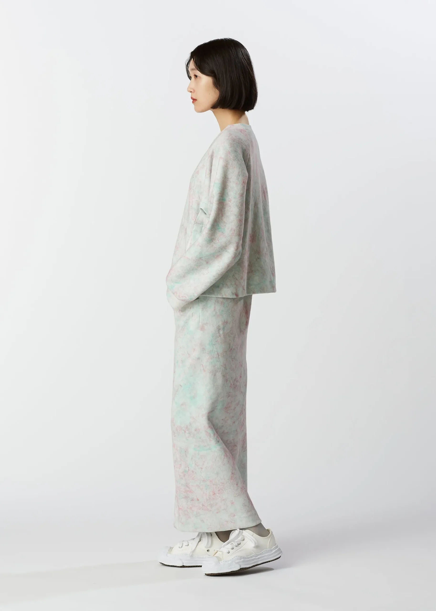 This skirt expresses the look of the sky you see in a forest by using a special technique called speck dyeing, in which dye is coarsely granulated to create speckled, uneven coloring on the fabric. It is characterized by its beautiful color shading created by the blending of two dye colors when each item is hand-dyed by artisans. The skirt is made from double-knit jersey with organic cotton on the outside and recycled polyester in the lining. The length of the front center slit can be adjusted with the snap buttons.
