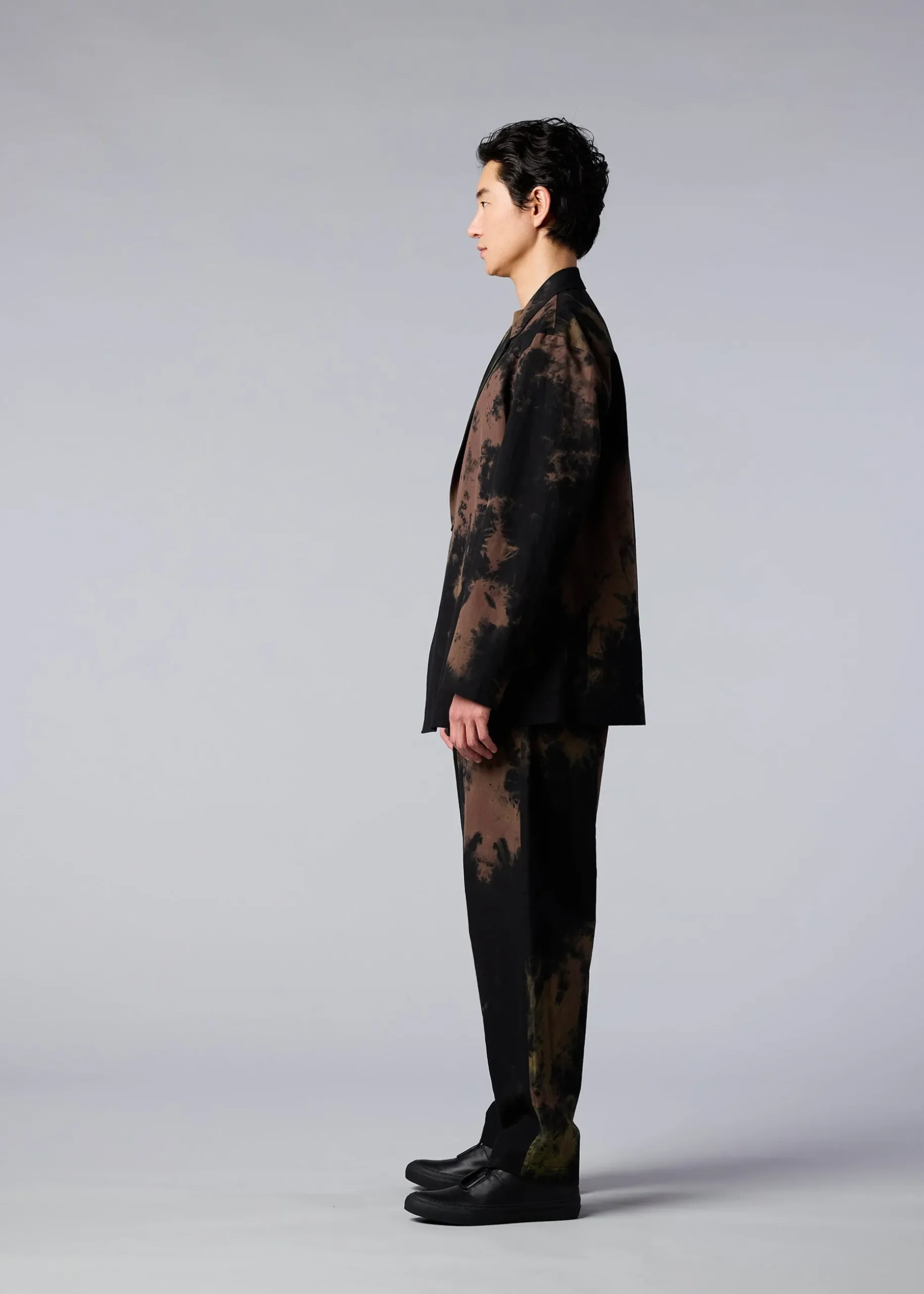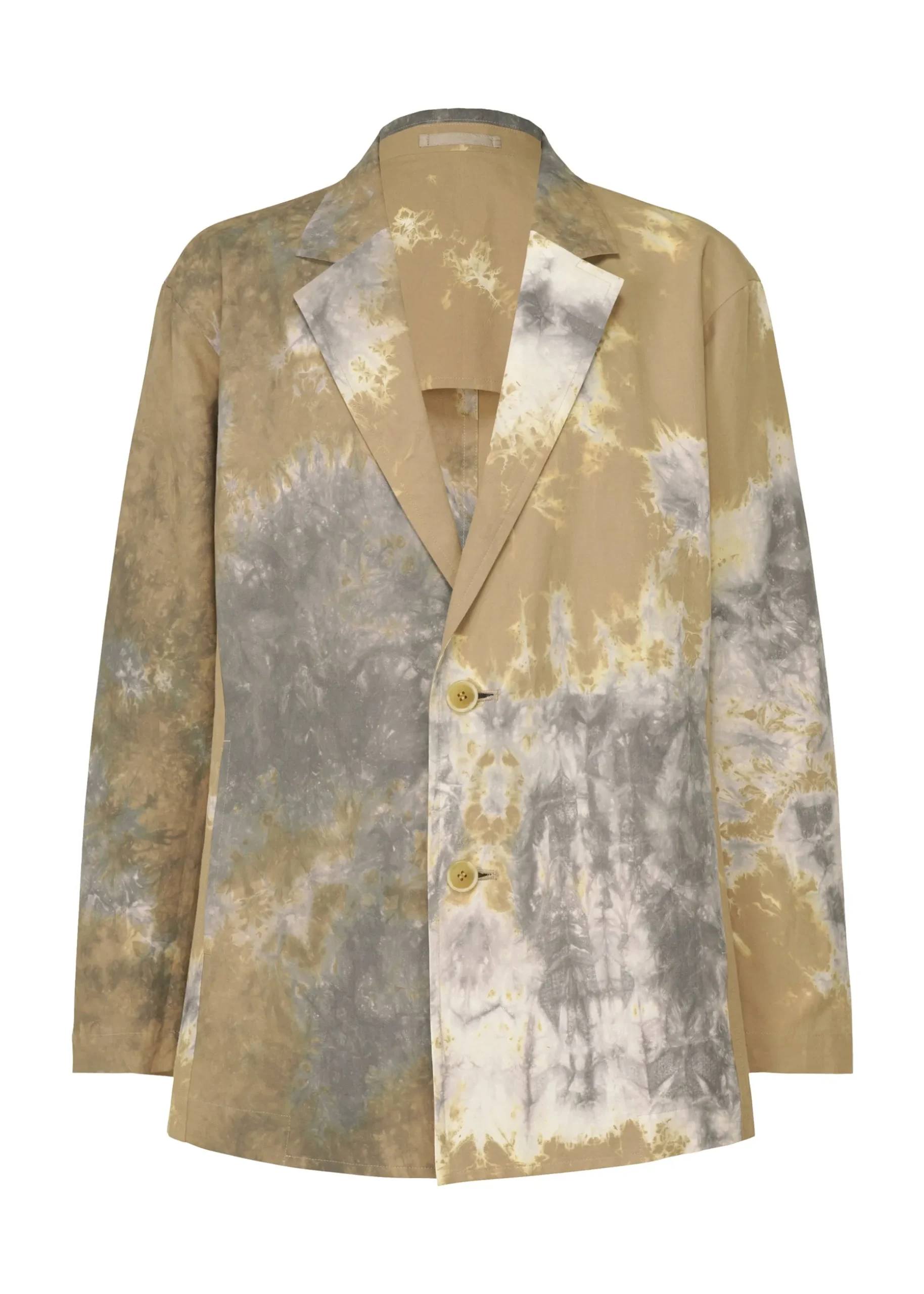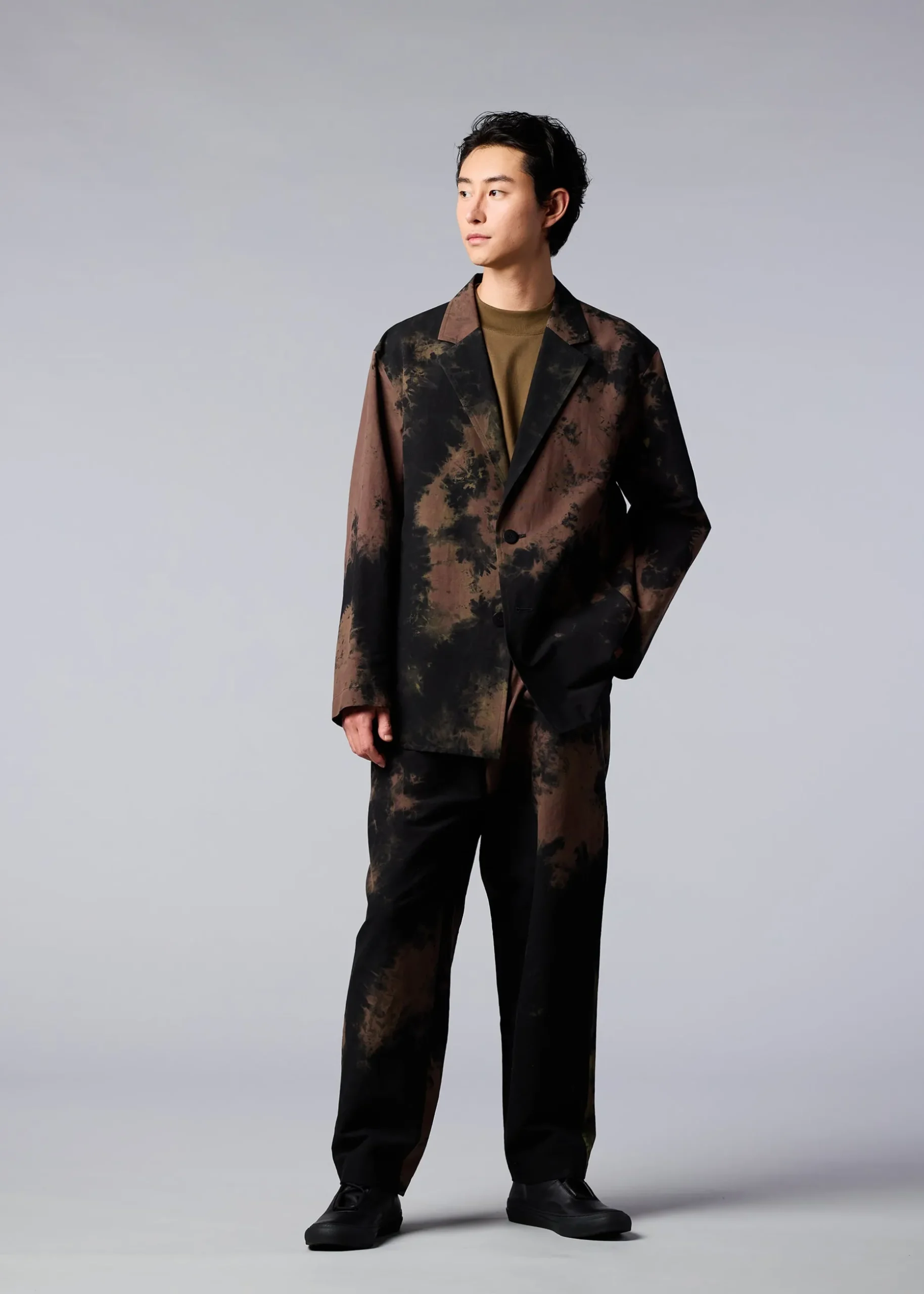 A jacket featuring textiles made using discharge printing and dyeing techniques. A unique pattern is created by layering fabrics of the base color in a dynamic and complex manner and performing discharge printing and dyeing in this state. The pattern of this product is different one by one. Thank you for your understanding in advance.