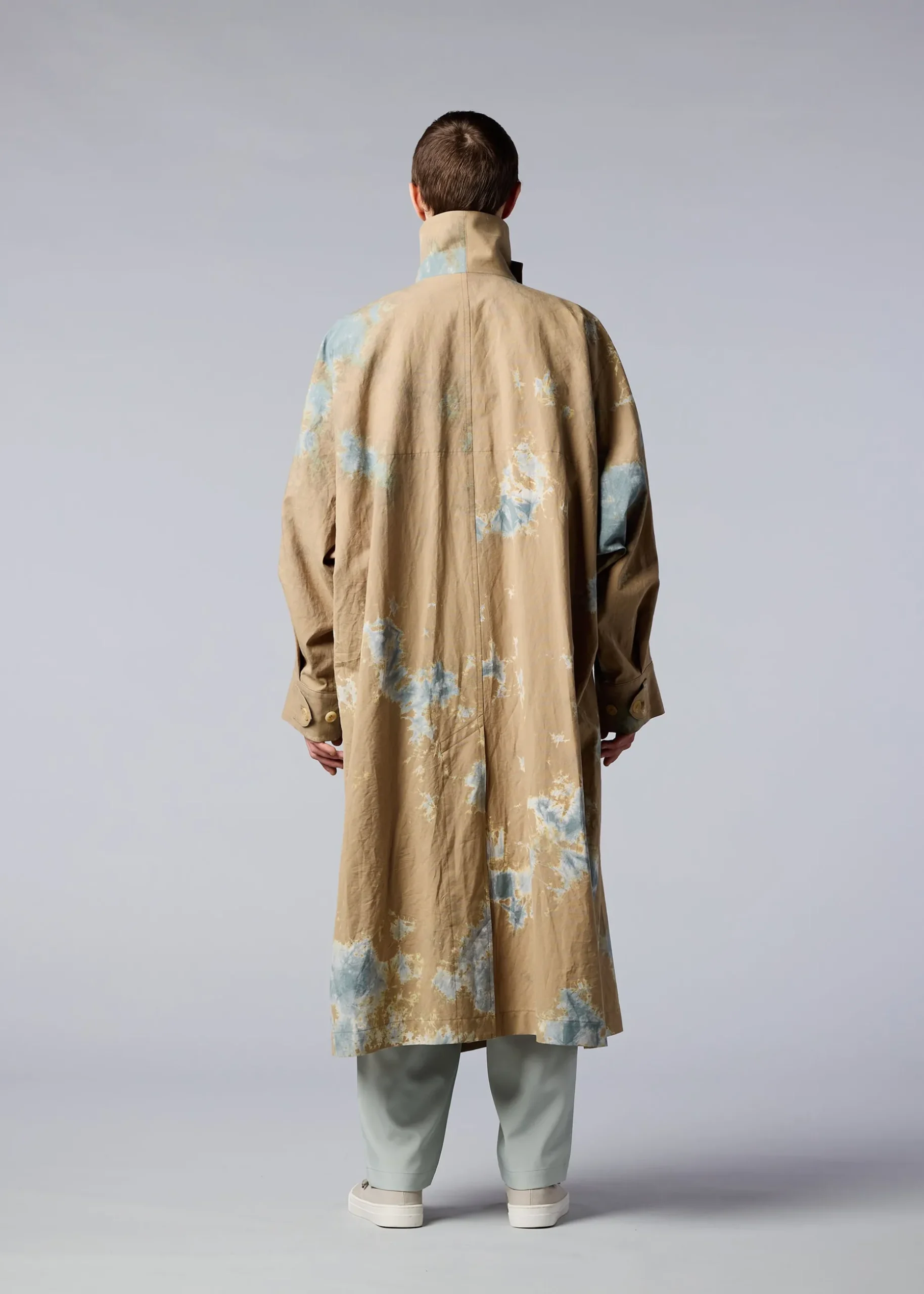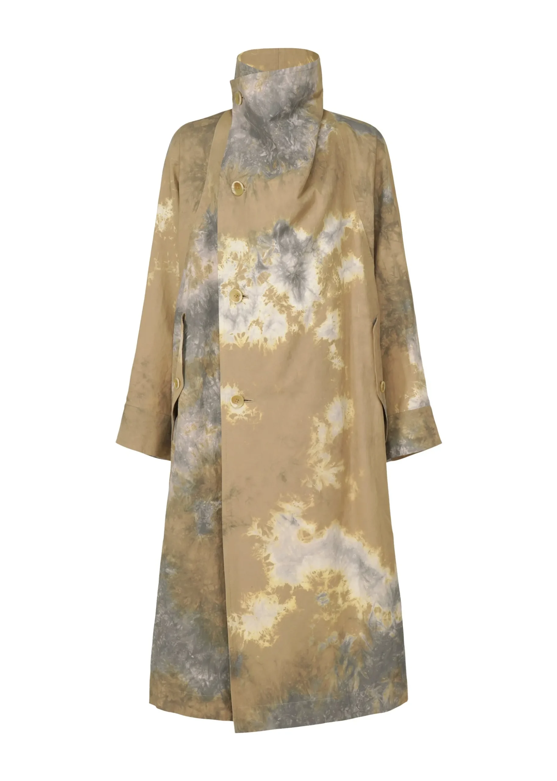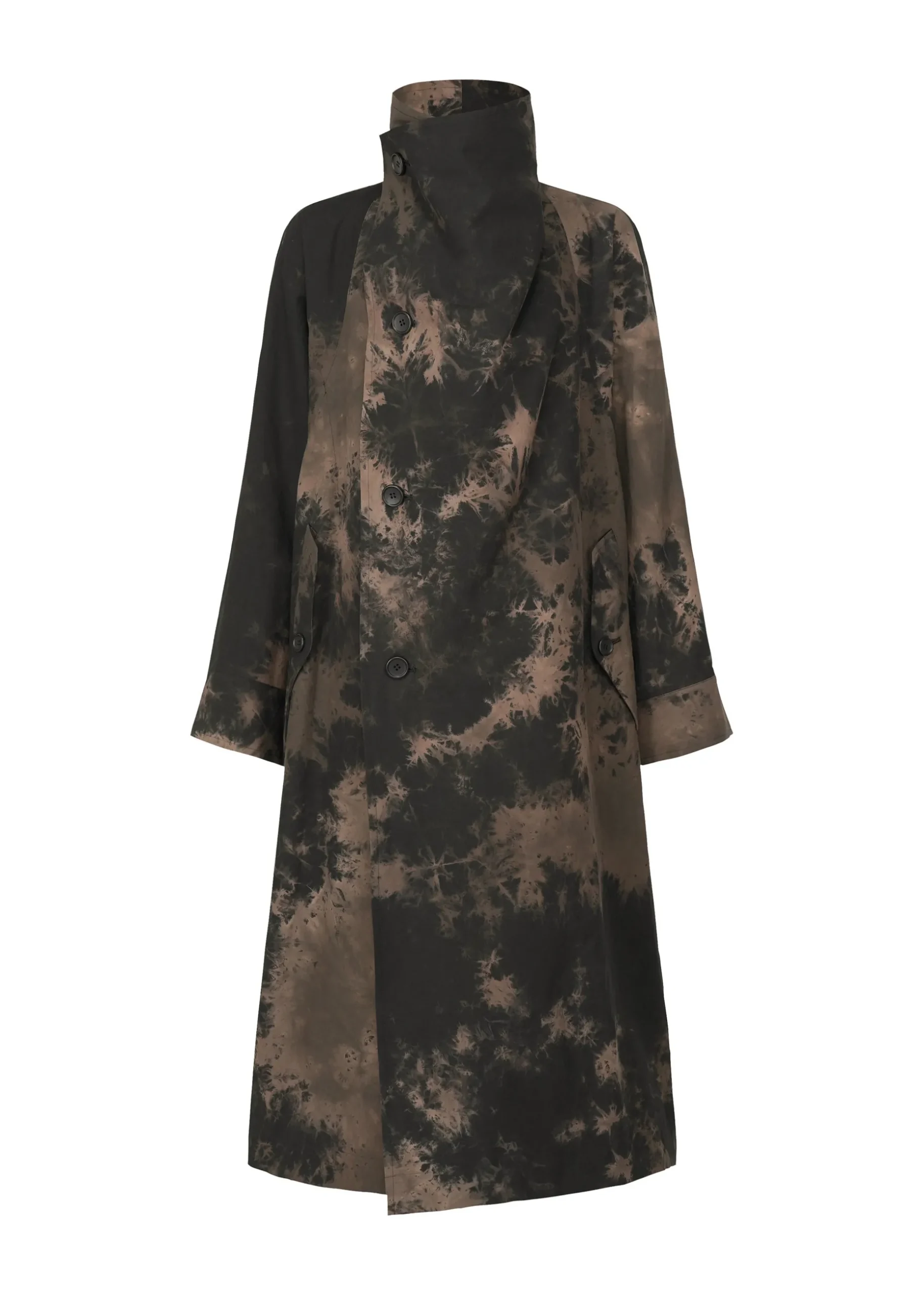 A coat featuring textiles made using discharge printing and dyeing techniques. A unique pattern is created by layering fabrics of the base color in a dynamic and complex manner and performing discharge printing and dyeing in this state. The pattern of this product is different one by one. Thank you for your understanding in advance.