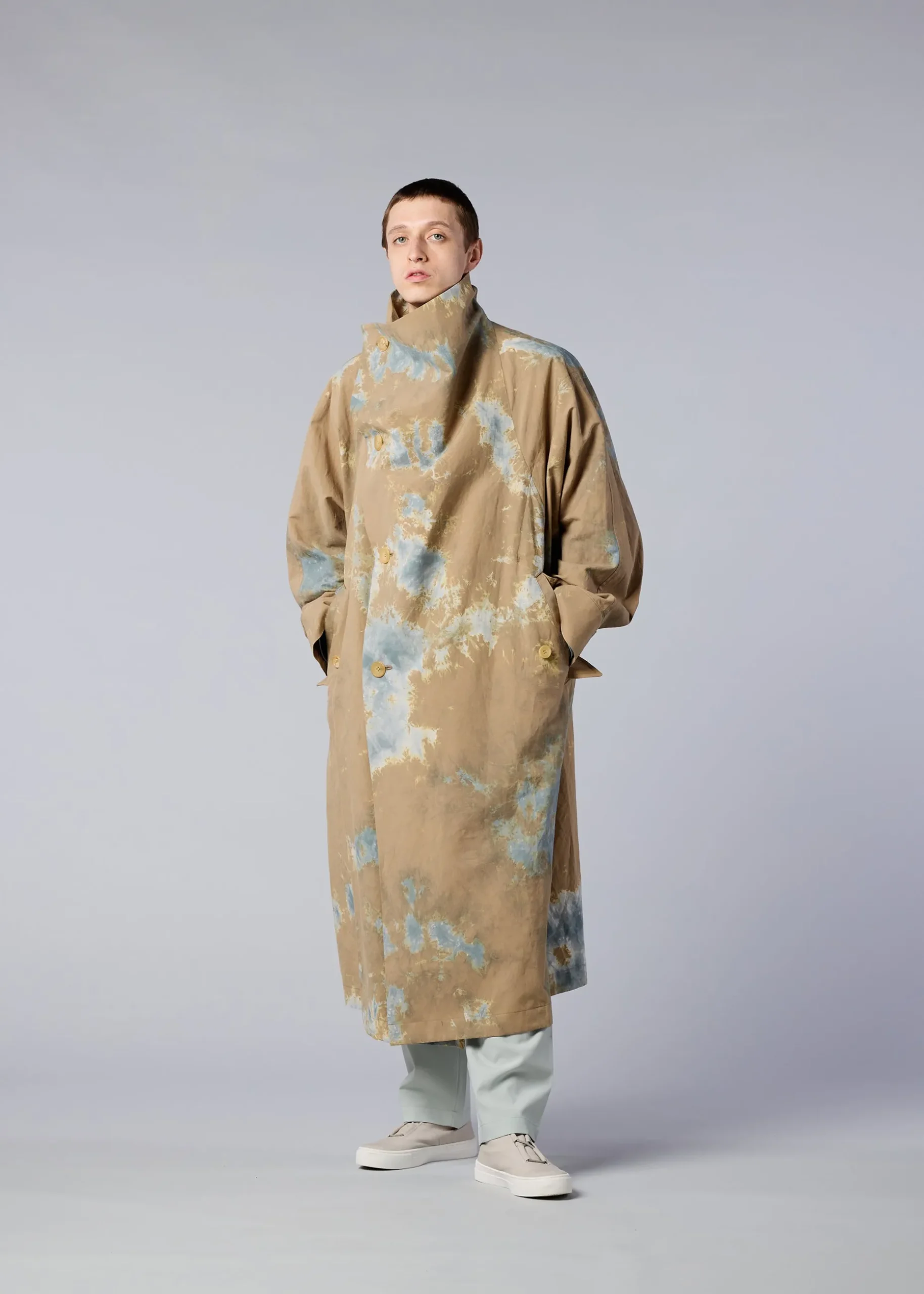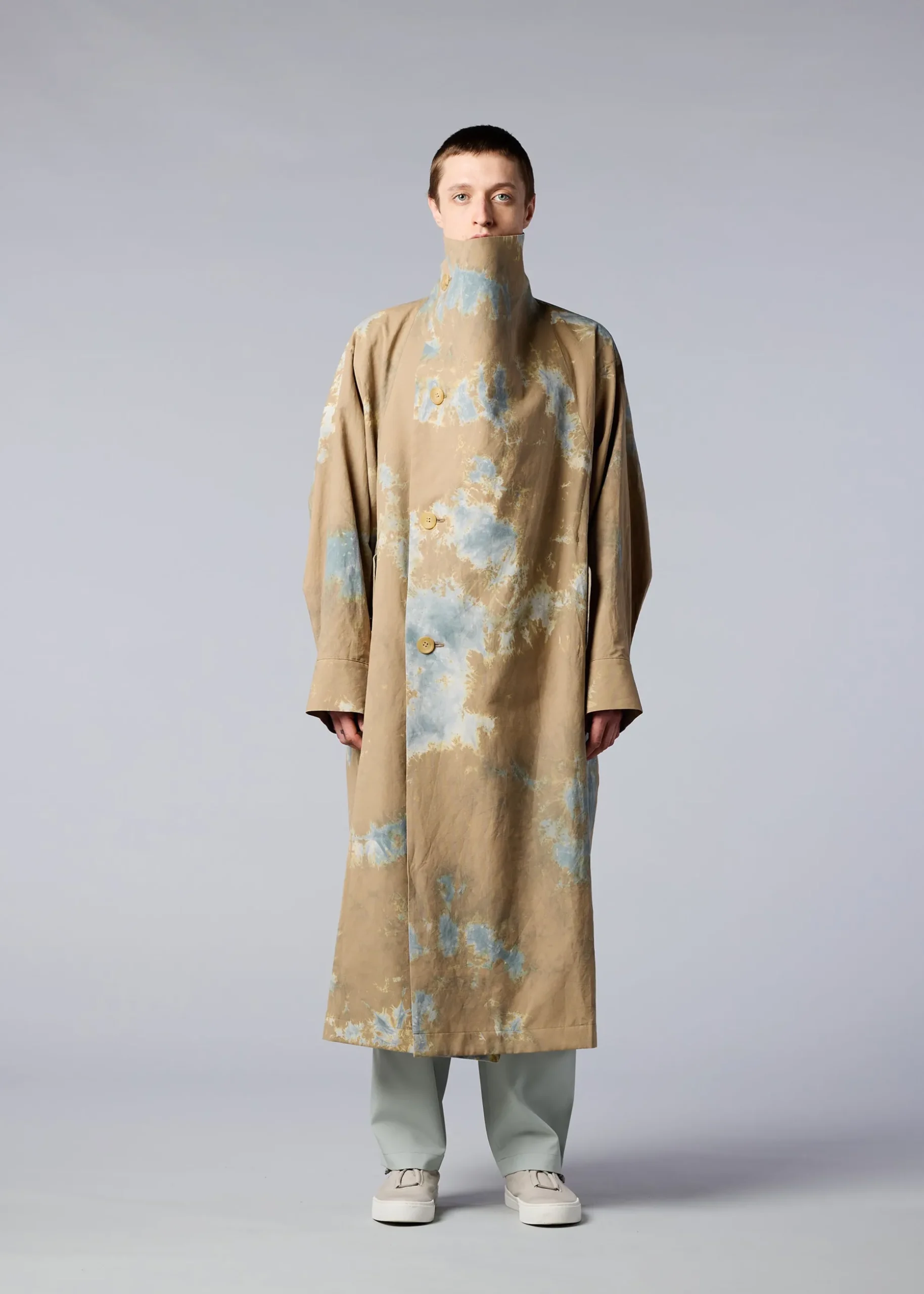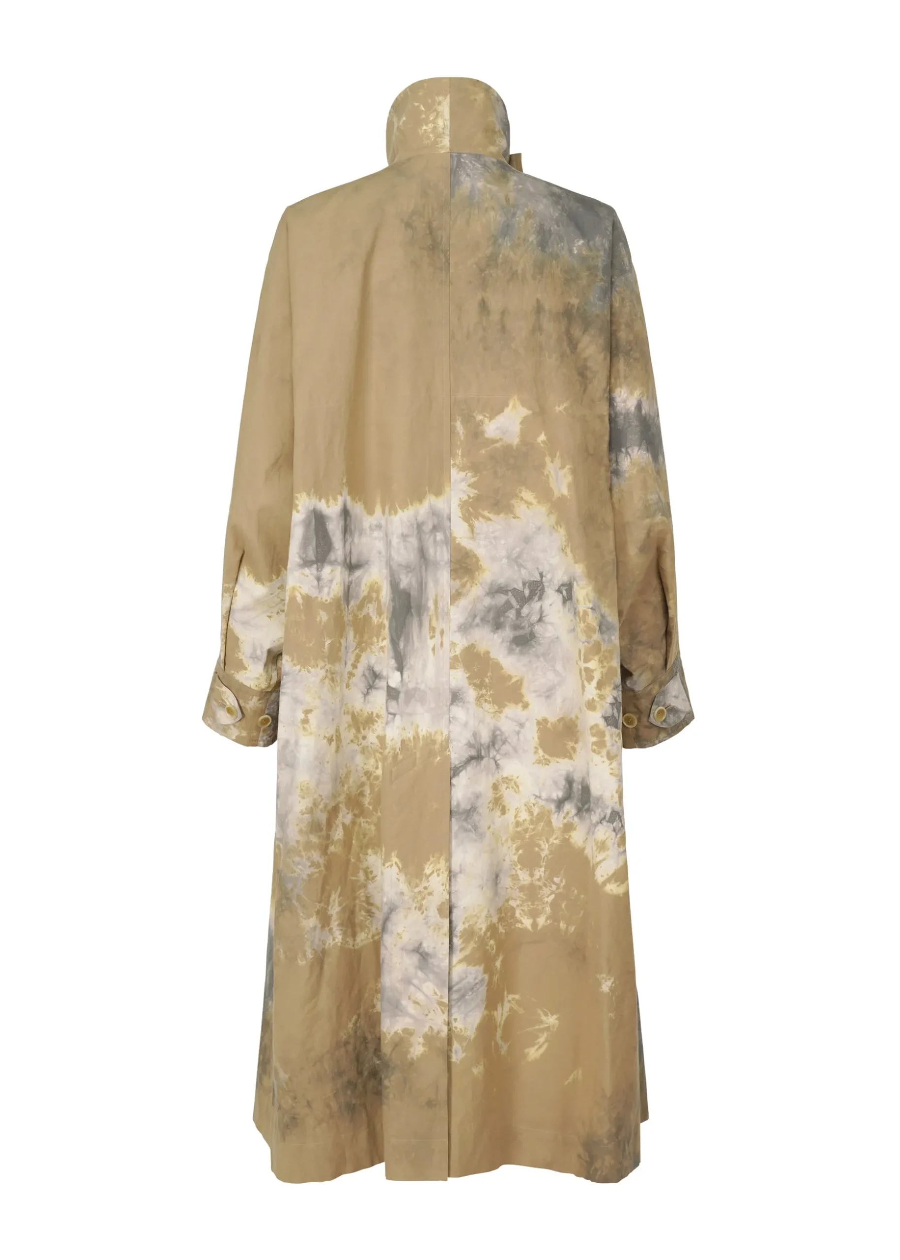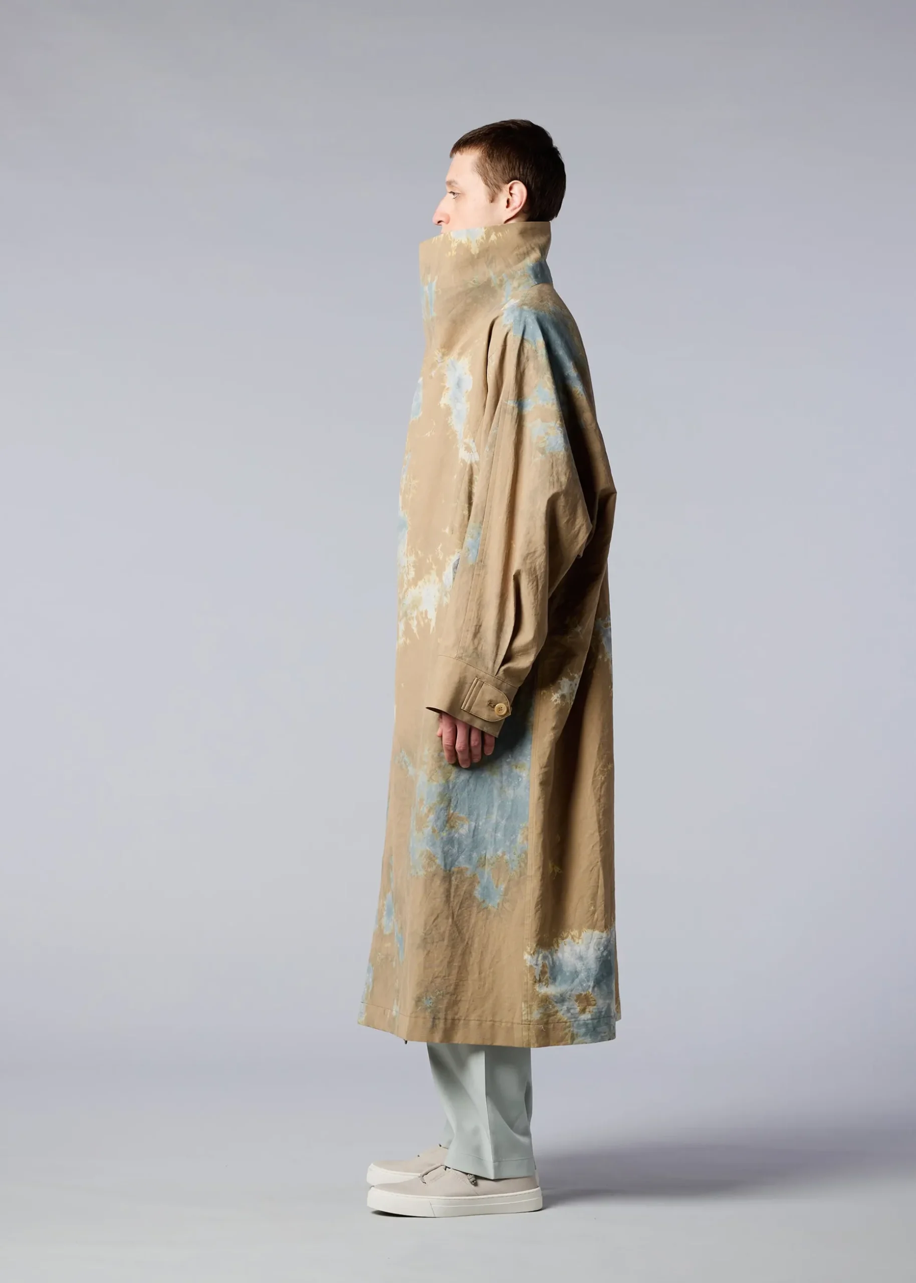 A coat featuring textiles made using discharge printing and dyeing techniques. A unique pattern is created by layering fabrics of the base color in a dynamic and complex manner and performing discharge printing and dyeing in this state. The pattern of this product is different one by one. Thank you for your understanding in advance.