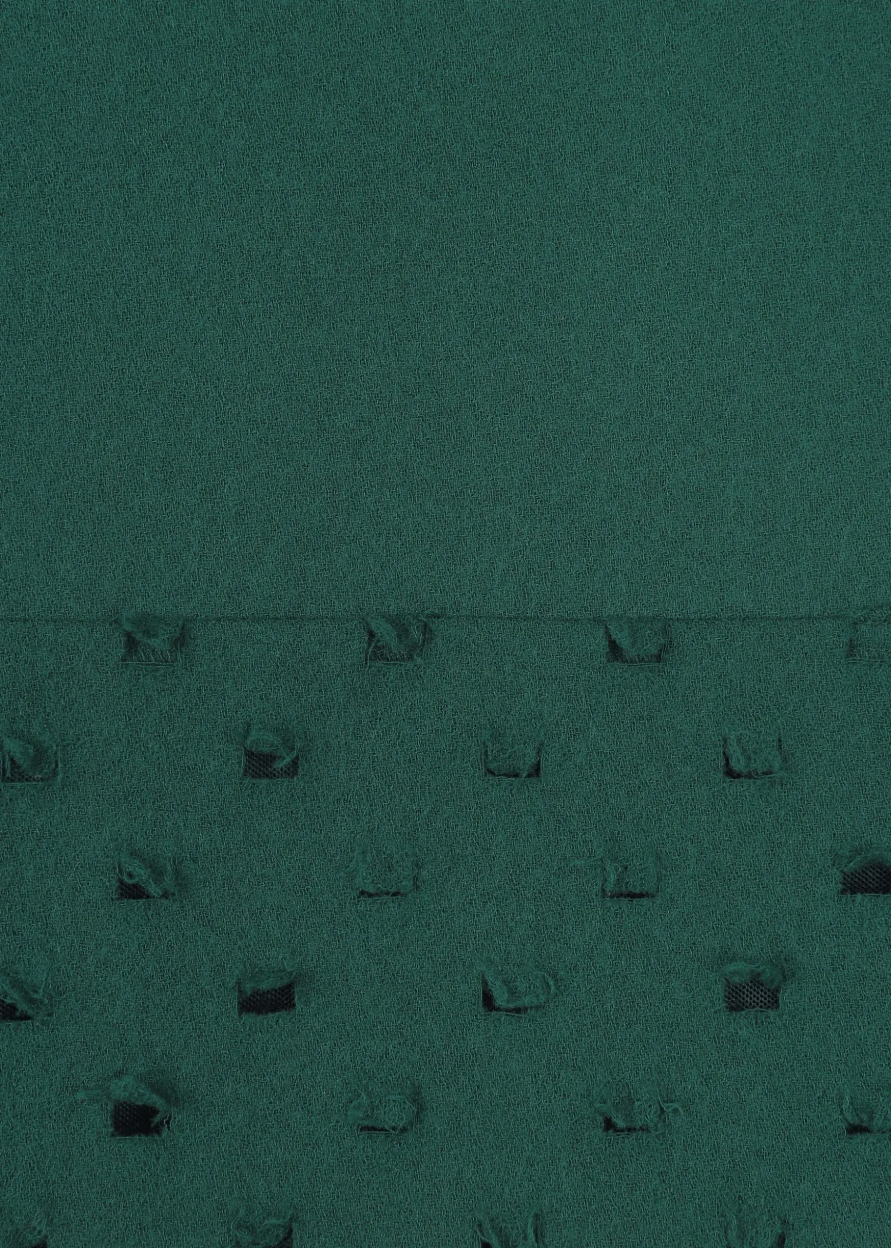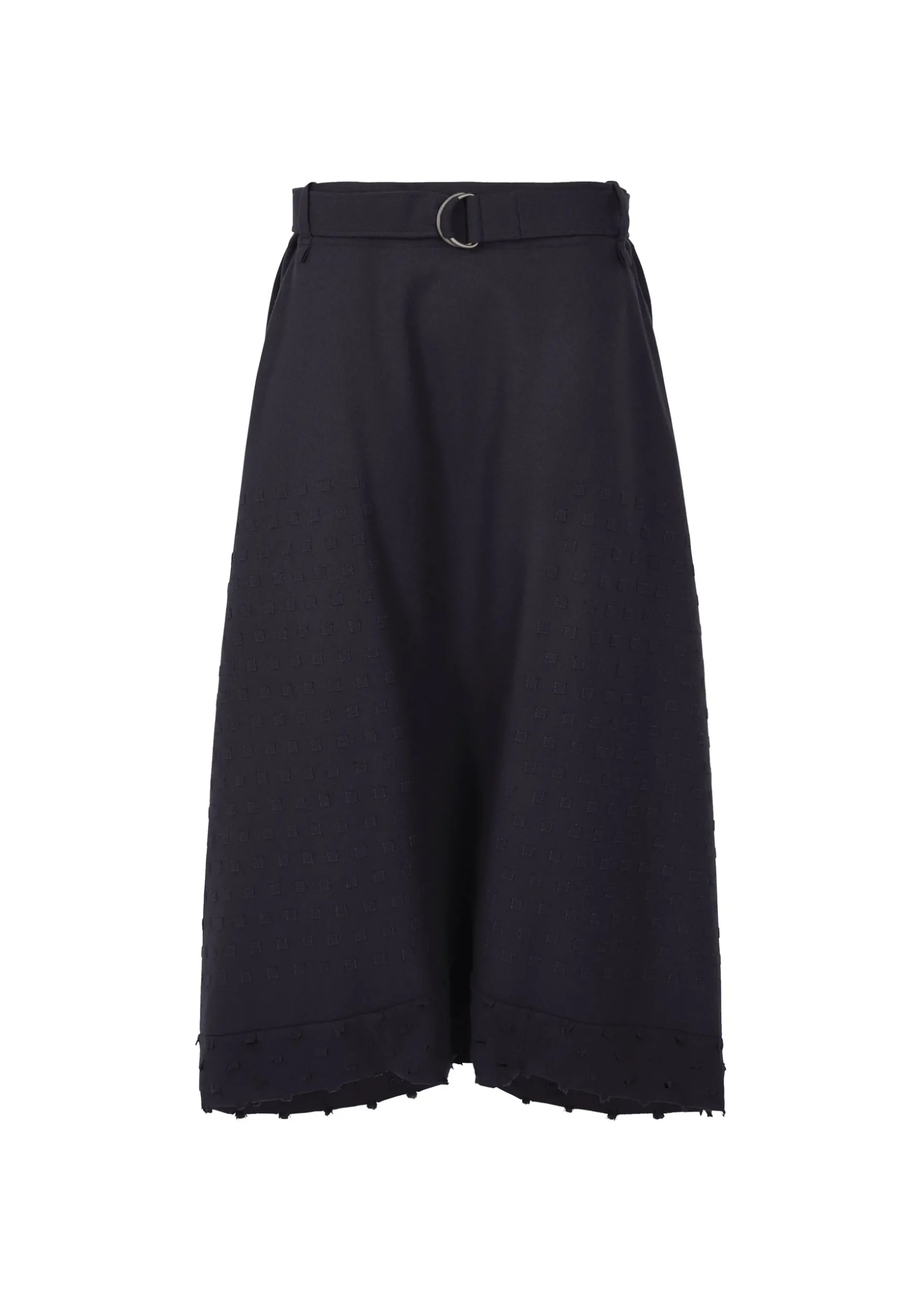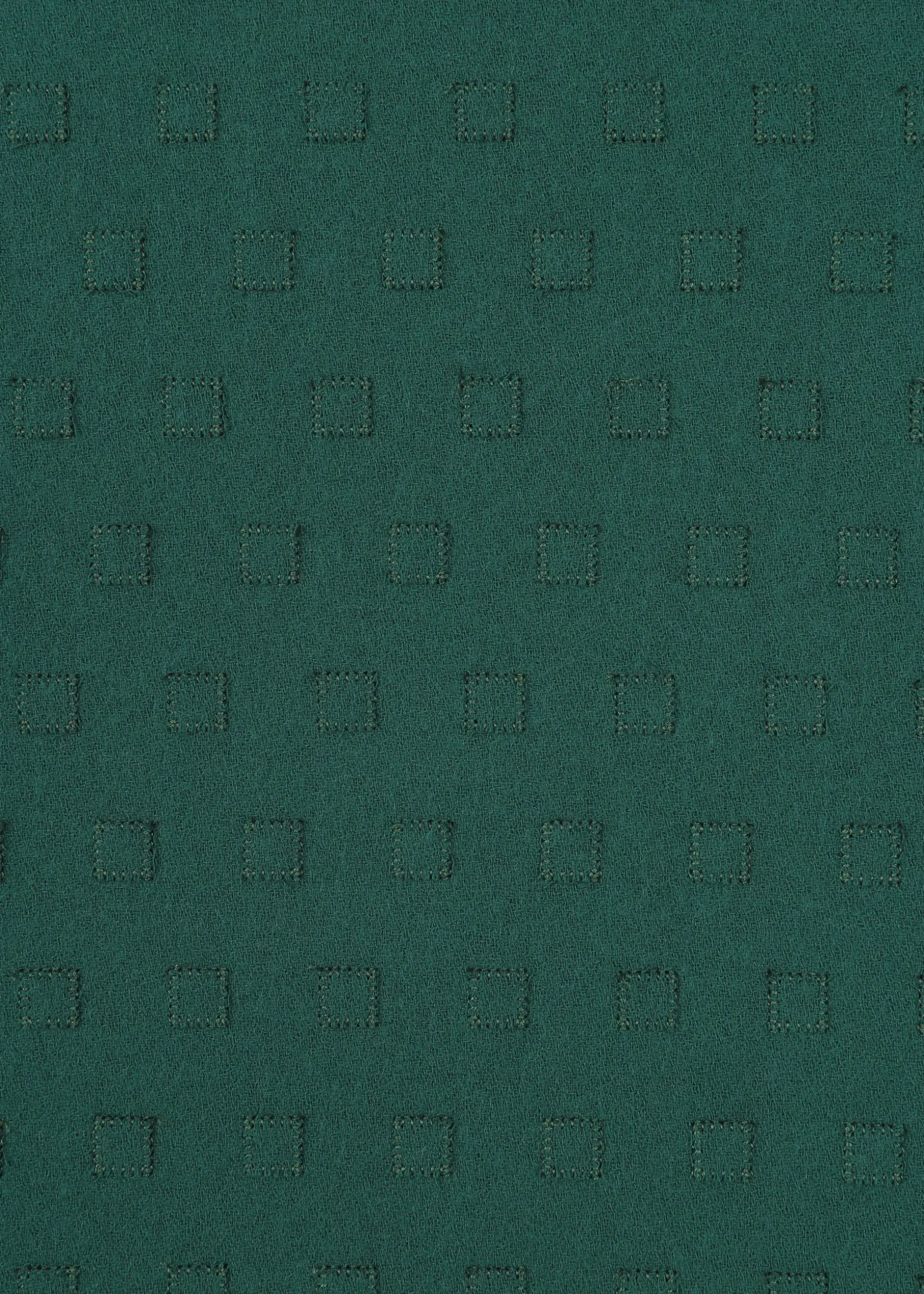 These pants are characterized by their smooth texture made from 100% high-quality wool. The design combines wool fabric that has been fulled and partially perforated using a special embroidery machine, with fabric embroidered with a three-dimensional square design.