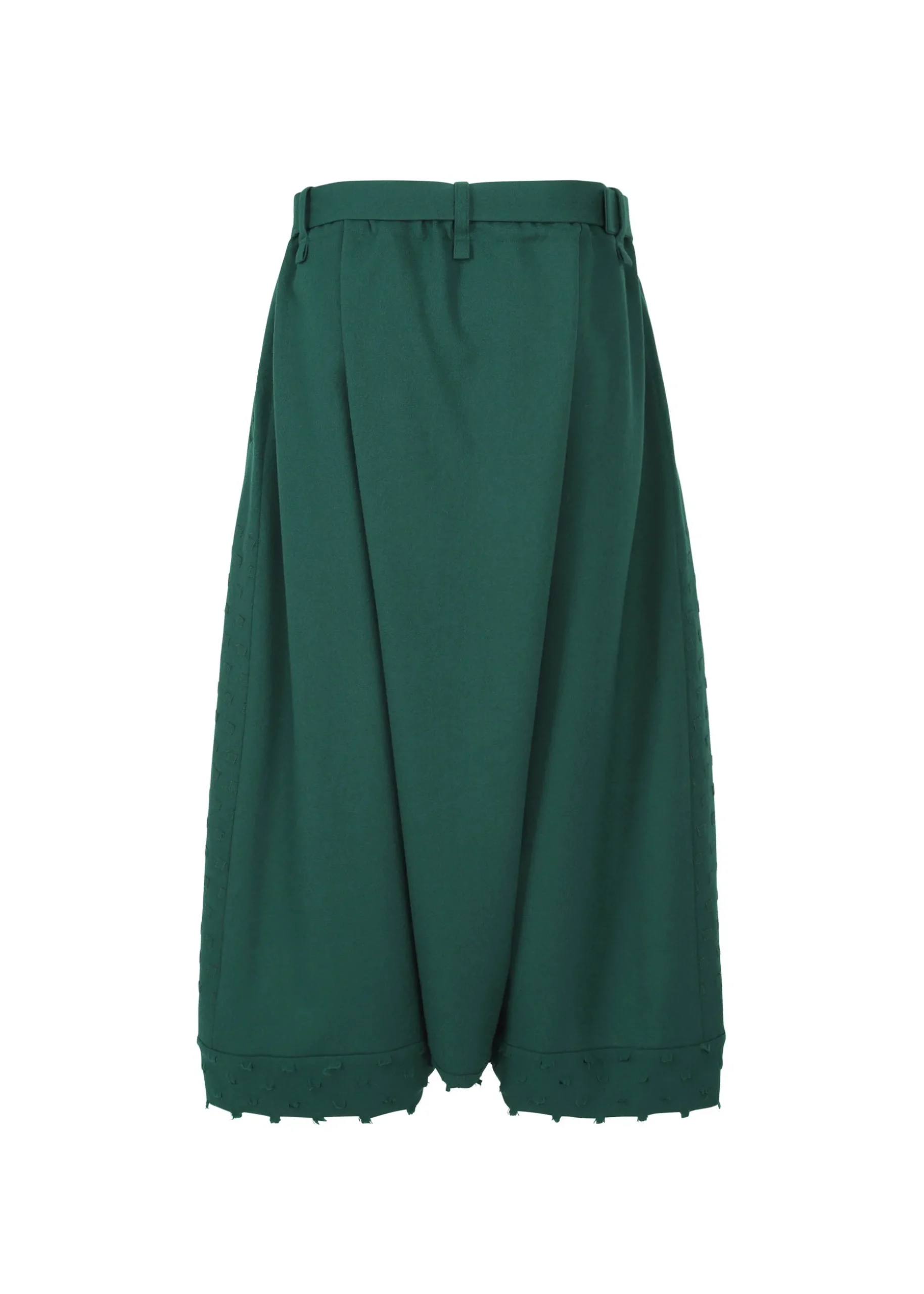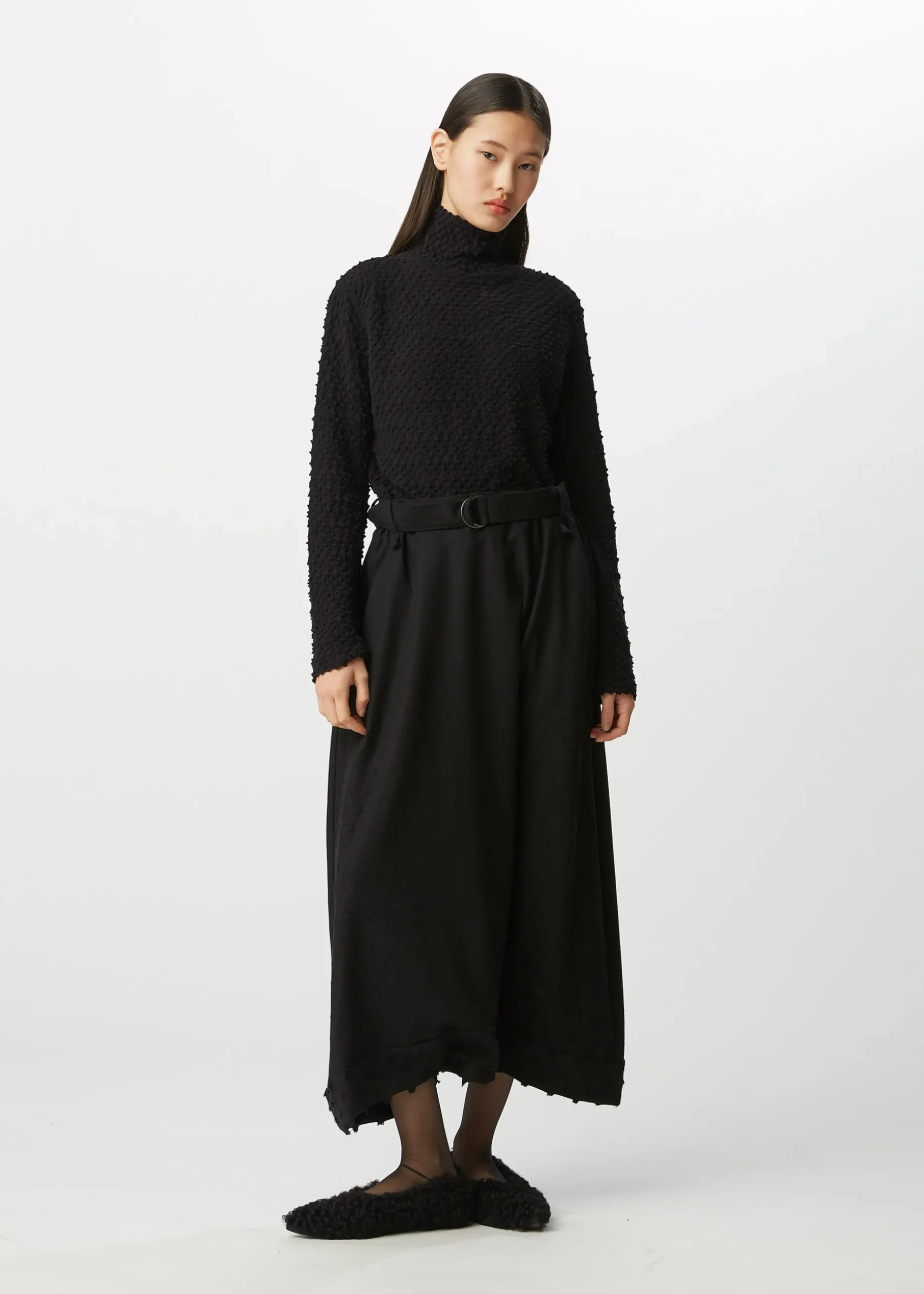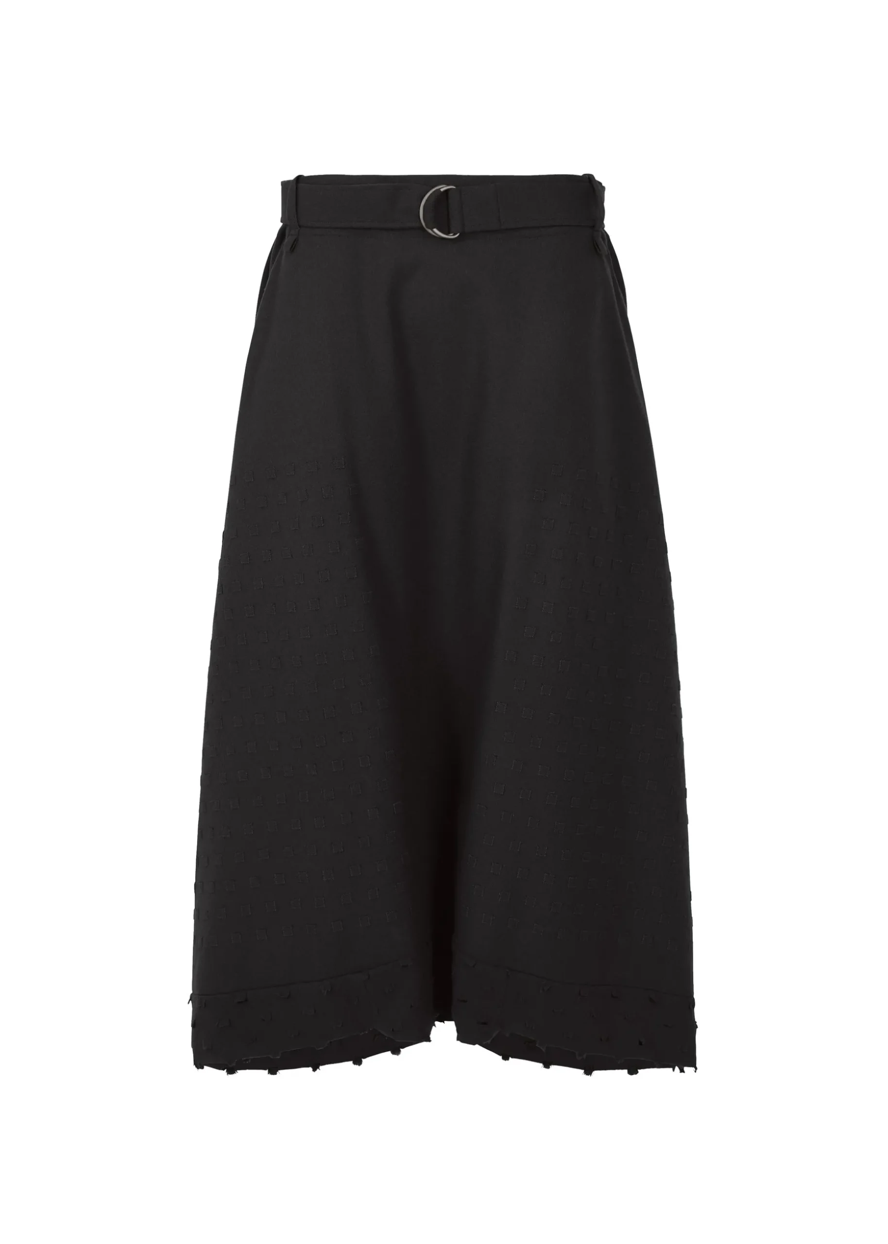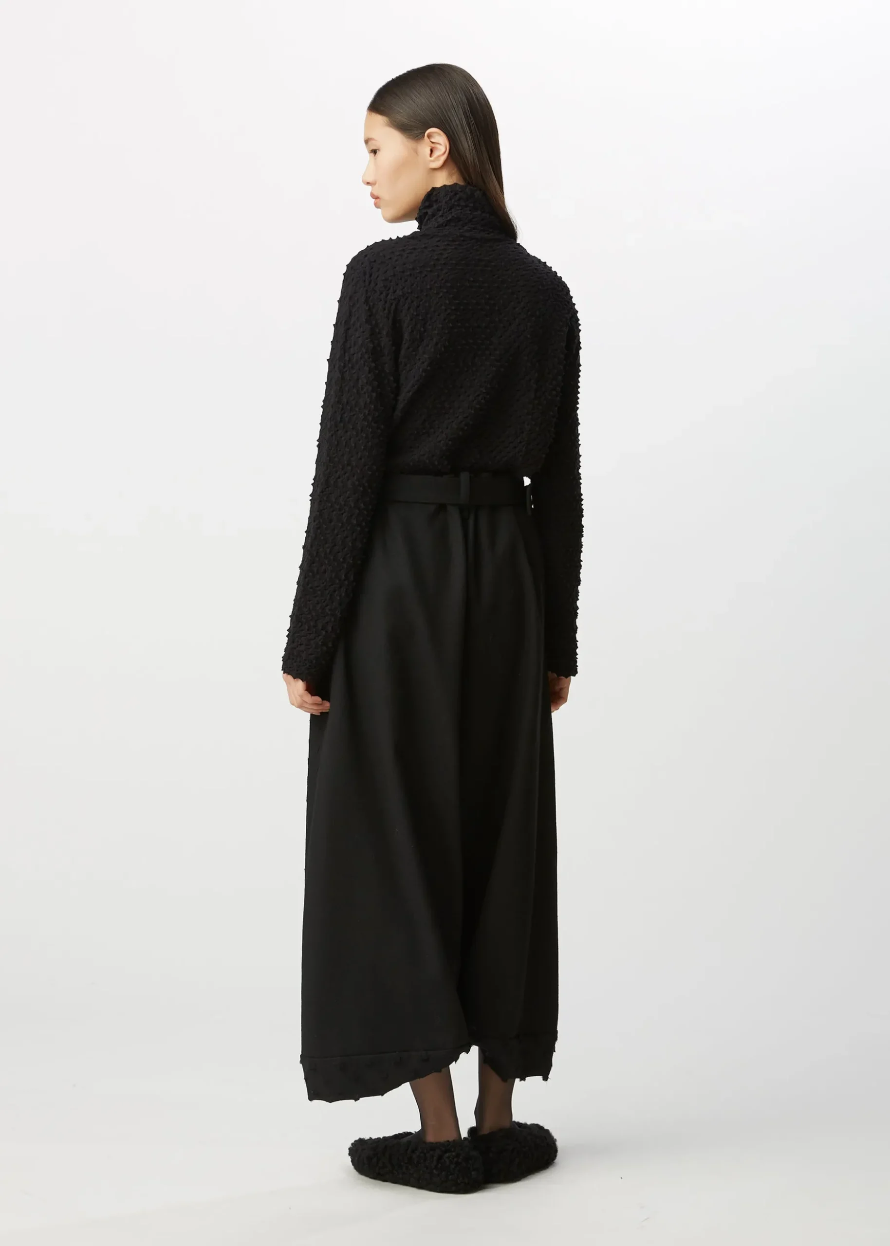 These pants are characterized by their smooth texture made from 100% high-quality wool. The design combines wool fabric that has been fulled and partially perforated using a special embroidery machine, with fabric embroidered with a three-dimensional square design.