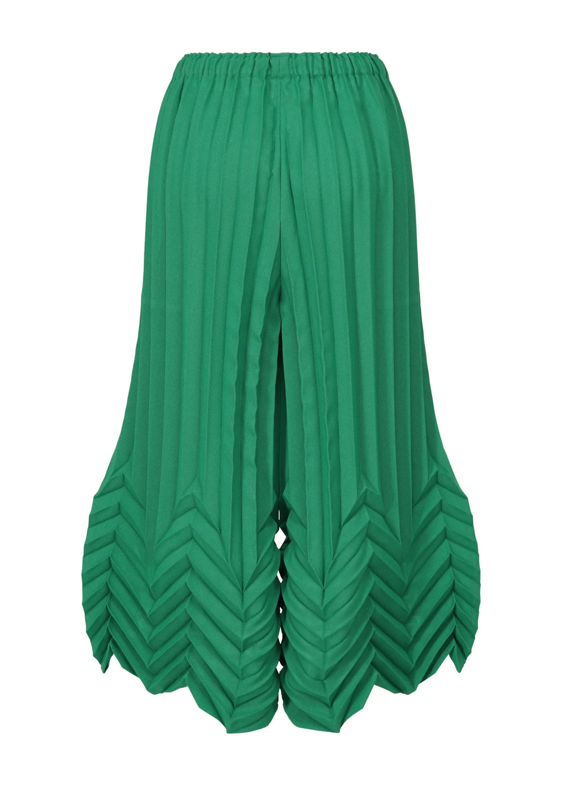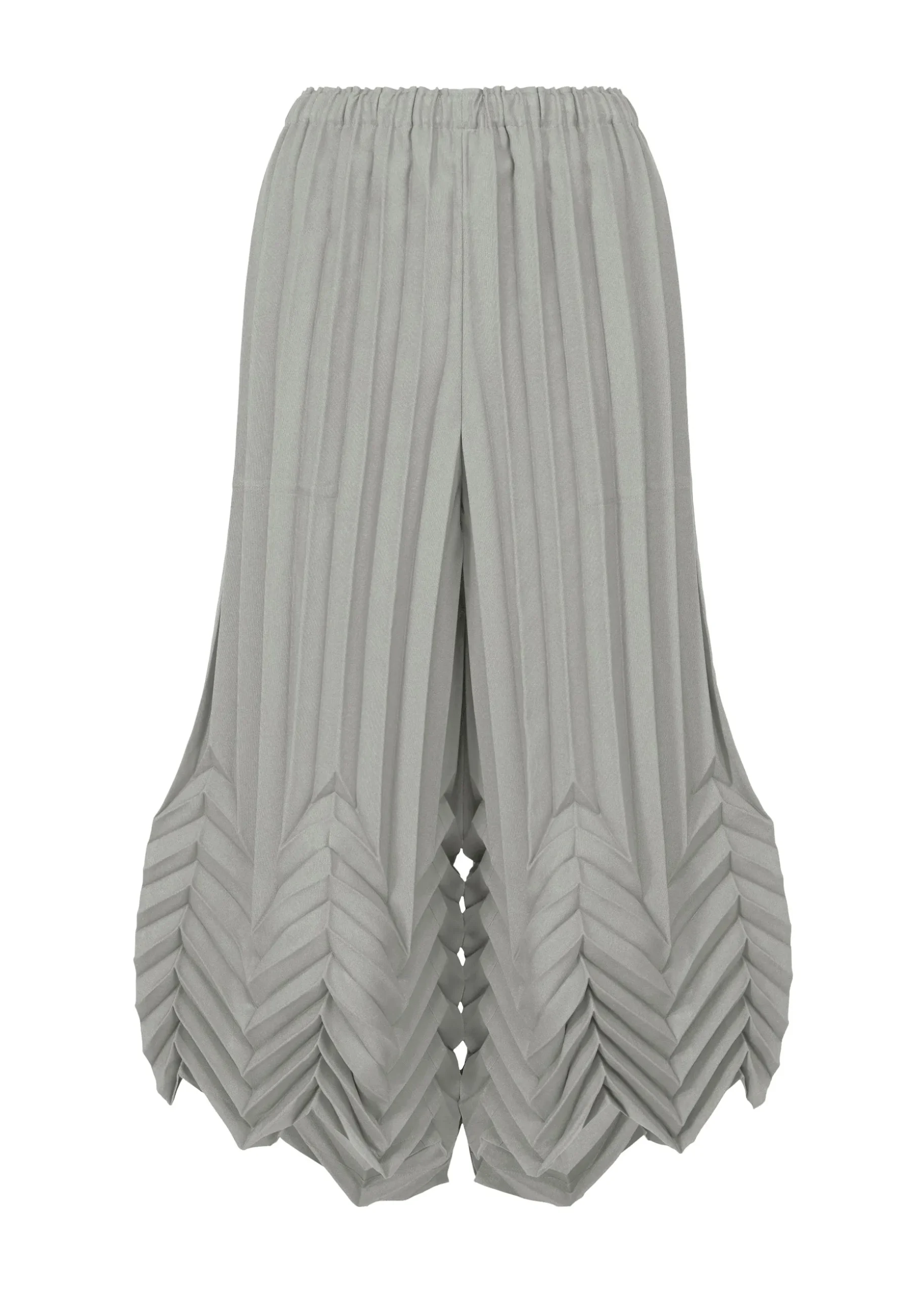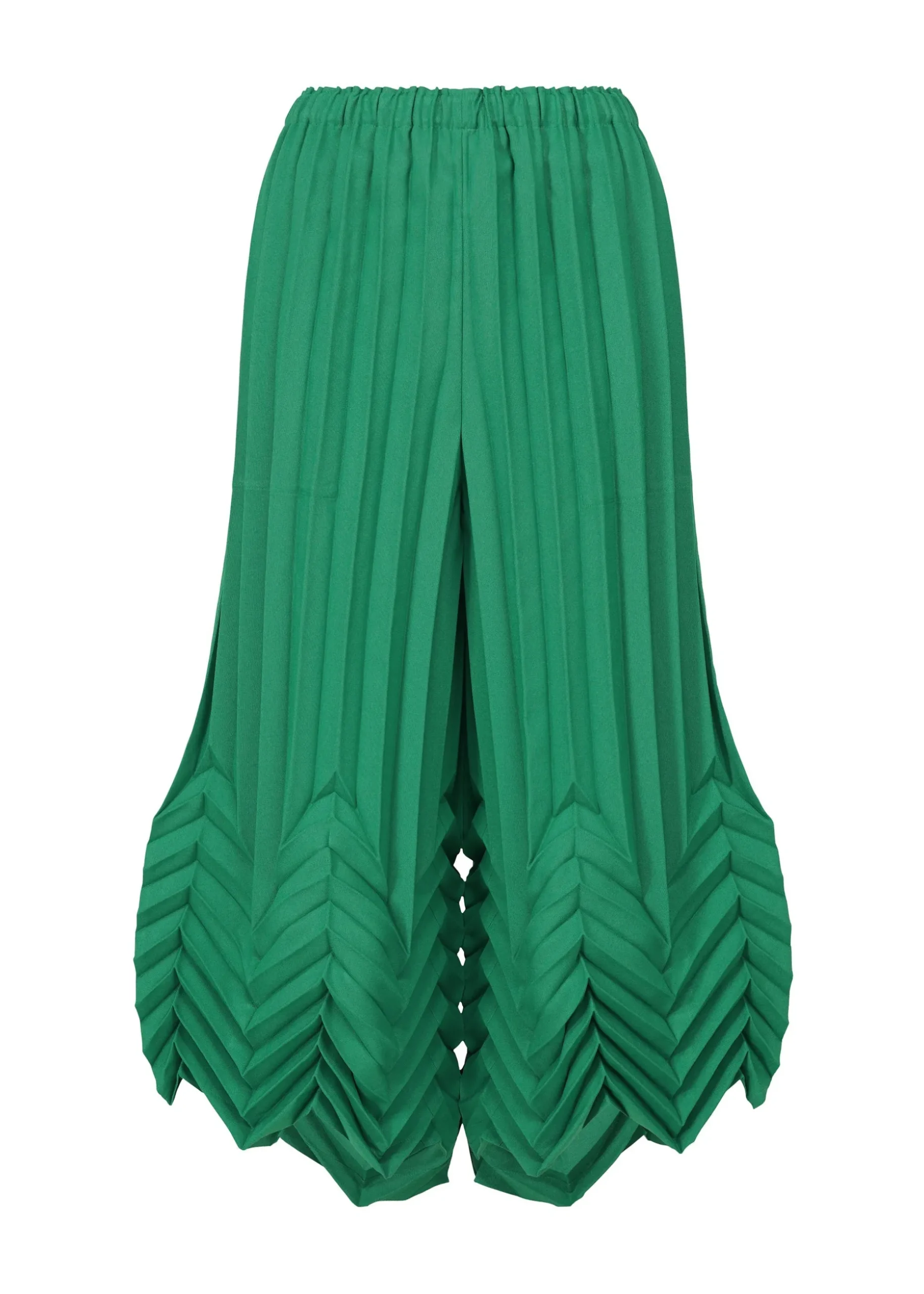 The pleats on the hem give these wide pants a fun shape that resembles a star when folded. The lightweight material and elastic waist make this item comfortable to wear. There are pockets on both sides.