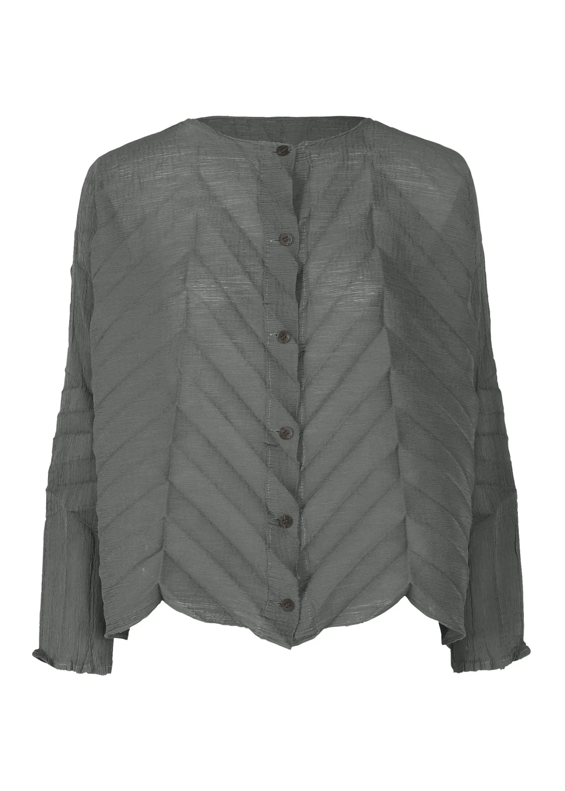 A see-through crepe long-sleeved cardigan made of fabric with strong twist yarn woven into the weft yarn and dyed. During the dyeing process, the weft threads are untwisted, creating a vertical grain, creating the unique look of yoryu. This is a fun item that takes on a star-like form when folded along the pleats due to the hand pleats applied after the product is dyed.