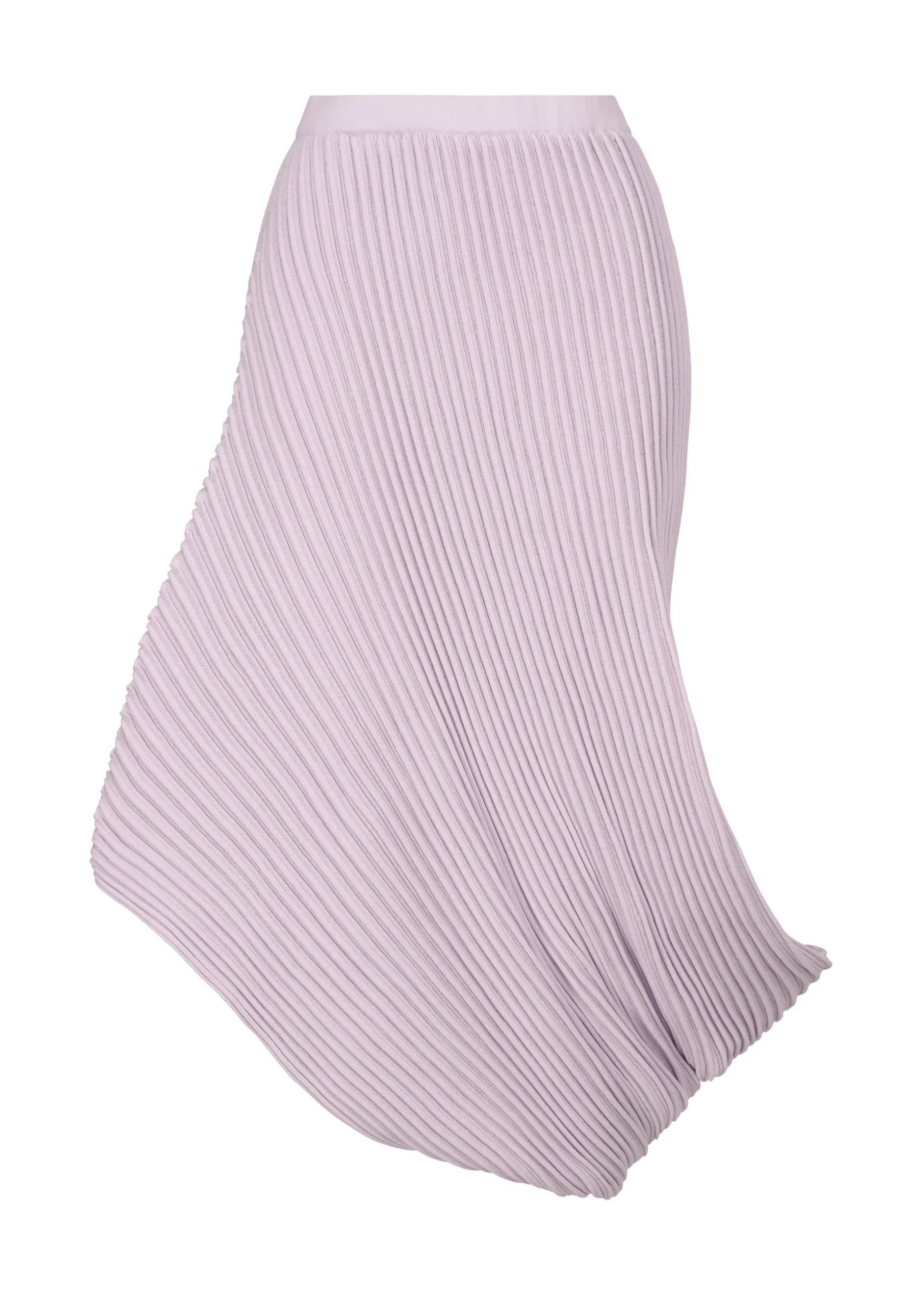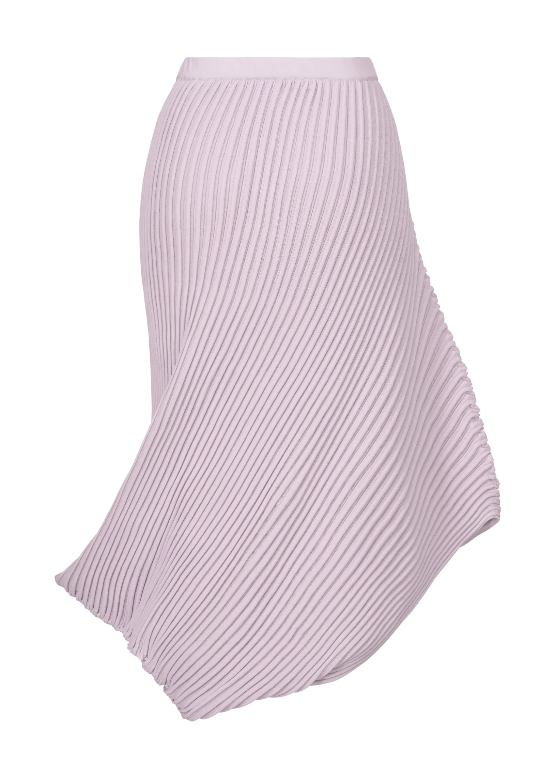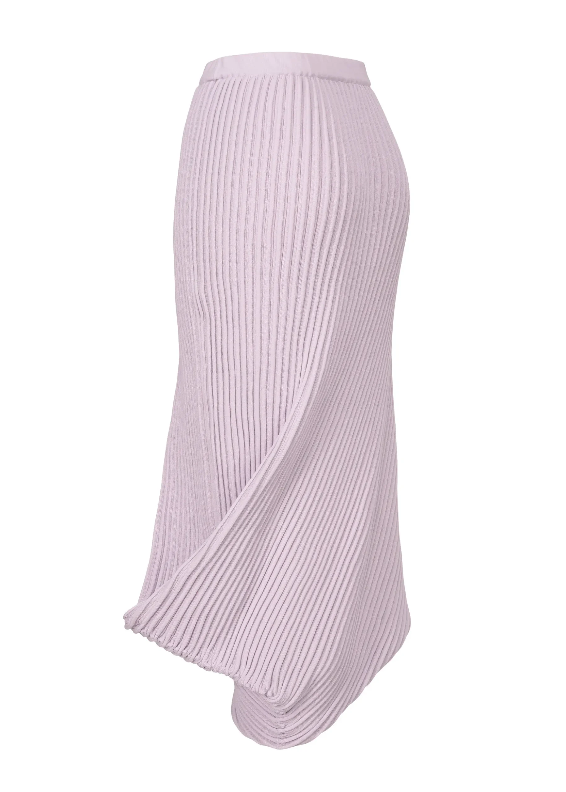 A seamless knit skirt that uses garter fabric to express the relaxed flow of water. Using recycled polyester yarn and high-twist cotton yarn, the pattern is woven in a curved manner, with the corners turned inward, creating an organic, flowing curve.