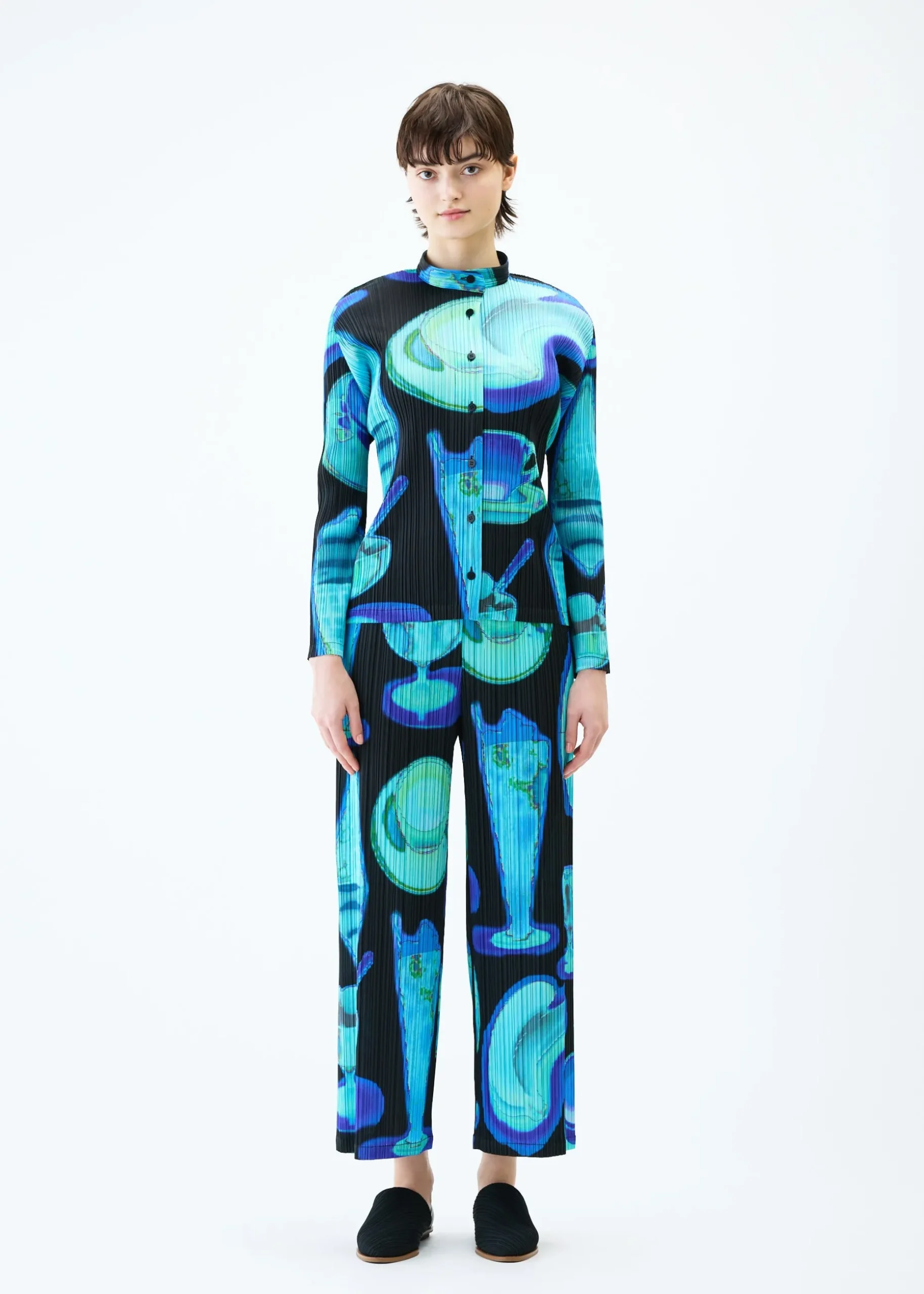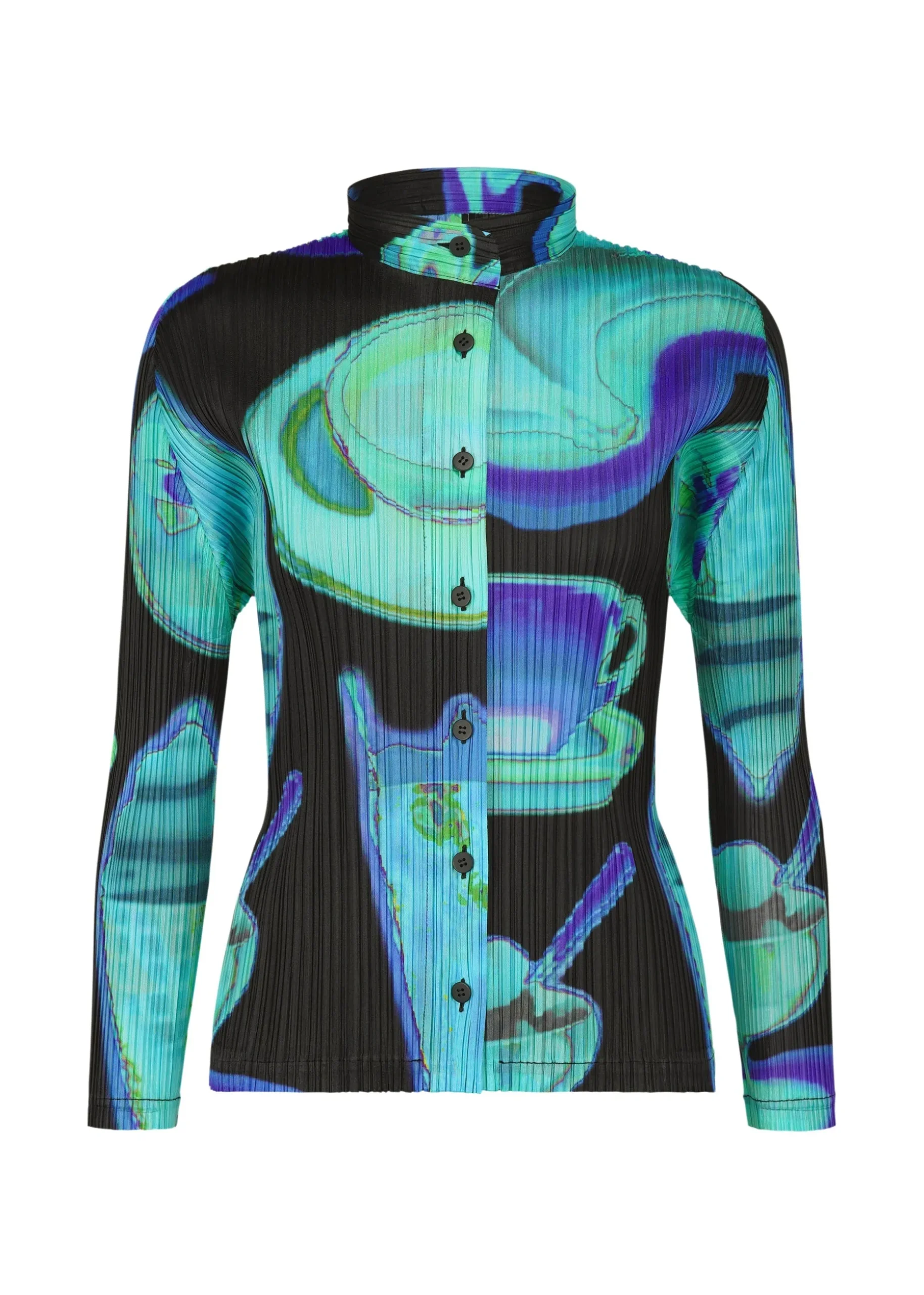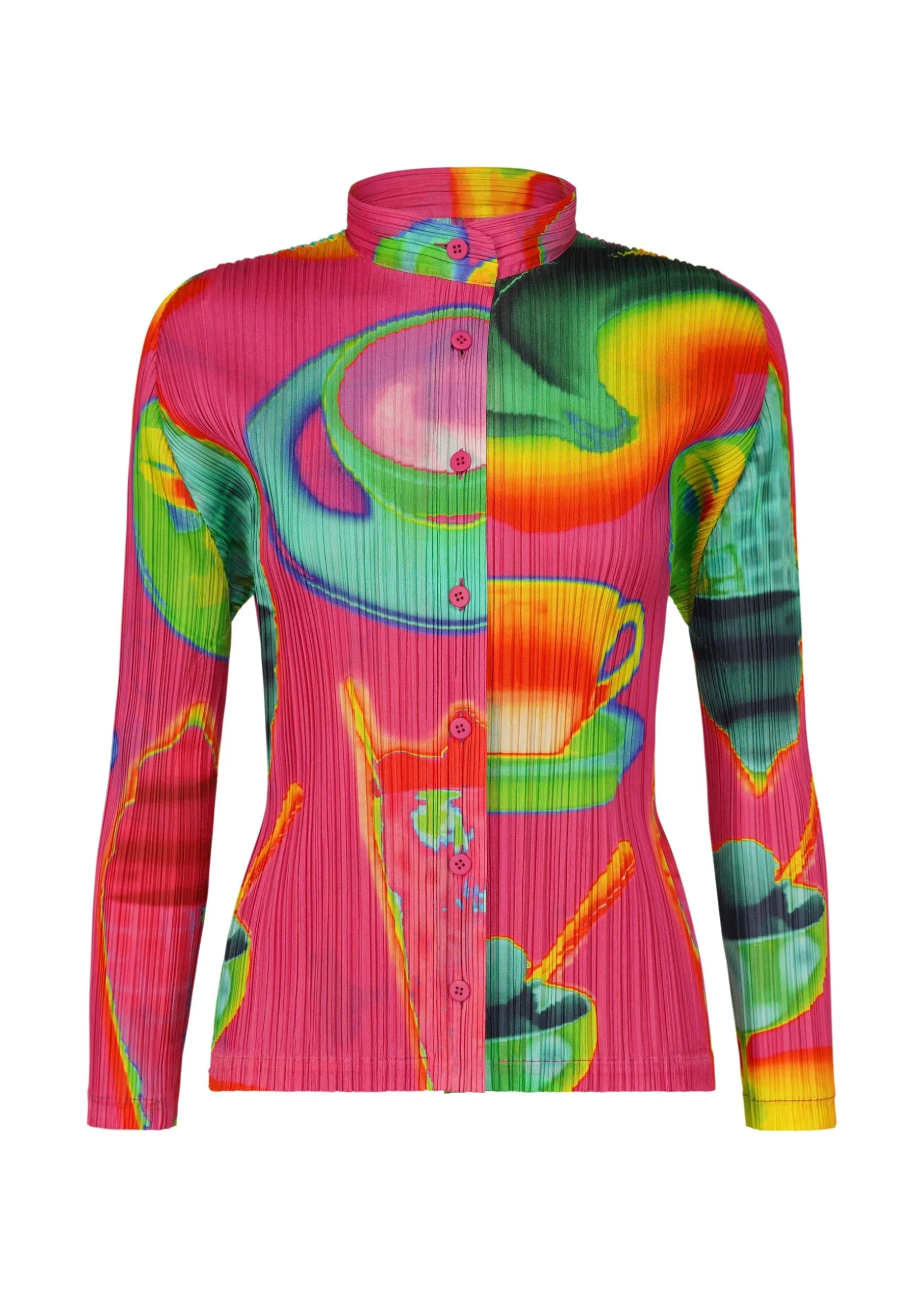 This long-sleeved shirt with a standing collar has a print featuring the temperature differences of various items captured with an infrared thermographic camera, including soft serve ice cream, bananas, and hot coffee. It is available in two color options: Pink which looks as if the motifs are heated, and Black which looks as if they are cooled.