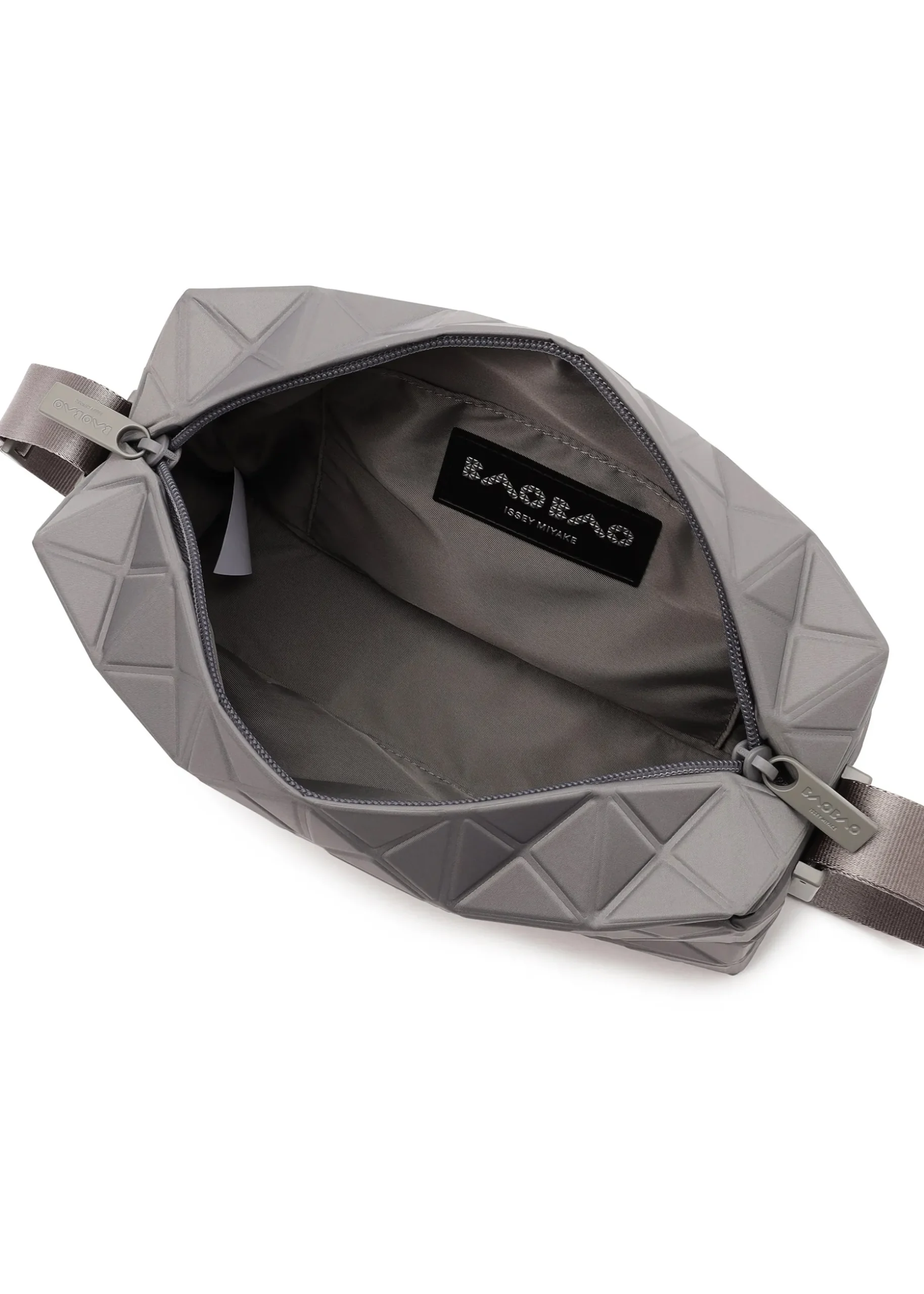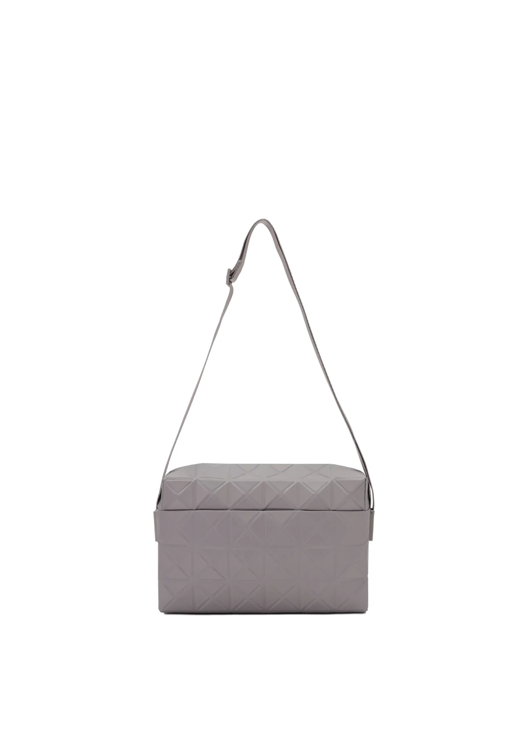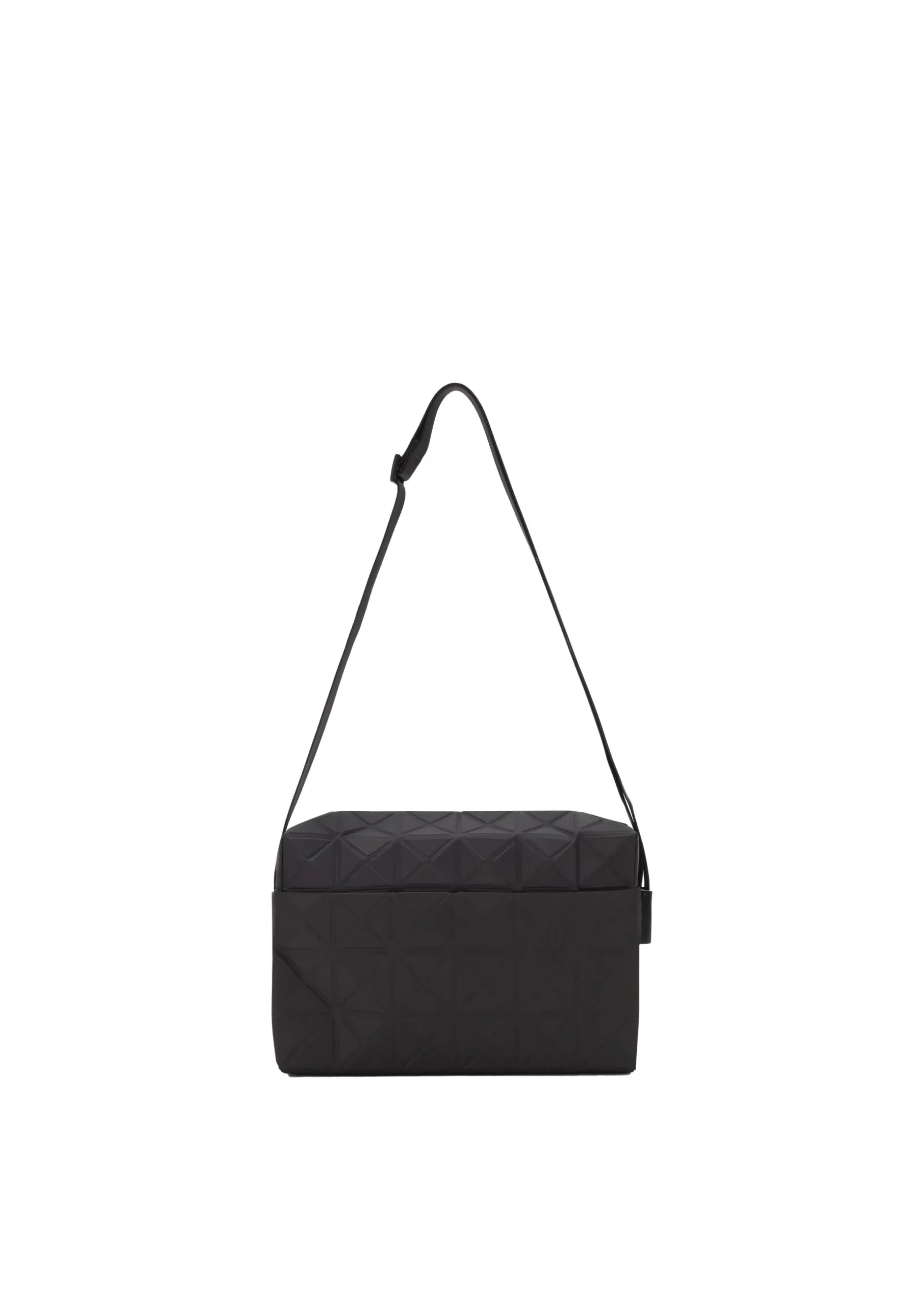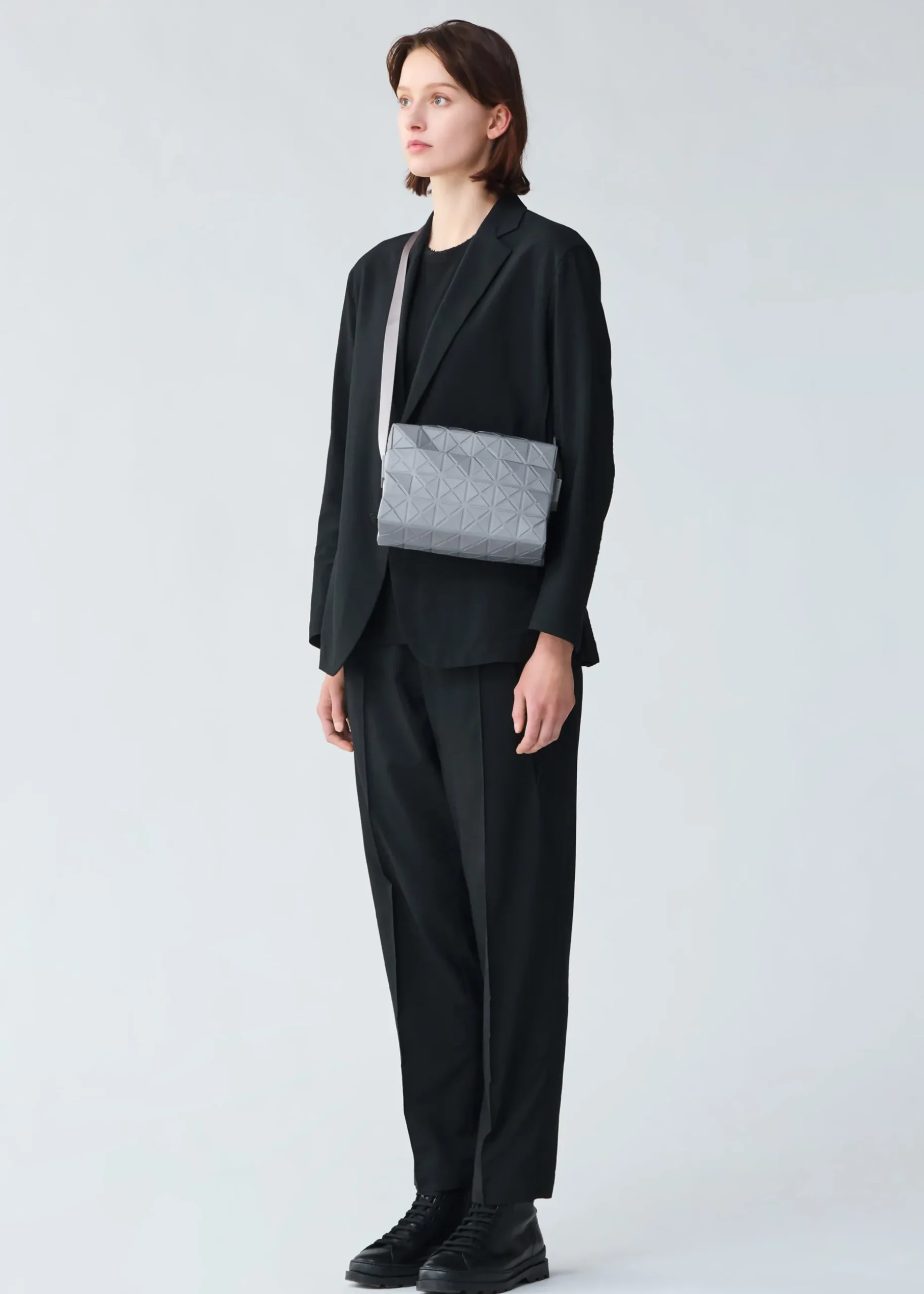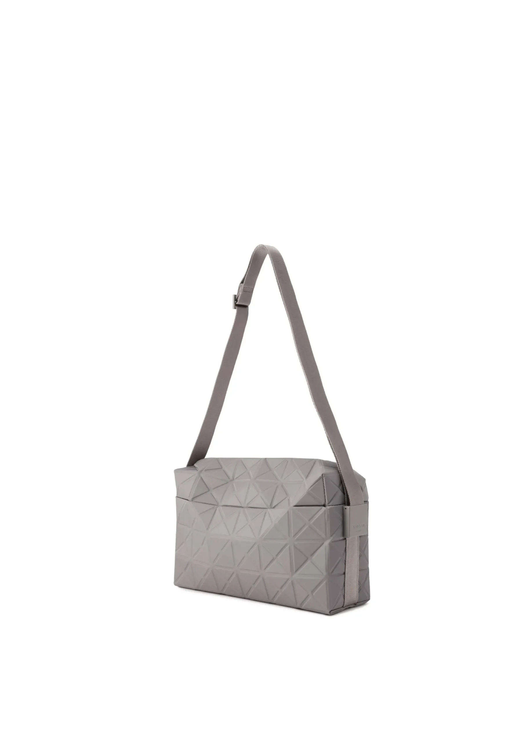 This TRACK series shoulder bag further embodies the charm of the triangular units that symbolize the brand and Issey Miyake’s fundamental “a piece of cloth” concept. By encapsulating the brand’s characteristic isosceles triangle units in the fabric, the bag’s shape is created through structural movement, and you can enjoy its impressive look as it goes from flat to three-dimensional. The bag pursues functionality with its minimalist parts in one color tone and thick nylon handles. It combines low-key beauty with durability through its use of subtly glossy, flexible fabric and resin parts to prevent scratching at the corners.
