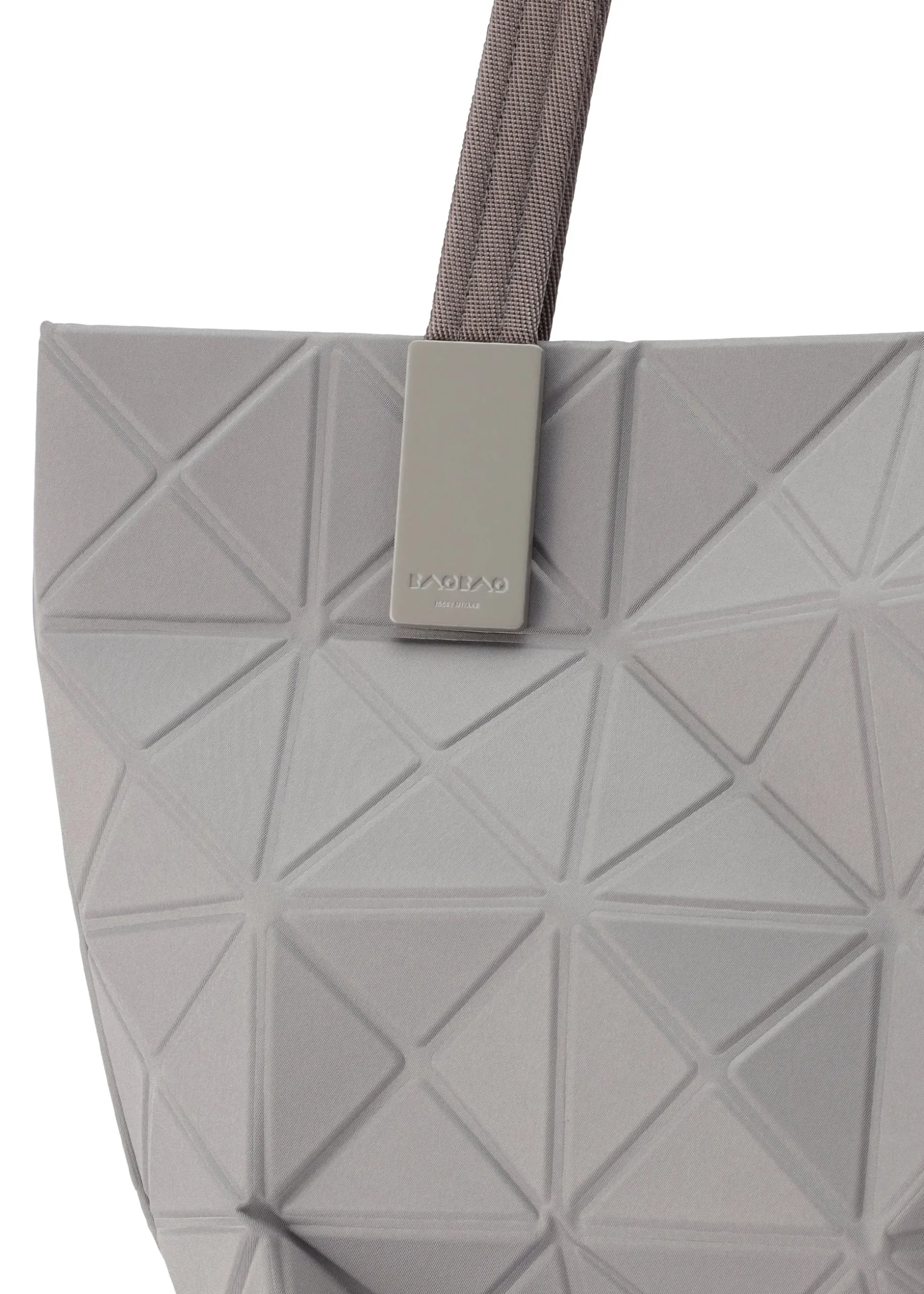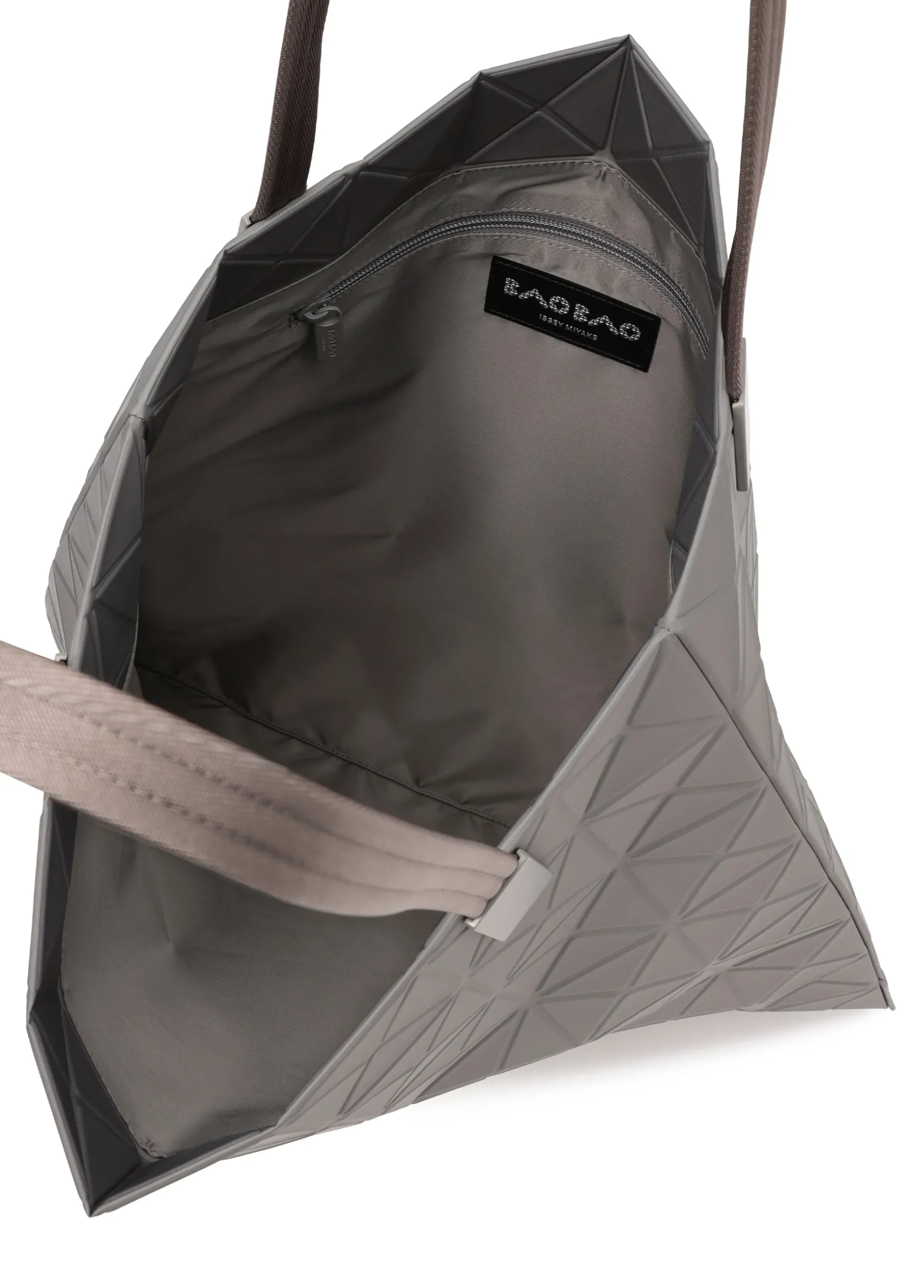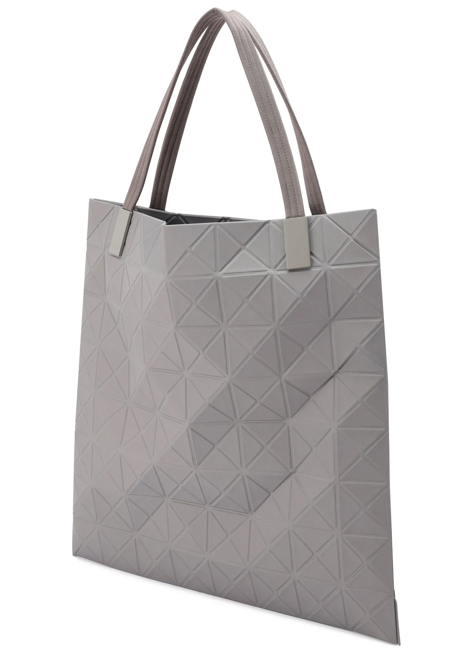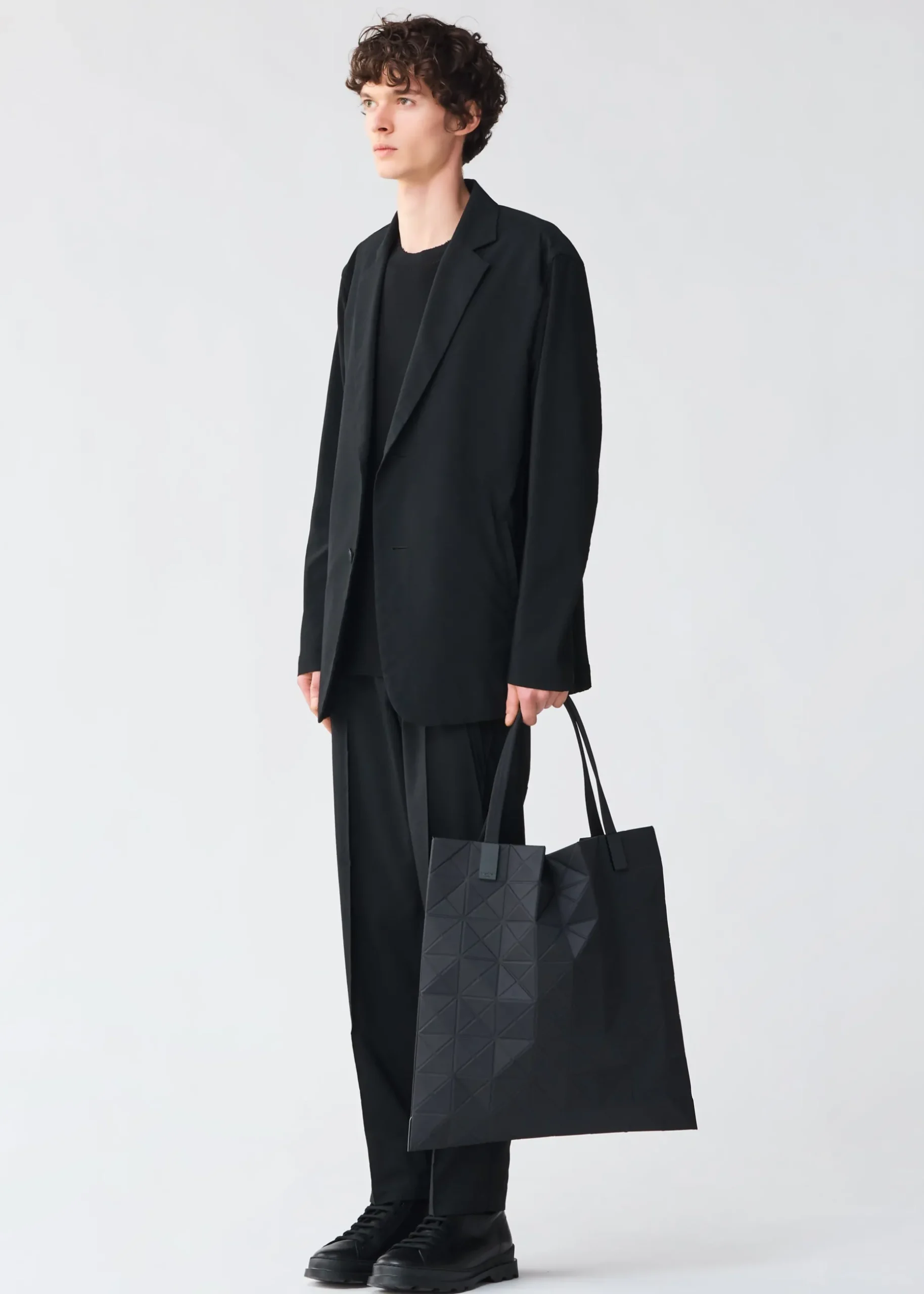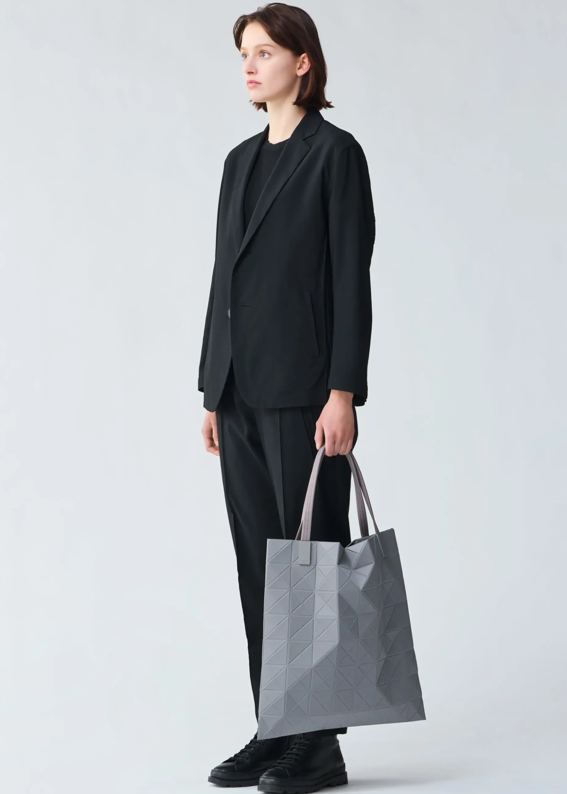 This TRACK series large tote bag further embodies the charm of the triangular units that symbolize the brand and Issey Miyake’s fundamental “a piece of cloth” concept. By encapsulating the brand’s characteristic isosceles triangle units in the fabric, the bag’s shape is created through structural movement, and you can enjoy its impressive look as it goes from flat to three-dimensional. The bag pursues functionality with its minimalist parts in one color tone and thick nylon handles. It combines low-key beauty with durability through its use of subtly glossy, flexible fabric and resin parts to prevent scratching at the corners. Its size allows it to hold a 15-inch laptop.