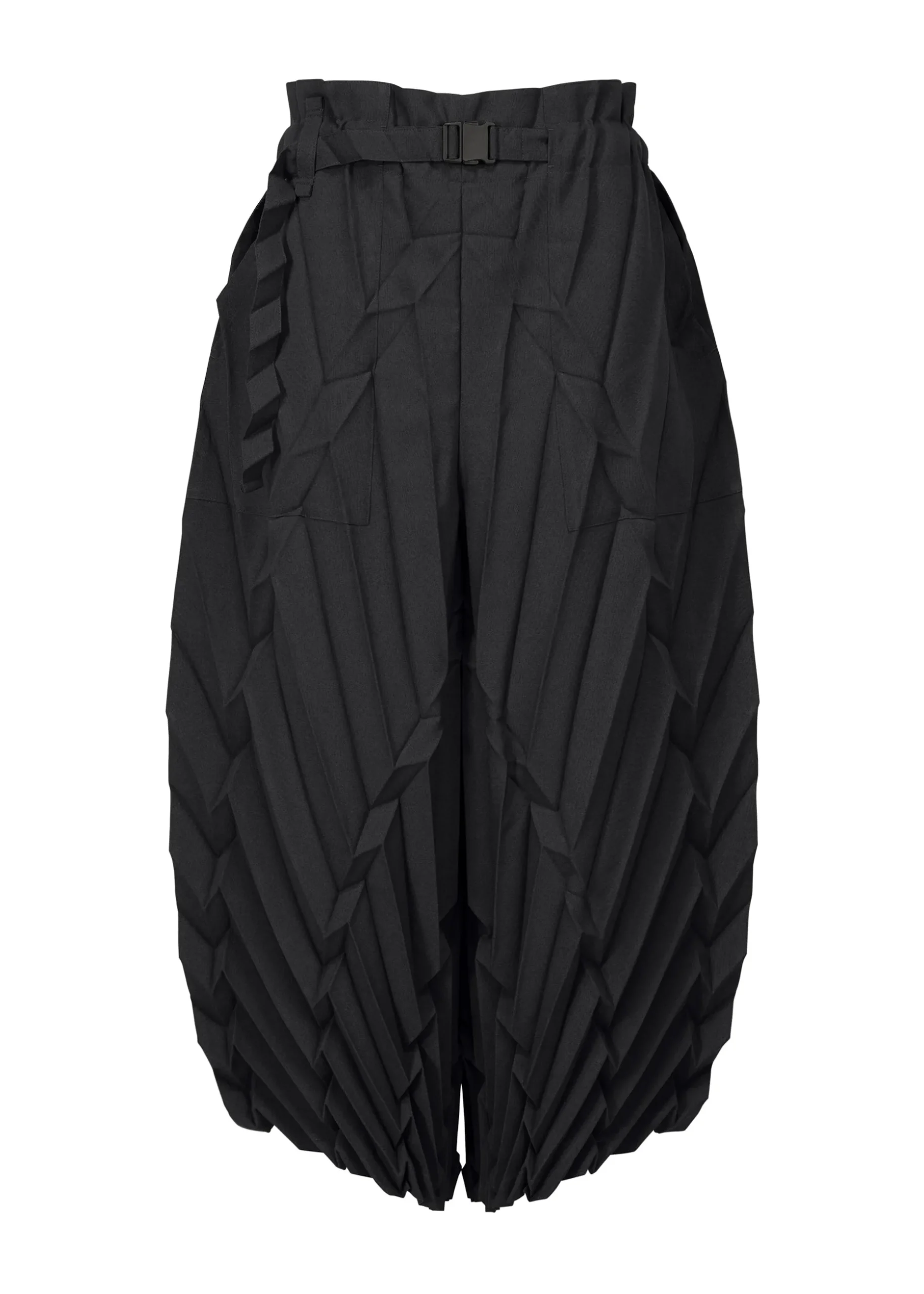 These eye-catching wide pants feature flowing pleats inspired by plant leaf veins. The functional design allows the pants to be folded compactly along the pleats, and creates a three-dimensional silhouette when worn. There are pockets on both sides.