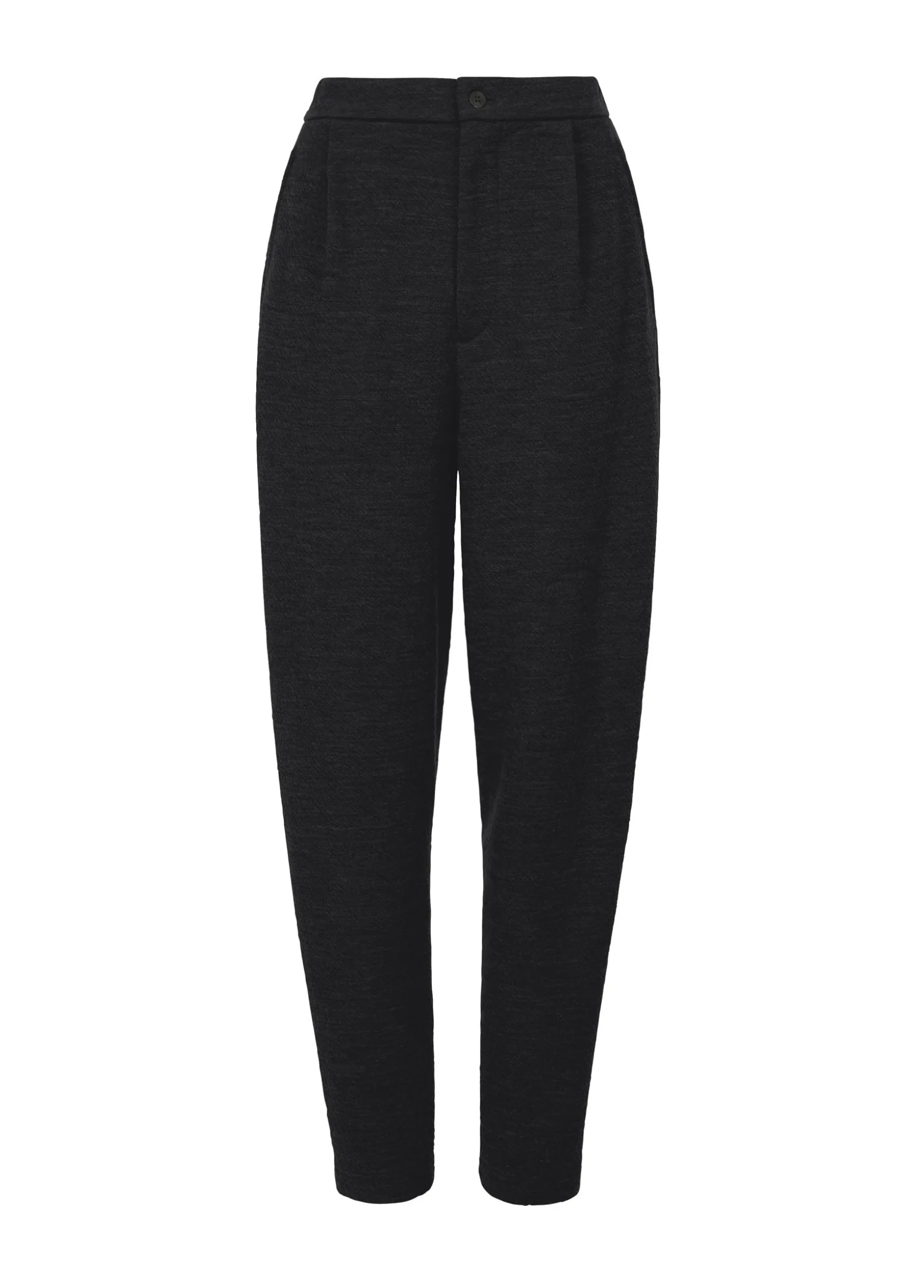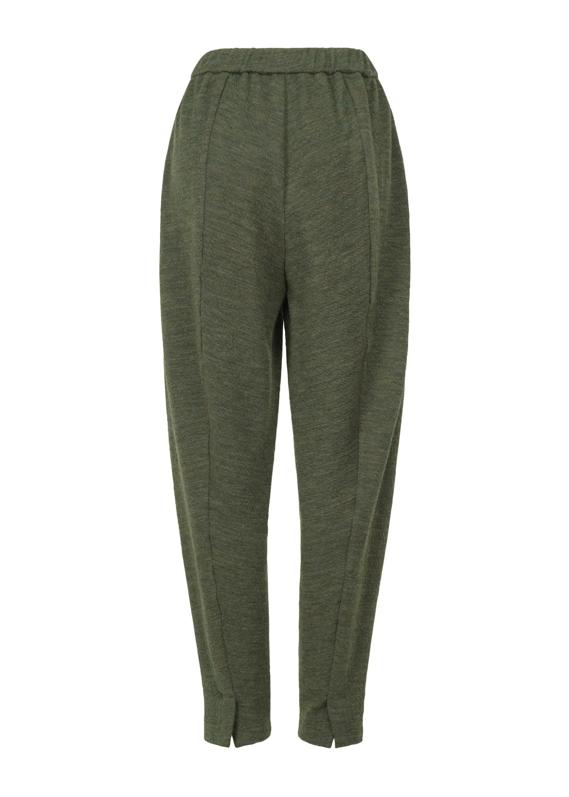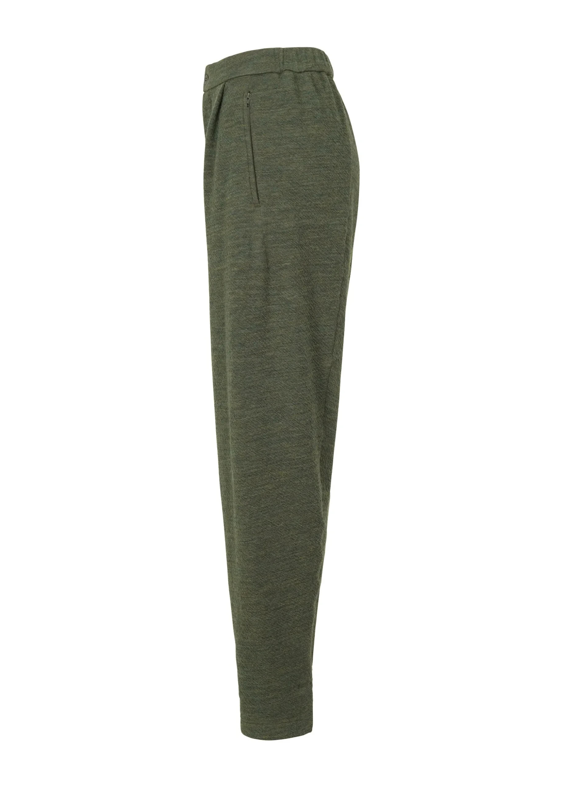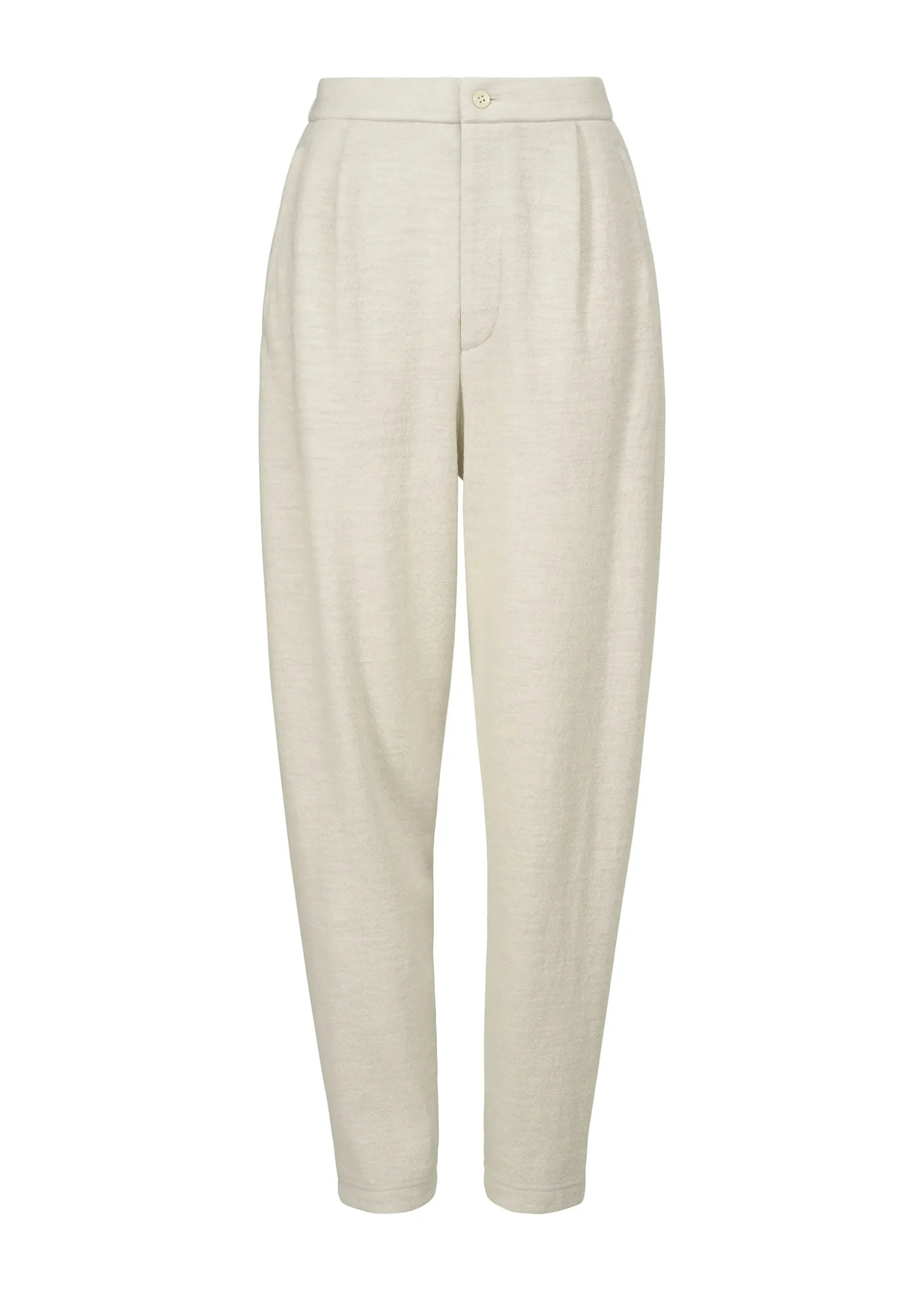 These jersey pants are made using Australian merino wool. The soft material was fulled to give it just the right amount of firmness. A double jacquard machine was used to create a design that allows you to enjoy the difference between the two sides by changing the colors of the front and back.
