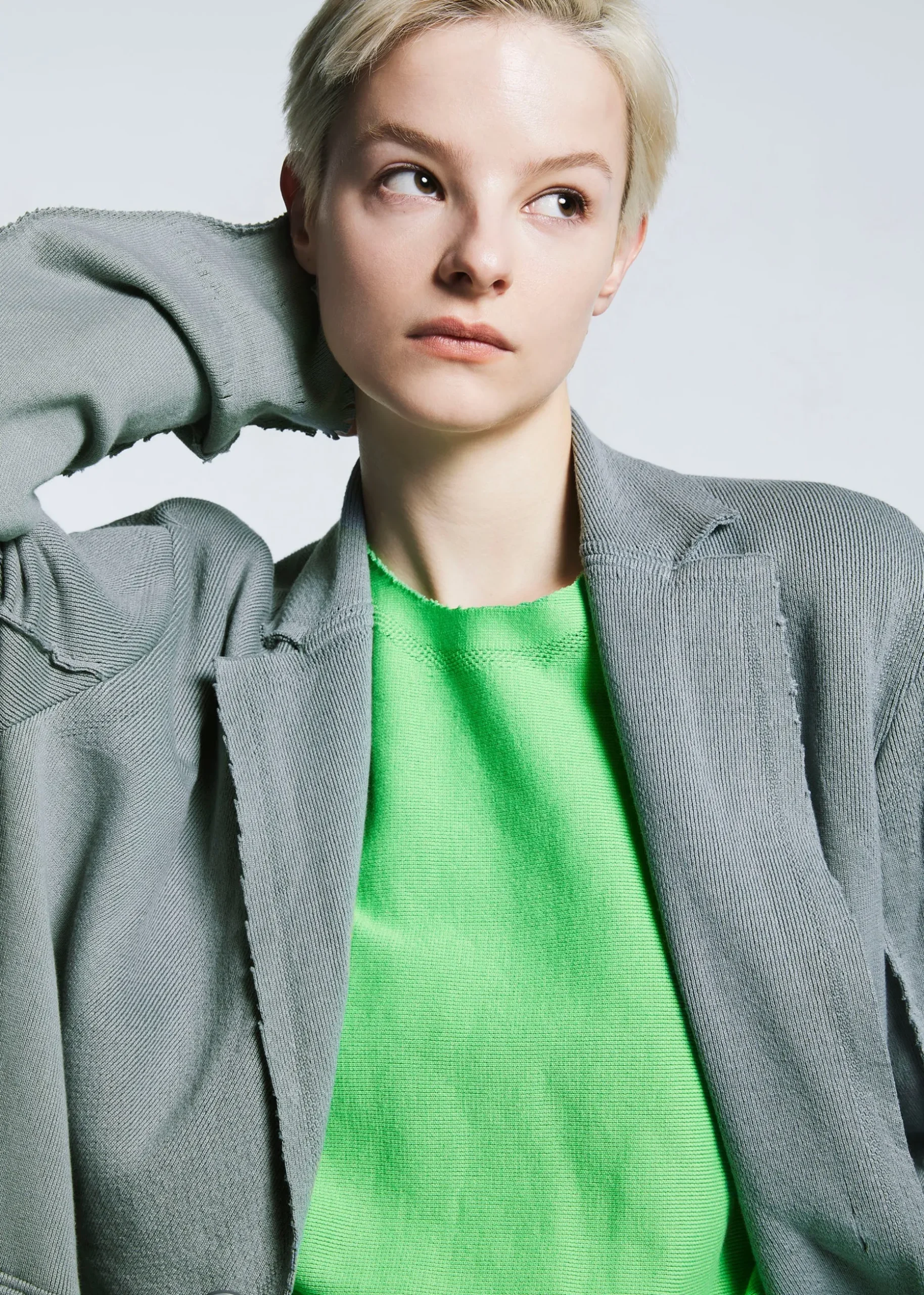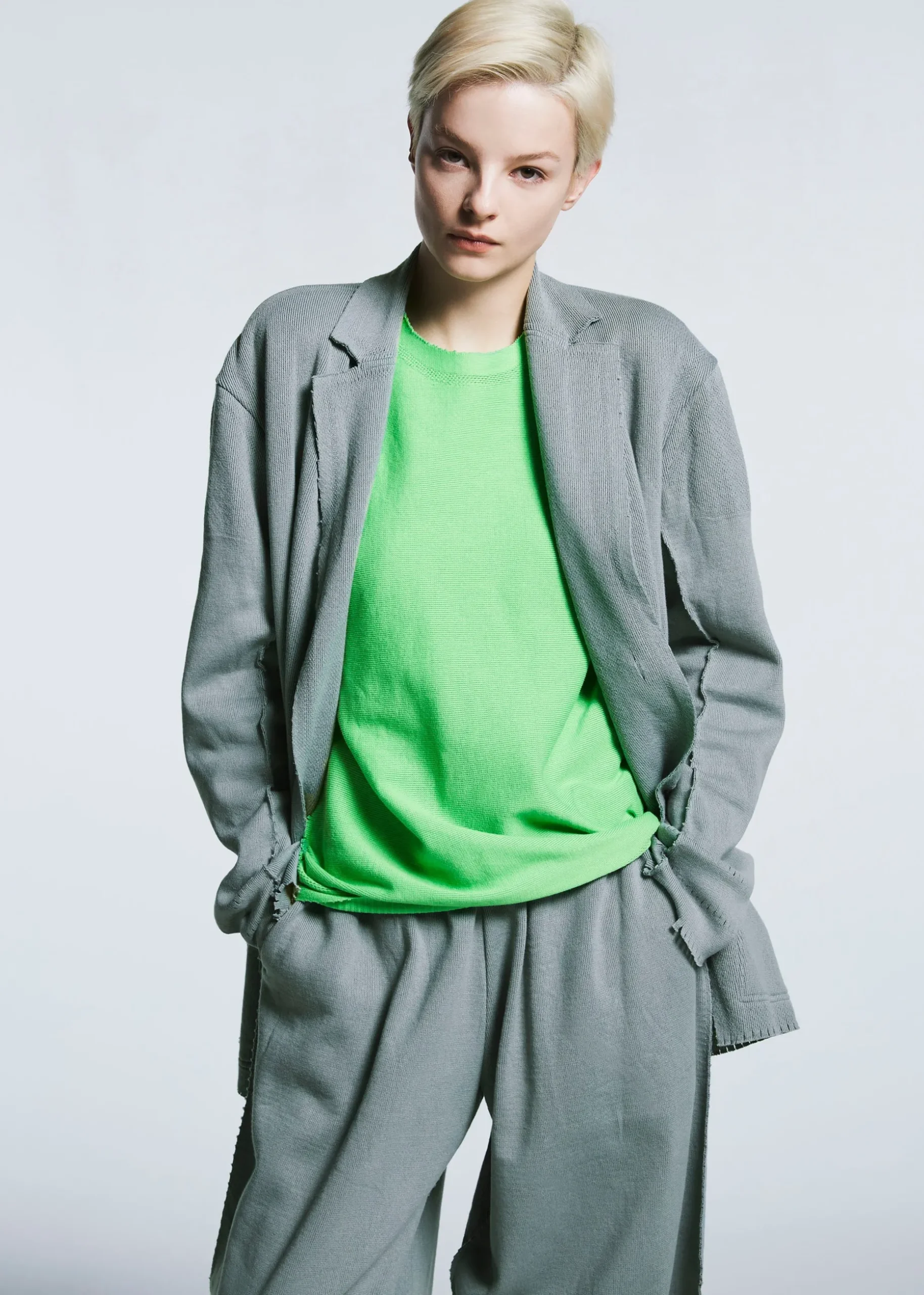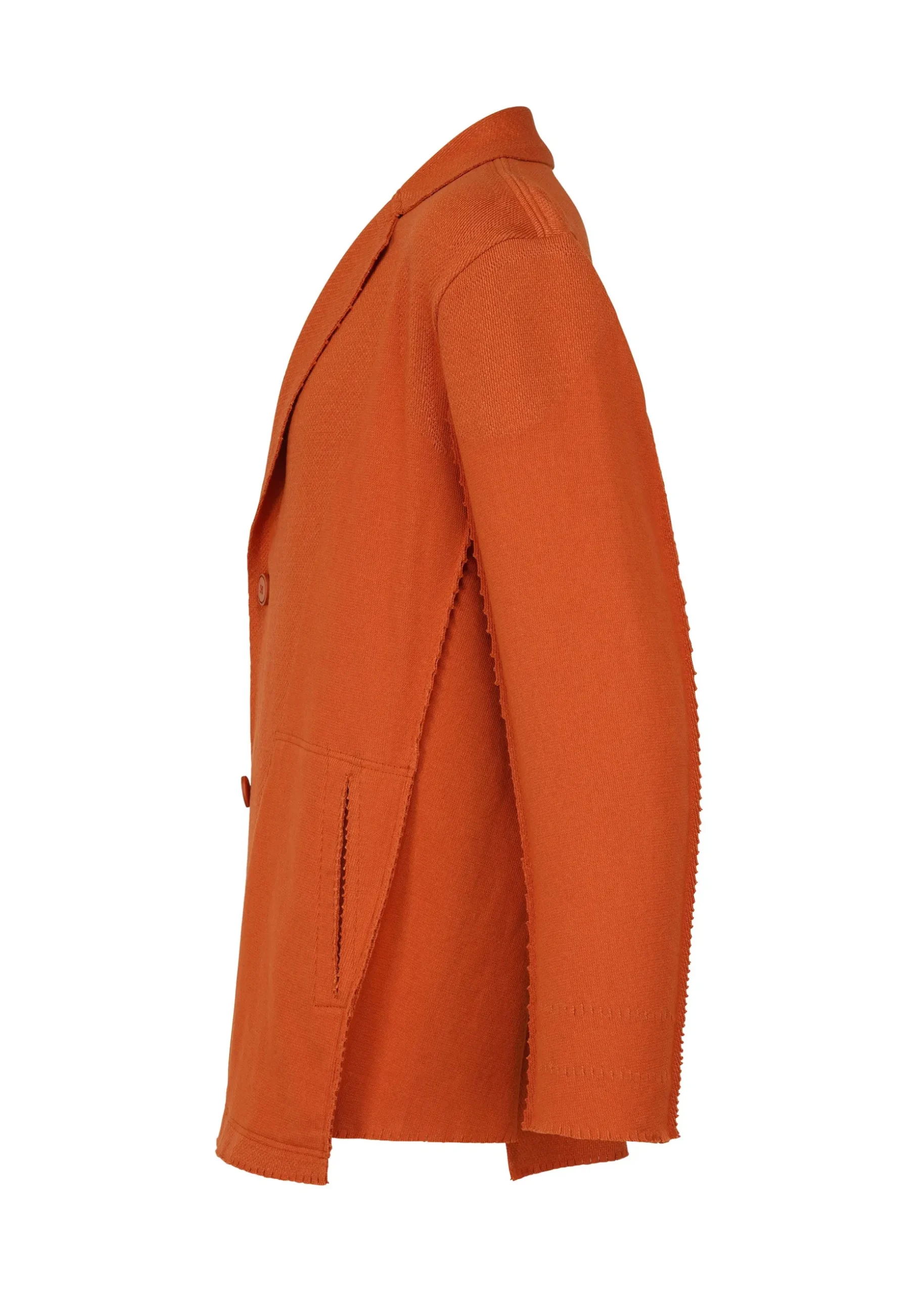 This knit jacket is made using a technique of cutting garments from tube-shaped fabric, which has been continuously evolving since the creation of A-POC. It is characterized by its relaxed, comfortable feel.