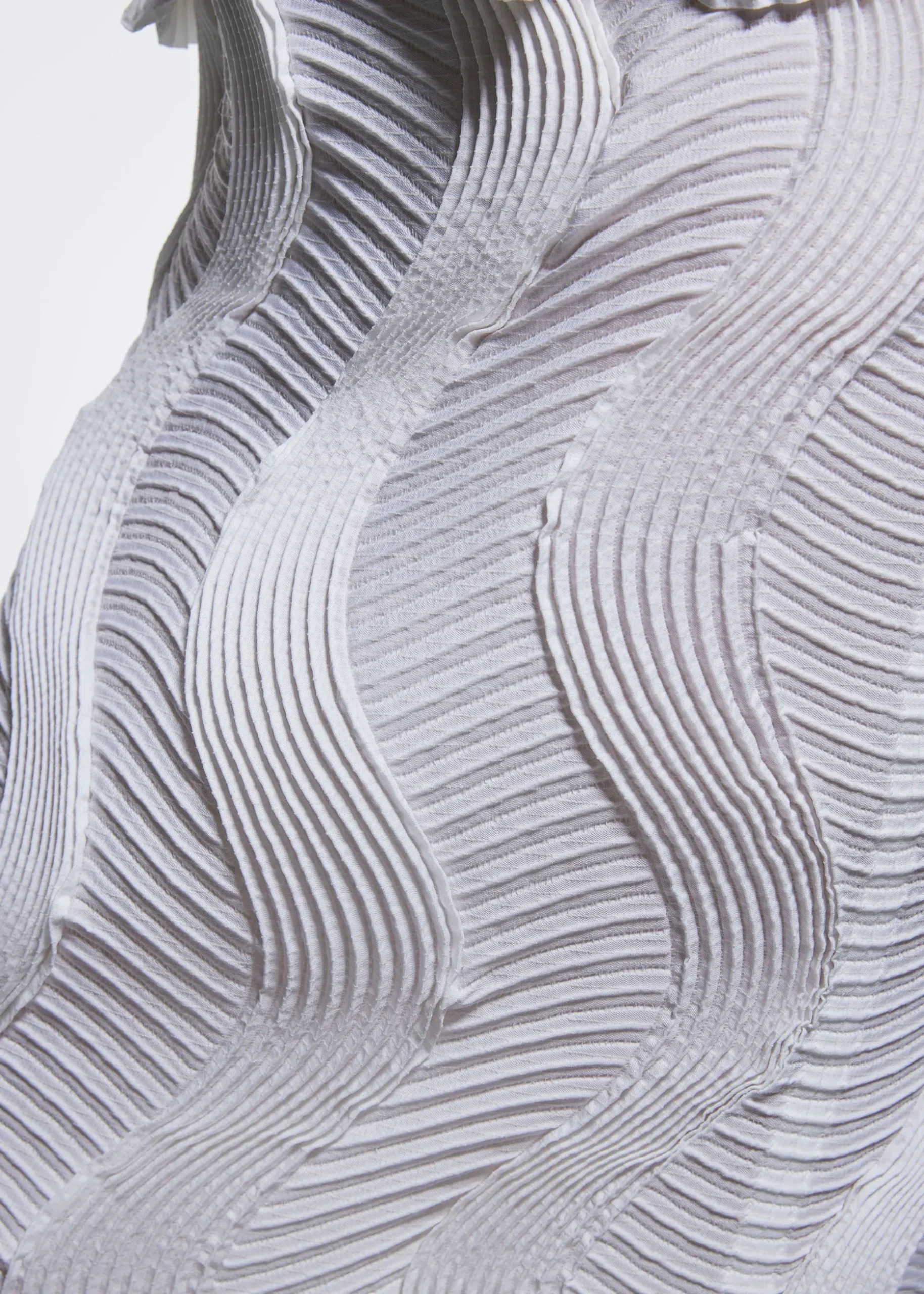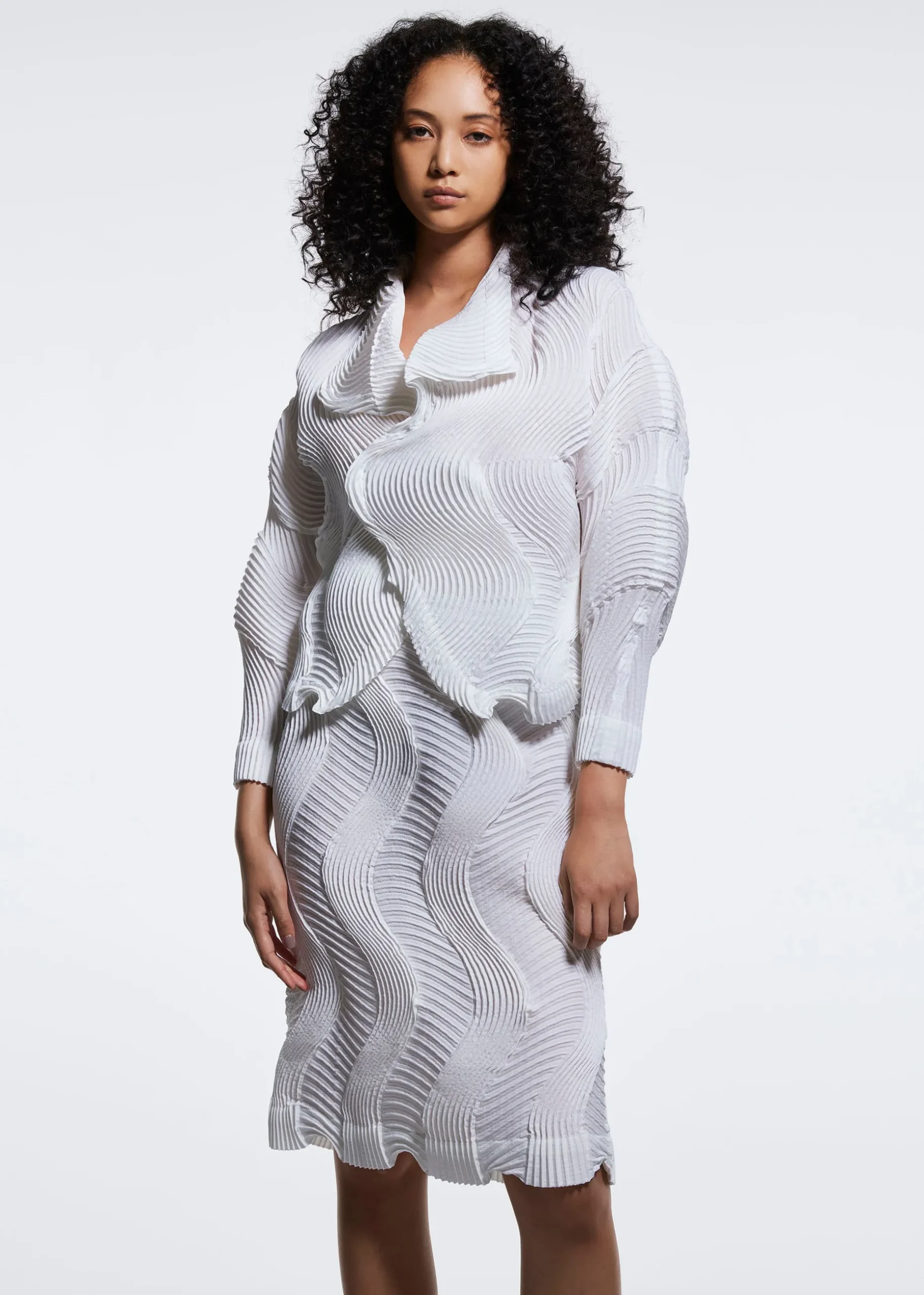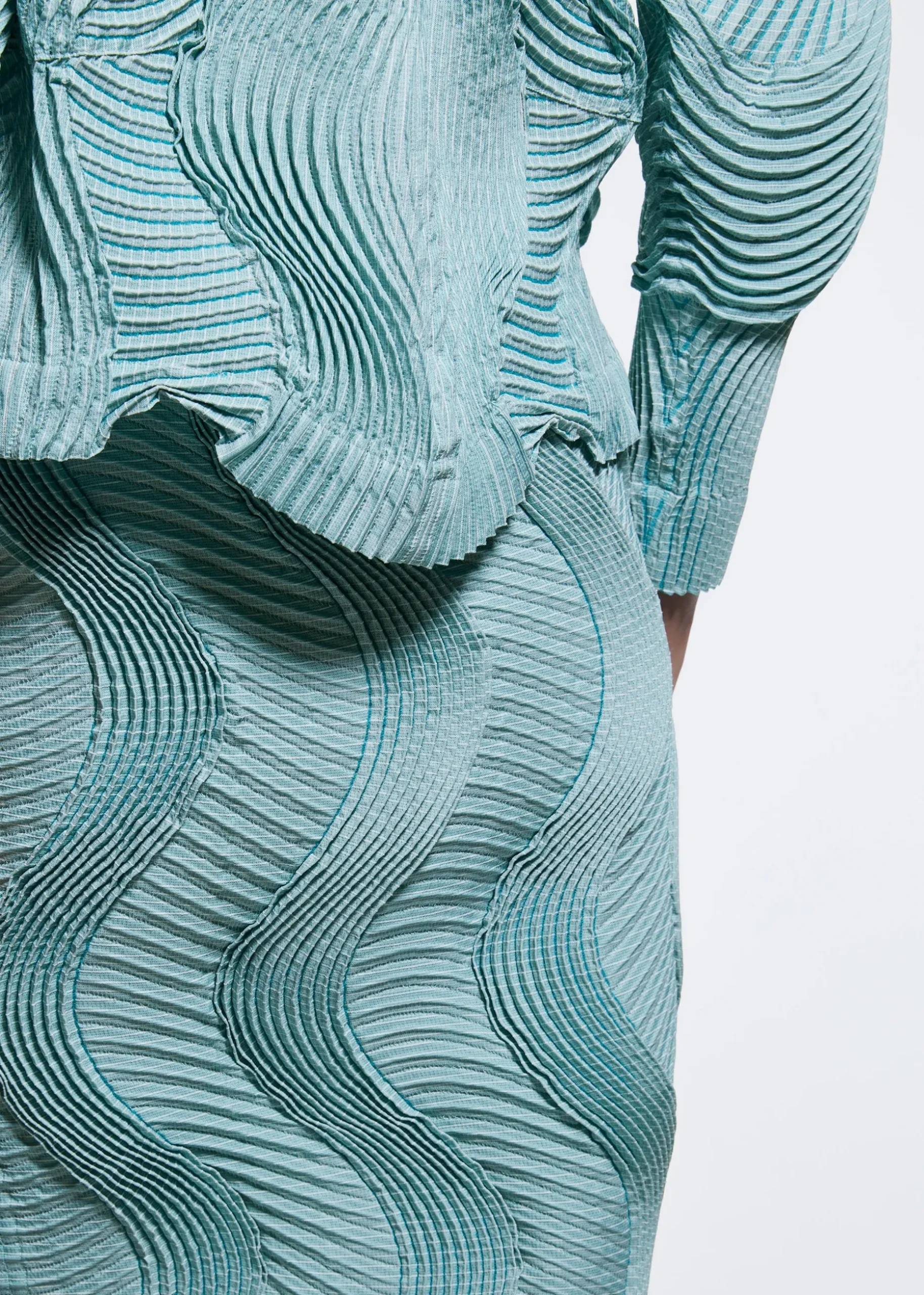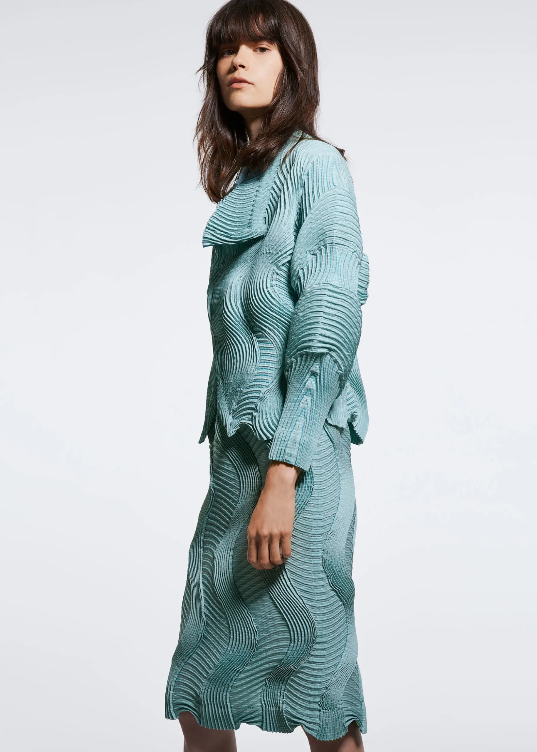Made from partly plant-derived polyester, TYPE-O 004 is a series featuring a unique wavy pleating structure. The three-dimensional texture is created by alternately positioning the pleats vertically and horizontally, and lends richness to the silhouette while worn. This series utilizes the highly advanced “Steam Stretch” technique, which uses special threads that shrink in specific places when steam is applied. This method creates three-dimensional pleated shapes and durable garments that are machine washable and maintain their shape over time.