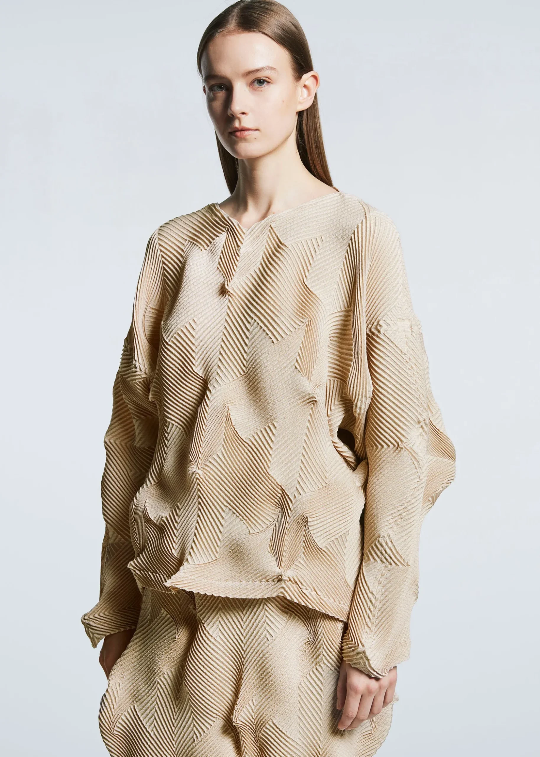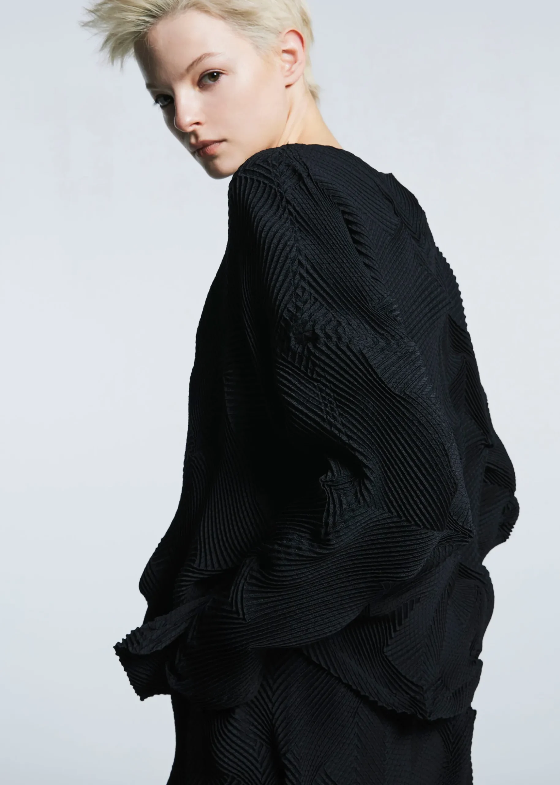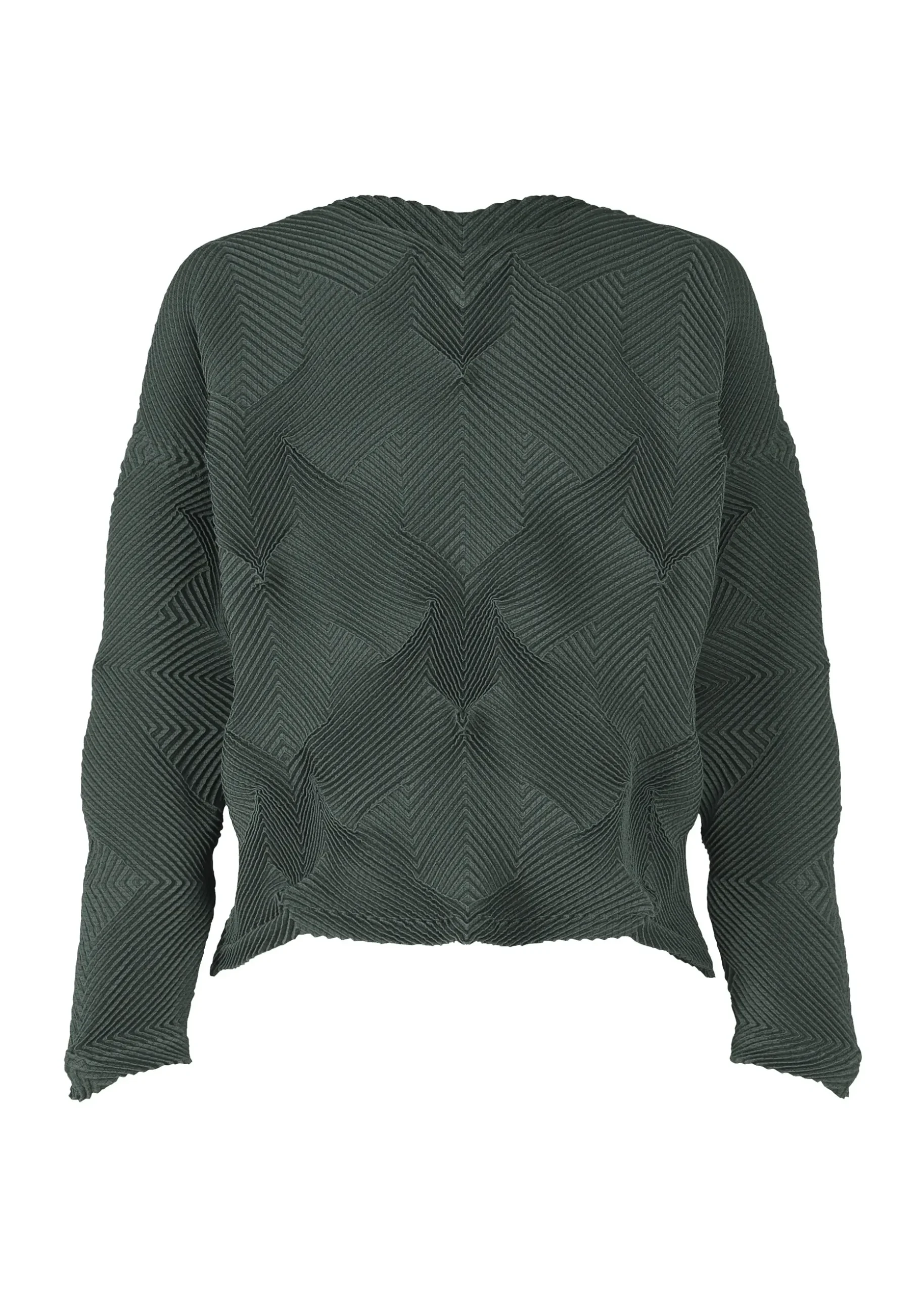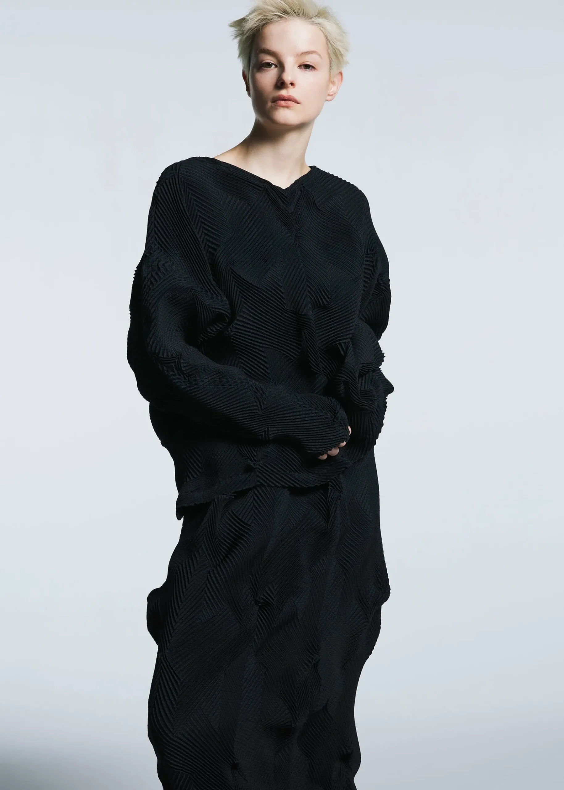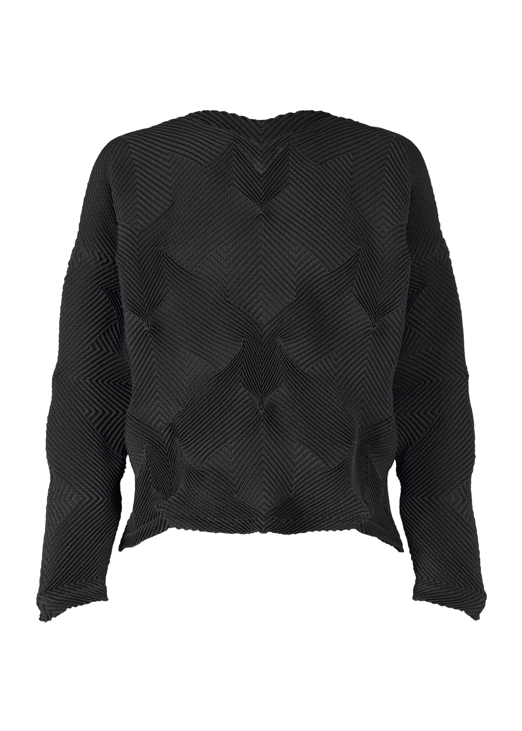 This top is characterized by its pleated shape created using the Steam Stretch* technique arranged in a houndstooth pattern. It is soft like knitwear and has a loose fit that is moderately separated from the body. It is made from partially plant-derived polyester and recycled polyester thread.