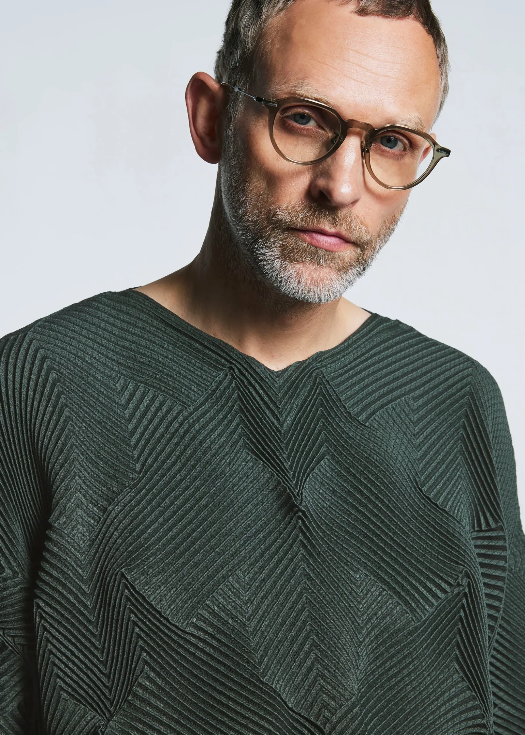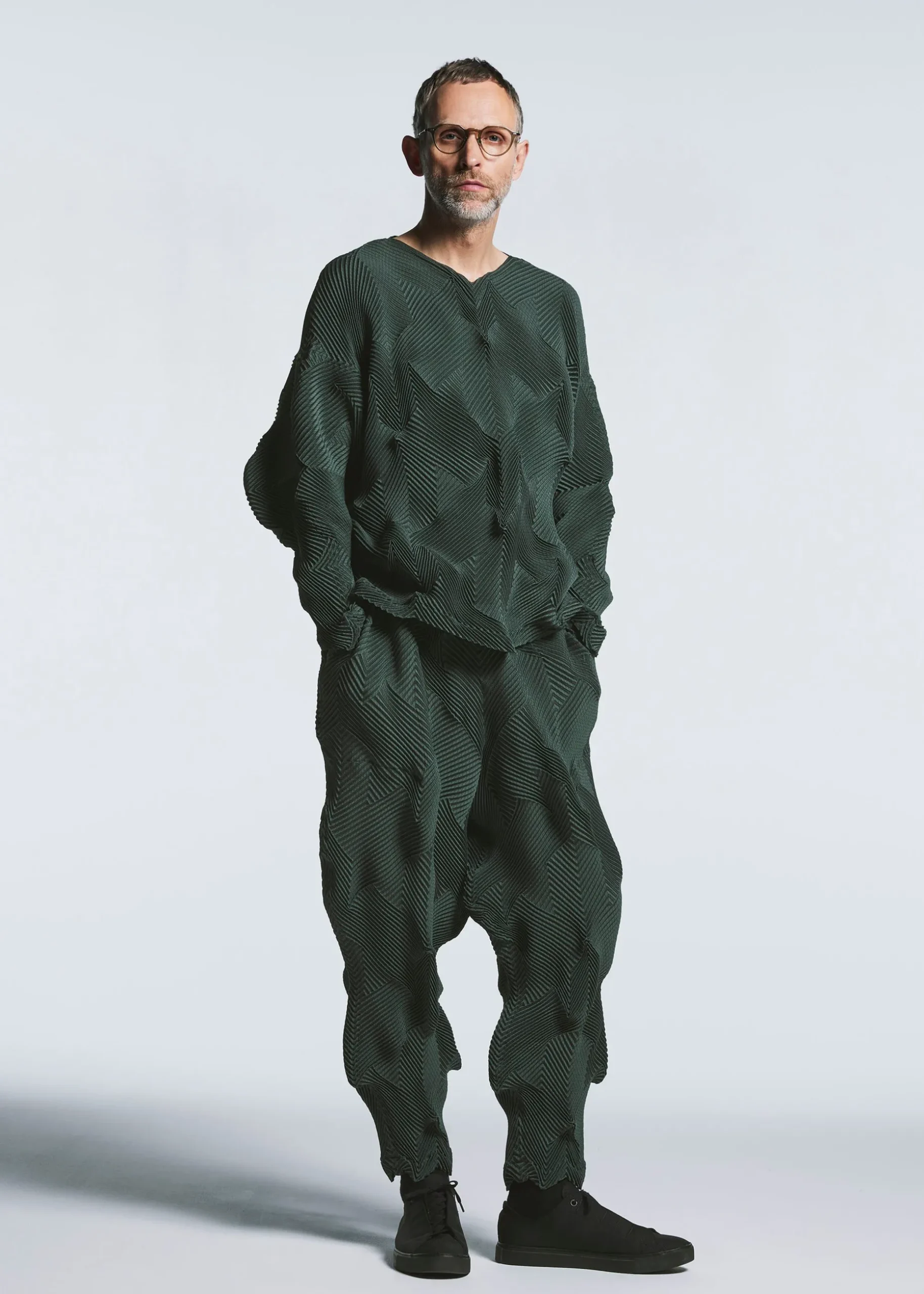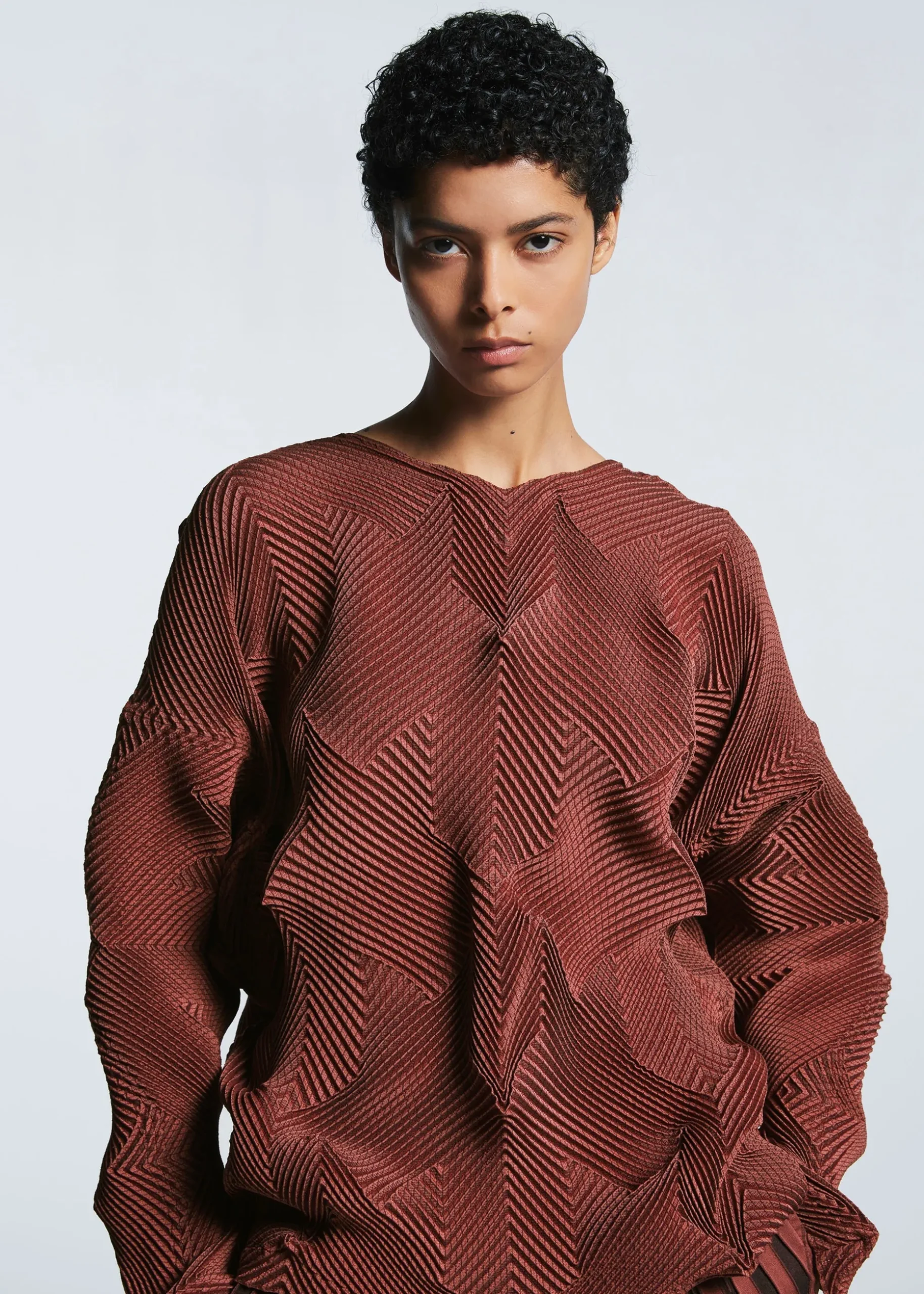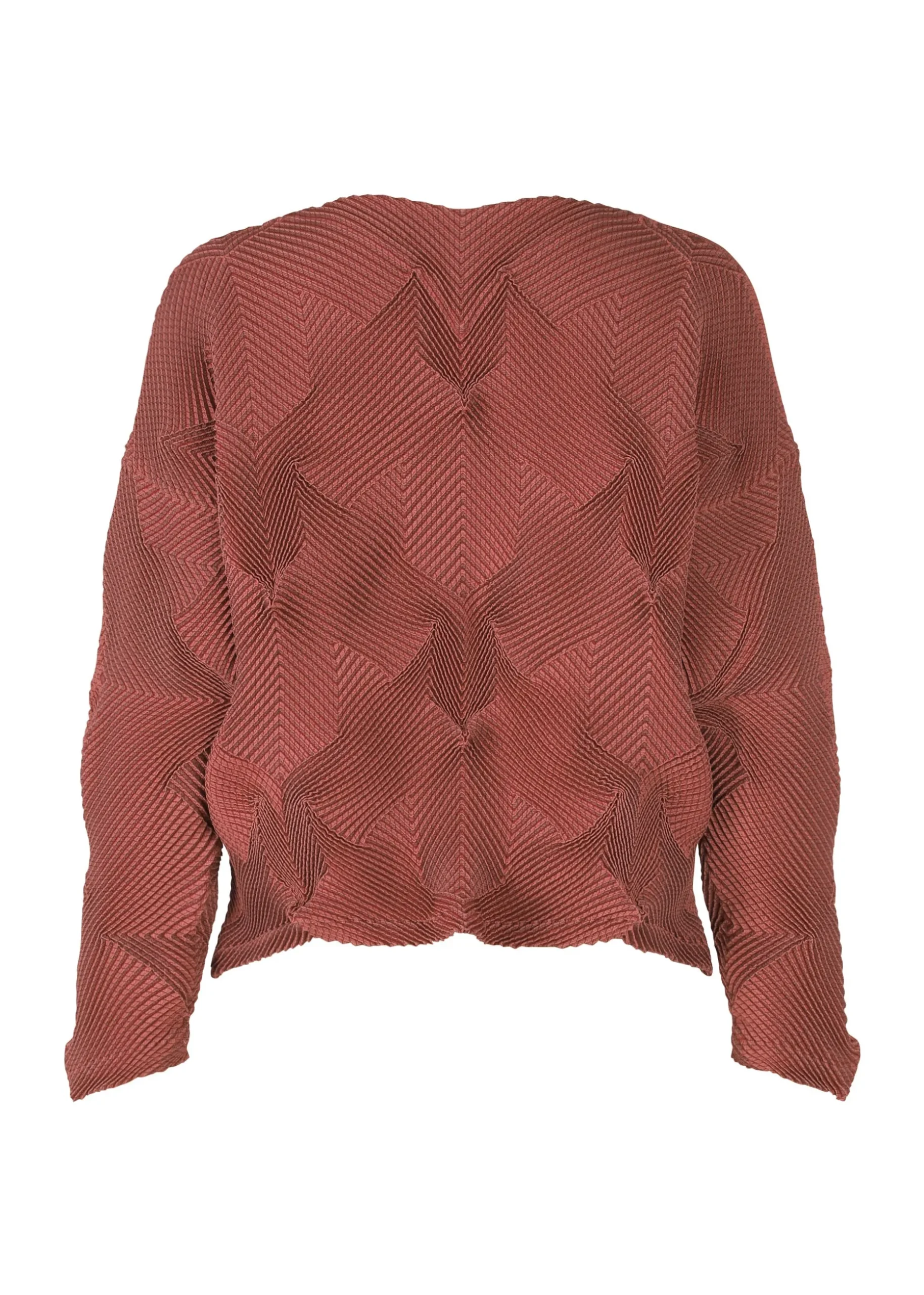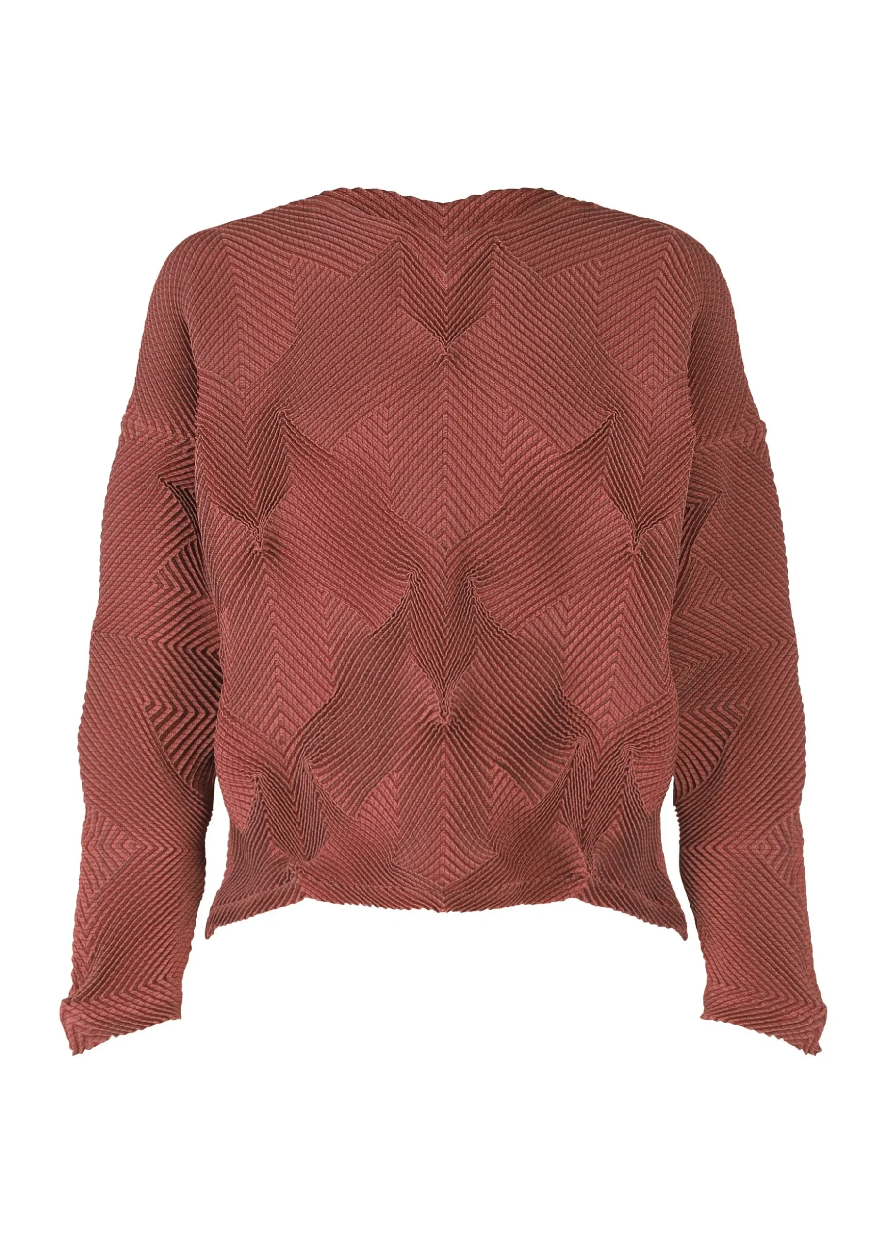 This top is characterized by its pleated shape created using the Steam Stretch* technique arranged in a houndstooth pattern. It is soft like knitwear and has a loose fit that is moderately separated from the body. It is made from partially plant-derived polyester and recycled polyester thread.