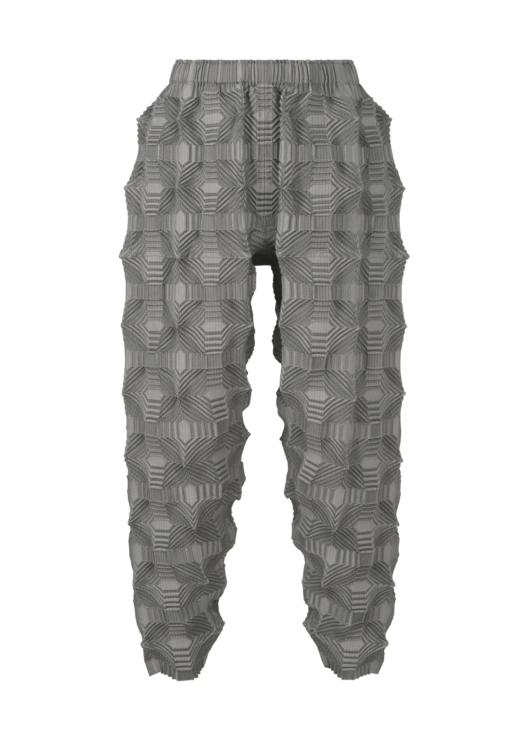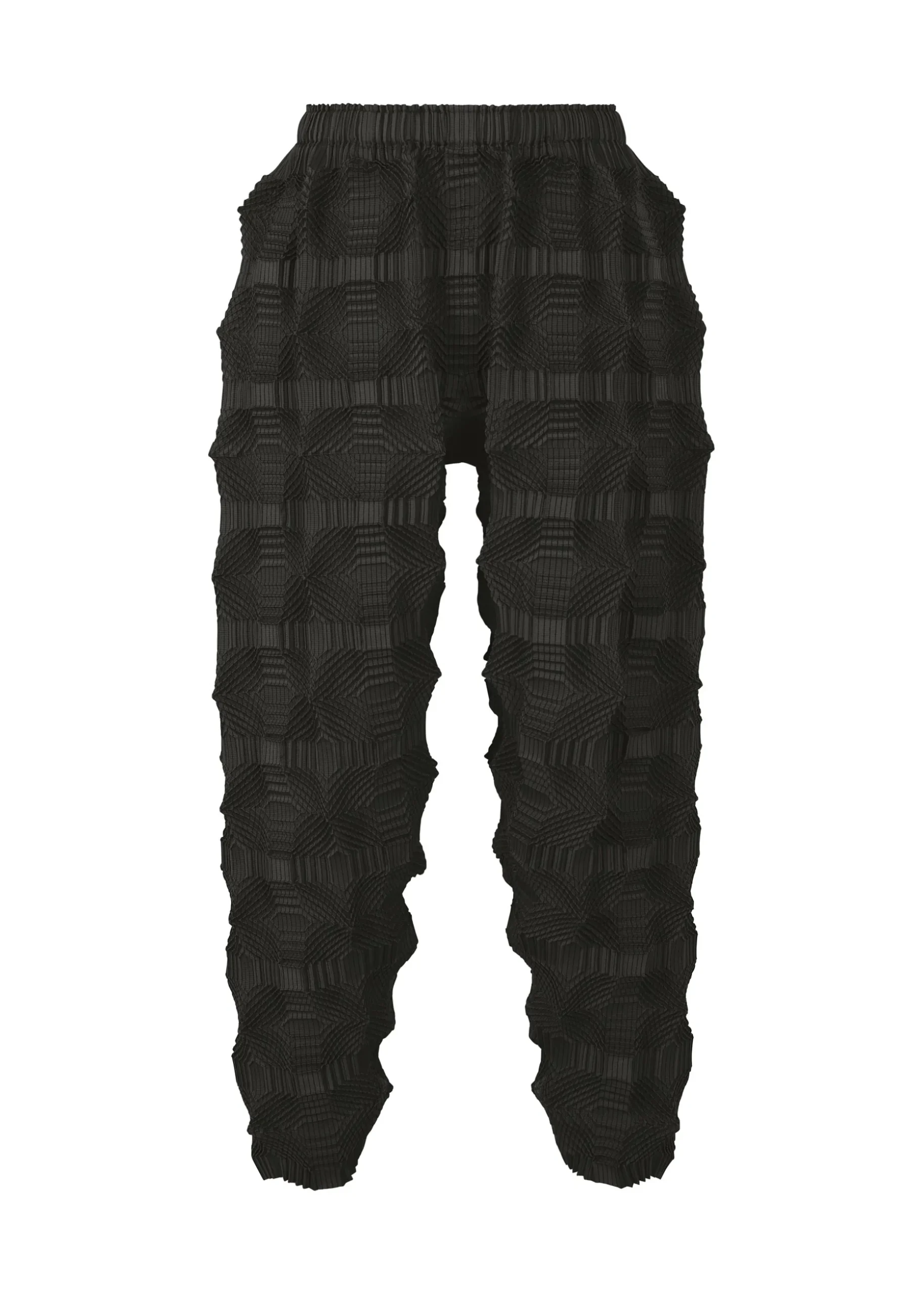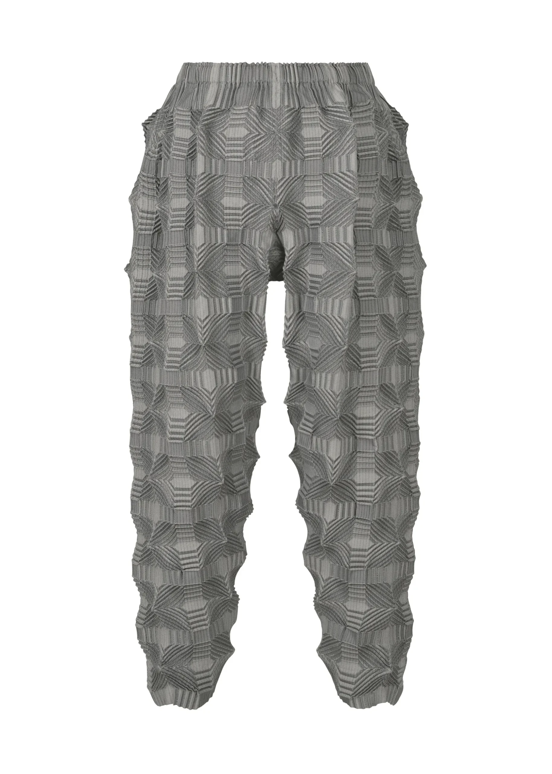 These pants have a pattern of regularly arranged squares designed using the Steam Stretch* technique. They are characterized by its unevenness created by the shrinkage of the lines within the square pattern, as well as the voluminous feel with knit-like comfort.