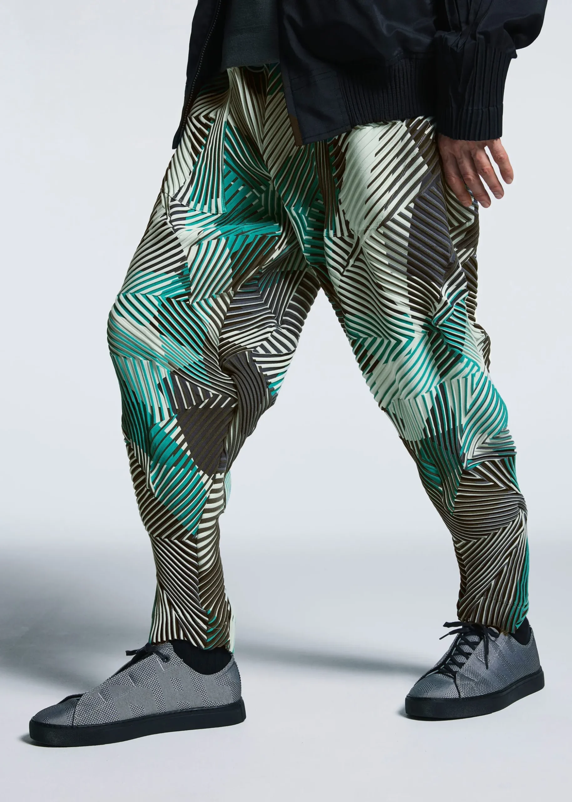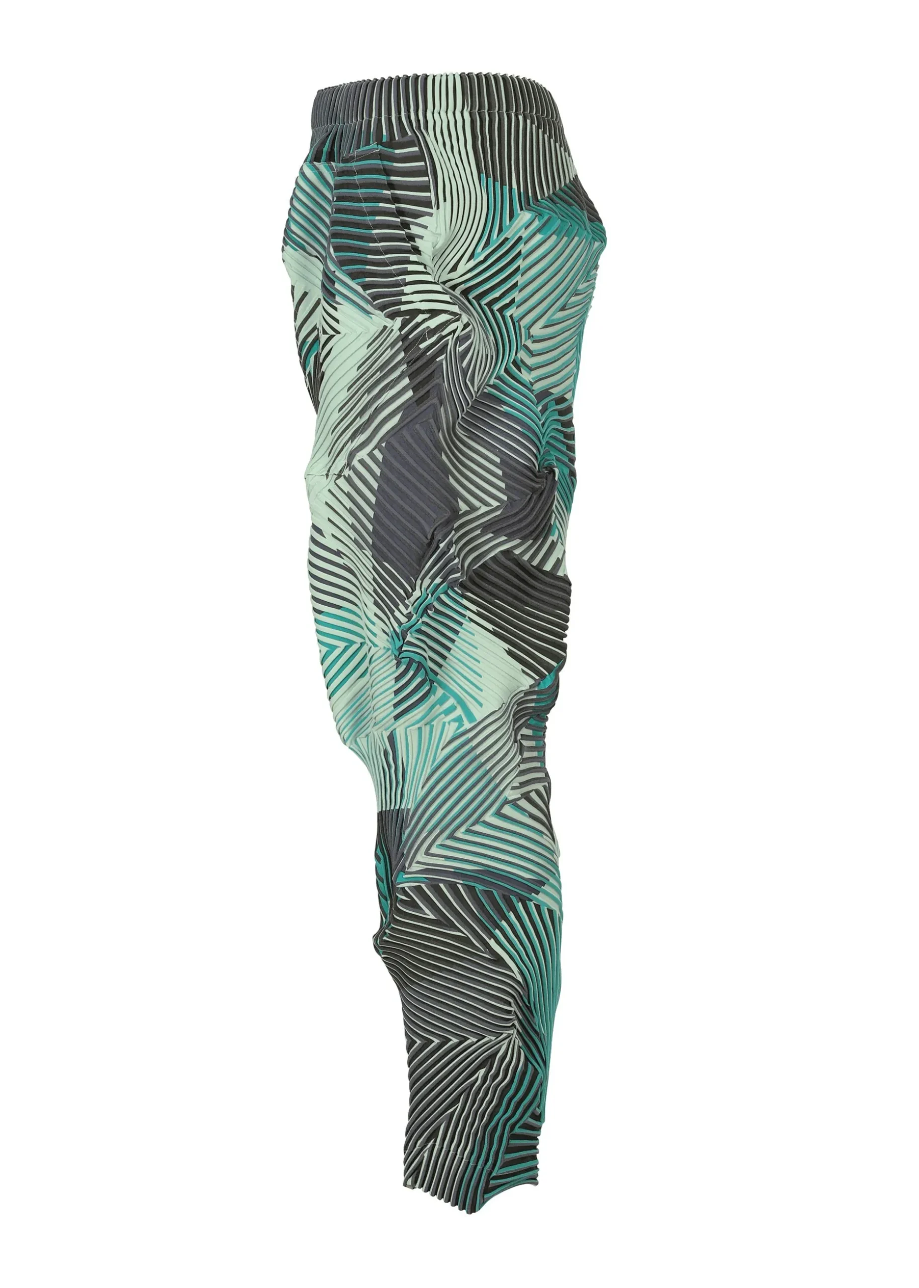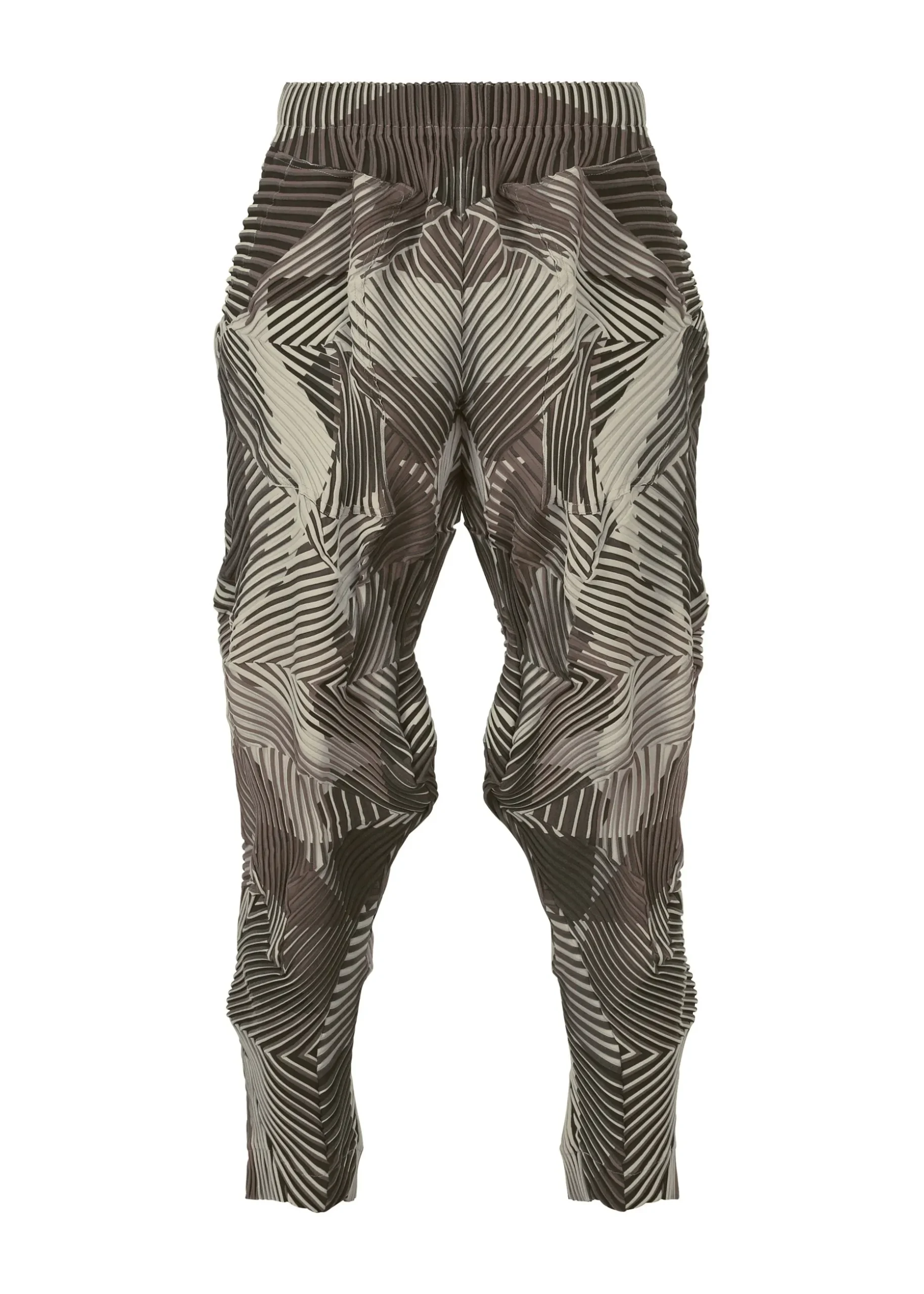 These pants are characterized by their rich colors created using the Baked Stretch* technique. By printing different patterns on the left and right sides of the convex part and the concave part of the pleats, the vivid colors of the print overflow from the shadows of the unevenness when worn, creating a beautiful visual effect.