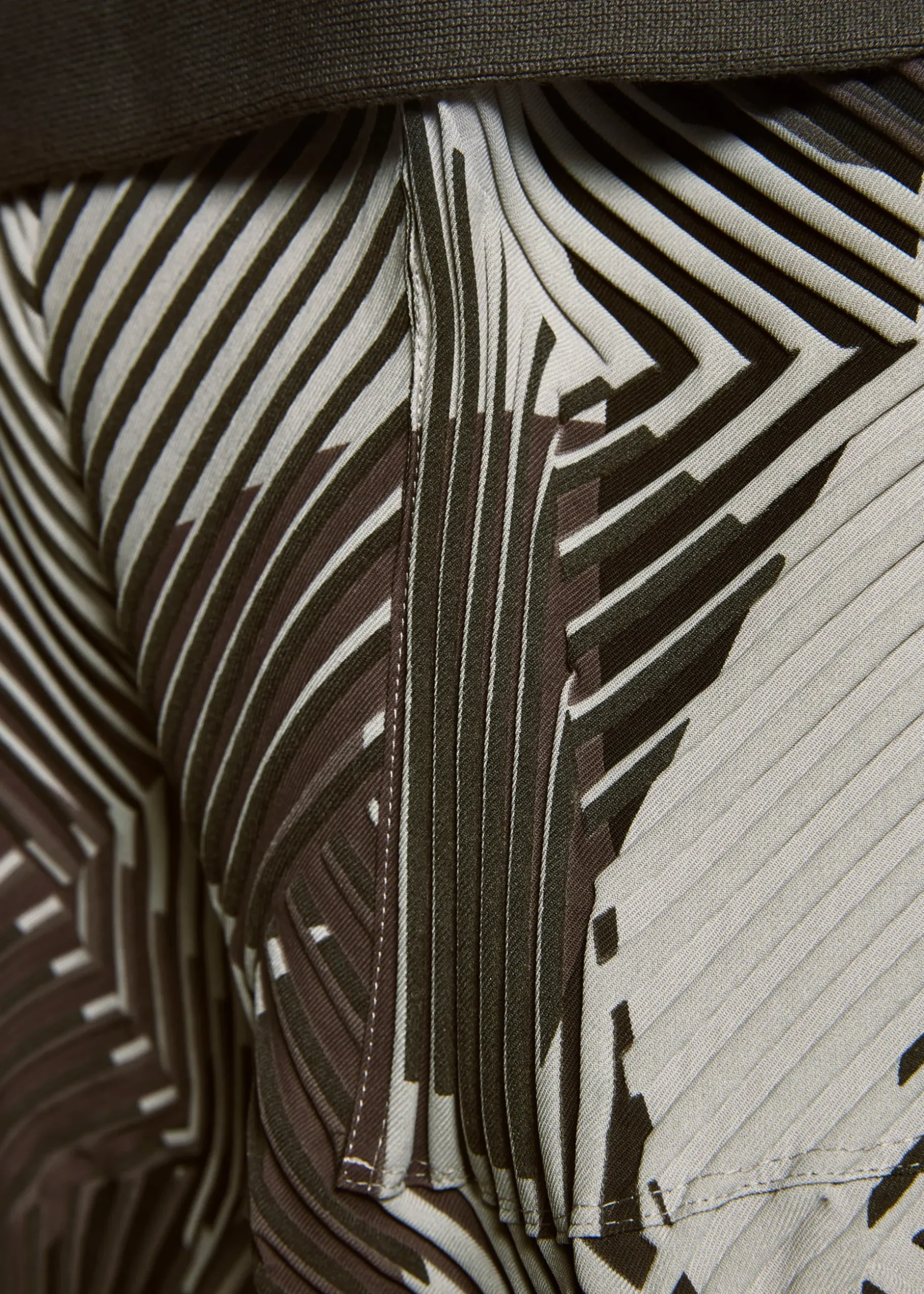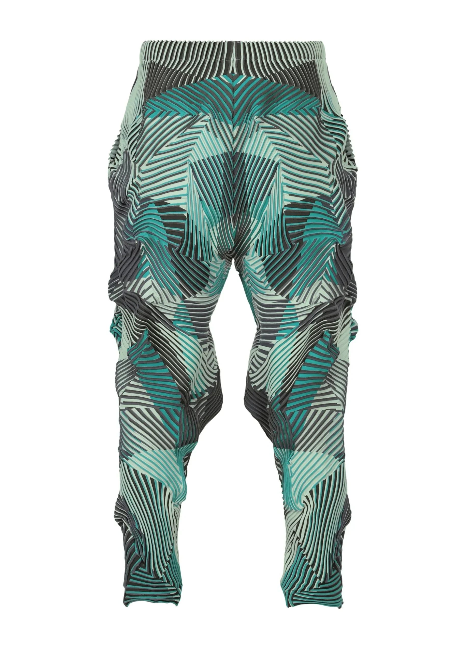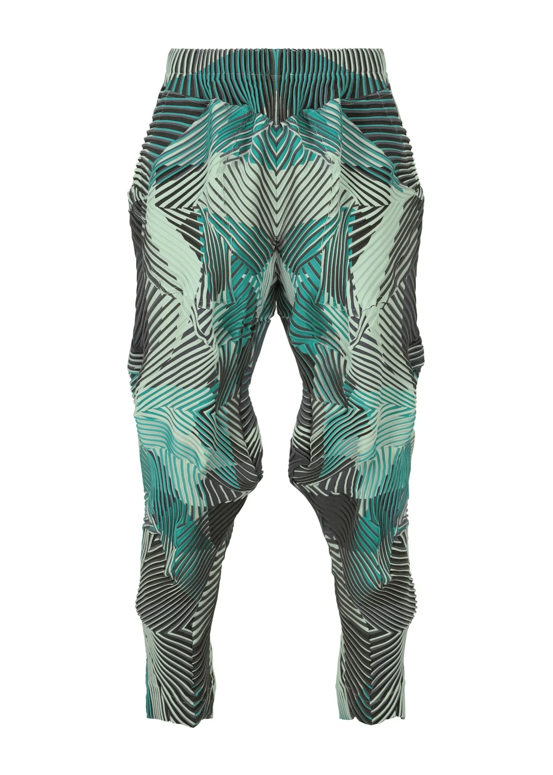 These pants are characterized by their rich colors created using the Baked Stretch* technique. By printing different patterns on the left and right sides of the convex part and the concave part of the pleats, the vivid colors of the print overflow from the shadows of the unevenness when worn, creating a beautiful visual effect.