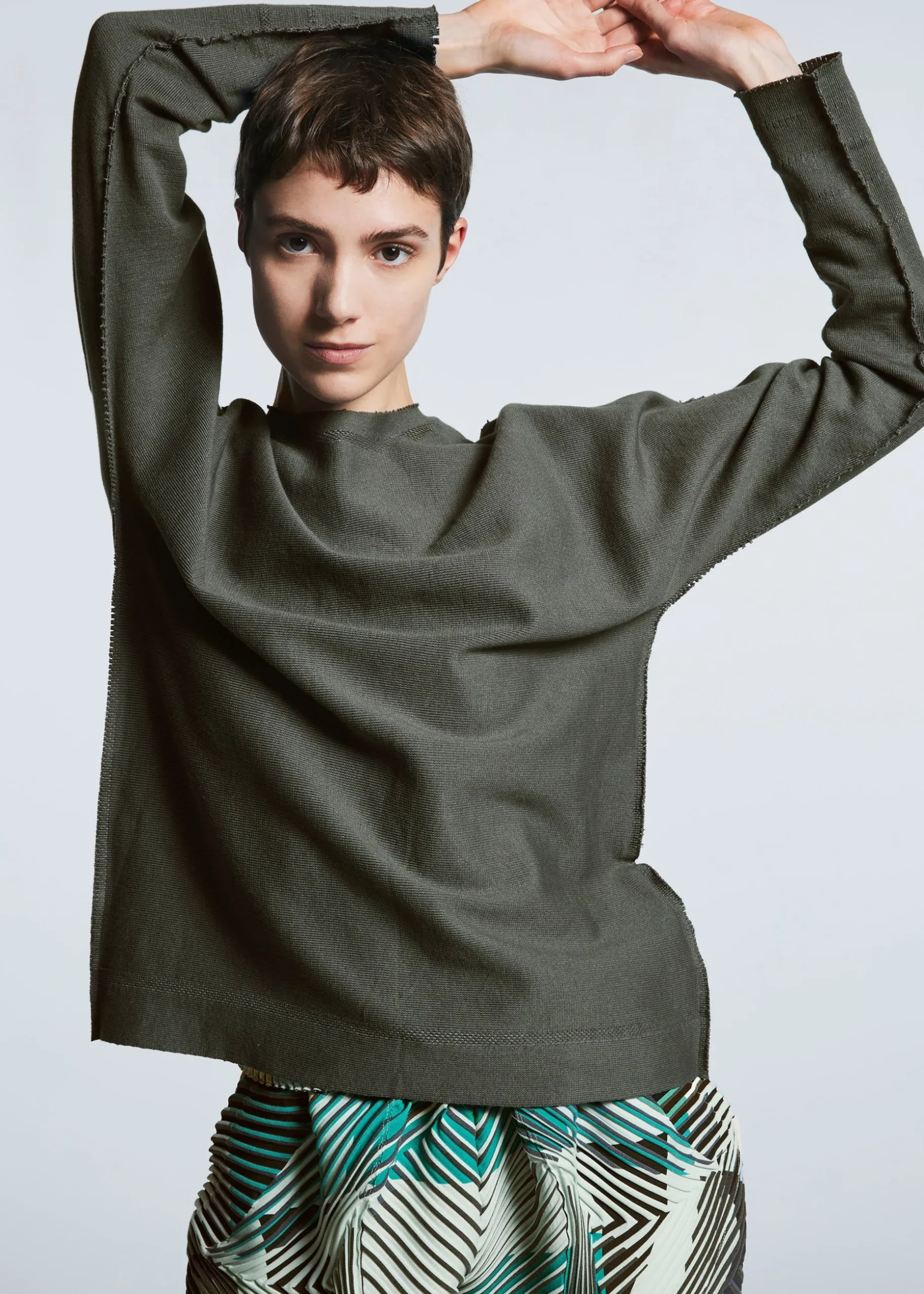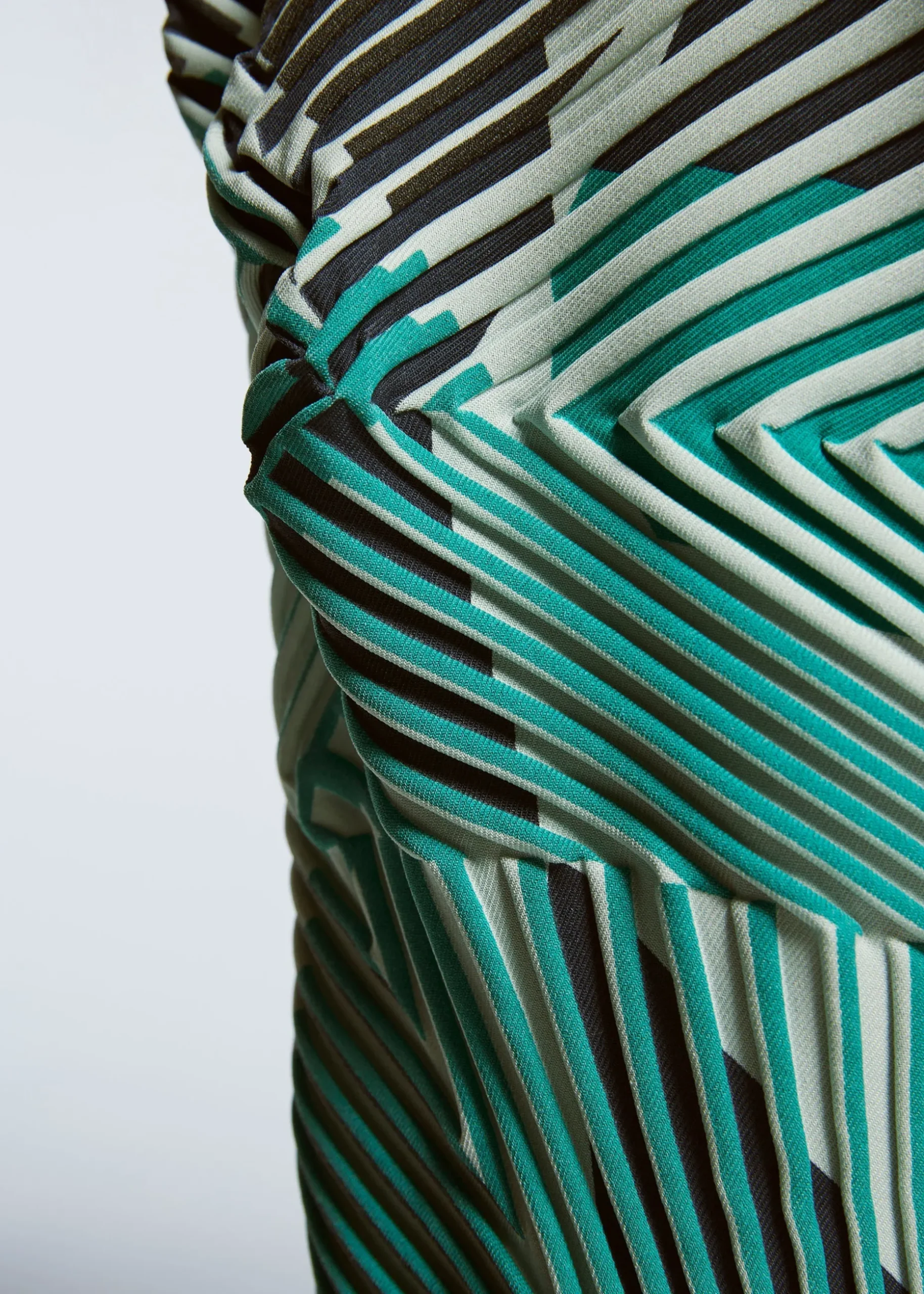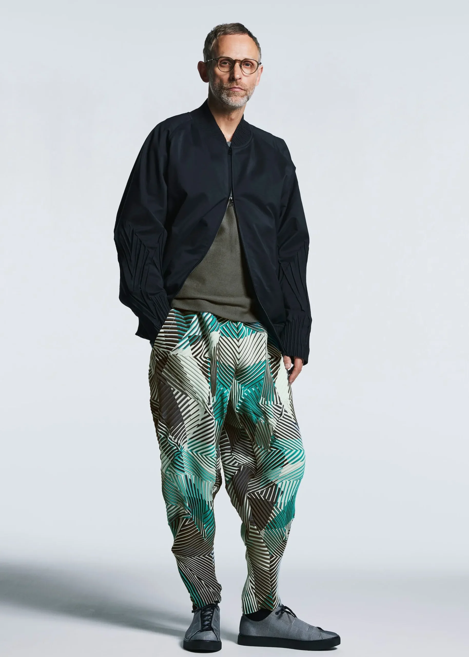 *This unique pleating method is named because the material is baked and expands just like baking bread. The pattern lines of the garment are designed in advance on the printing process plate, and the pleated shape and color pattern design are overlaid and printed. The special glue printed on the fabric then swells at high temperatures to transform the fabric into a pleated stretch material.