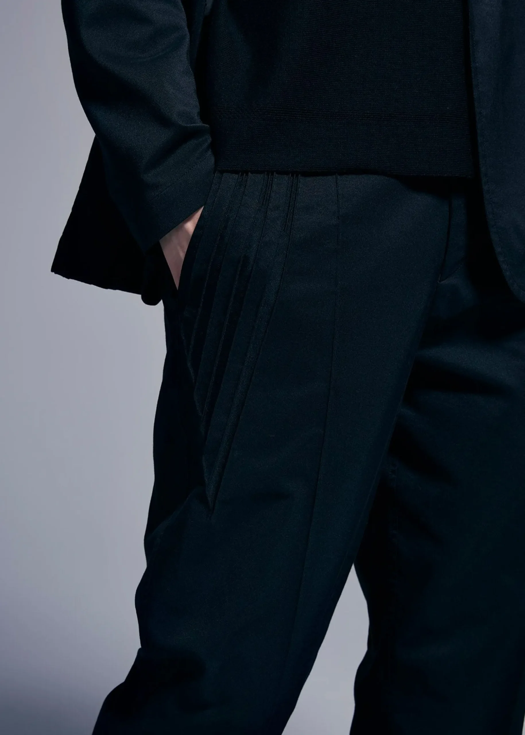 A thread that shrinks when heated is woven together with other threads, and when steam is applied, only that thread will shrink. By shrinking only the intended part of the woven cloth, three-dimensional patterns and shapes are created and the garment is completed.