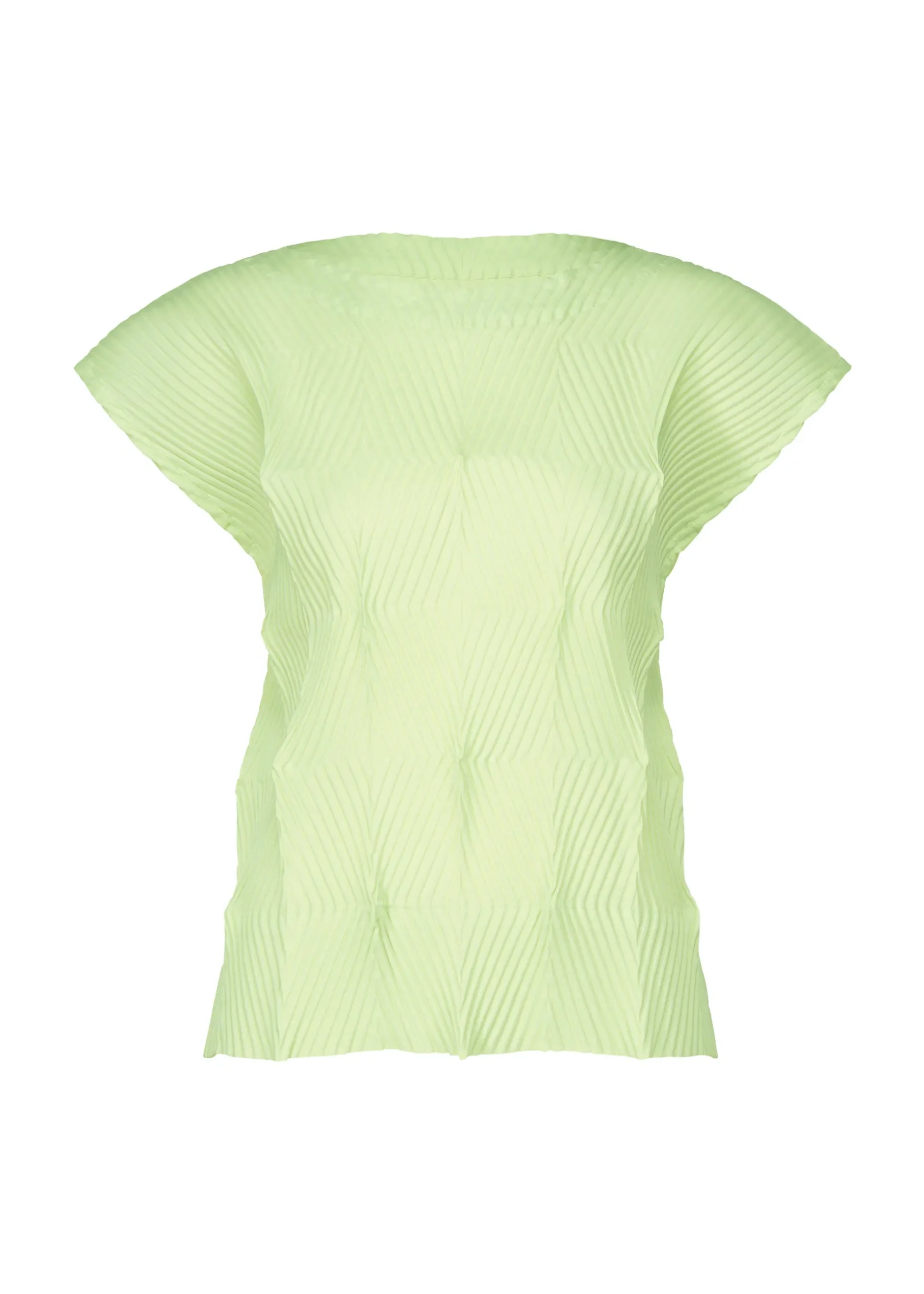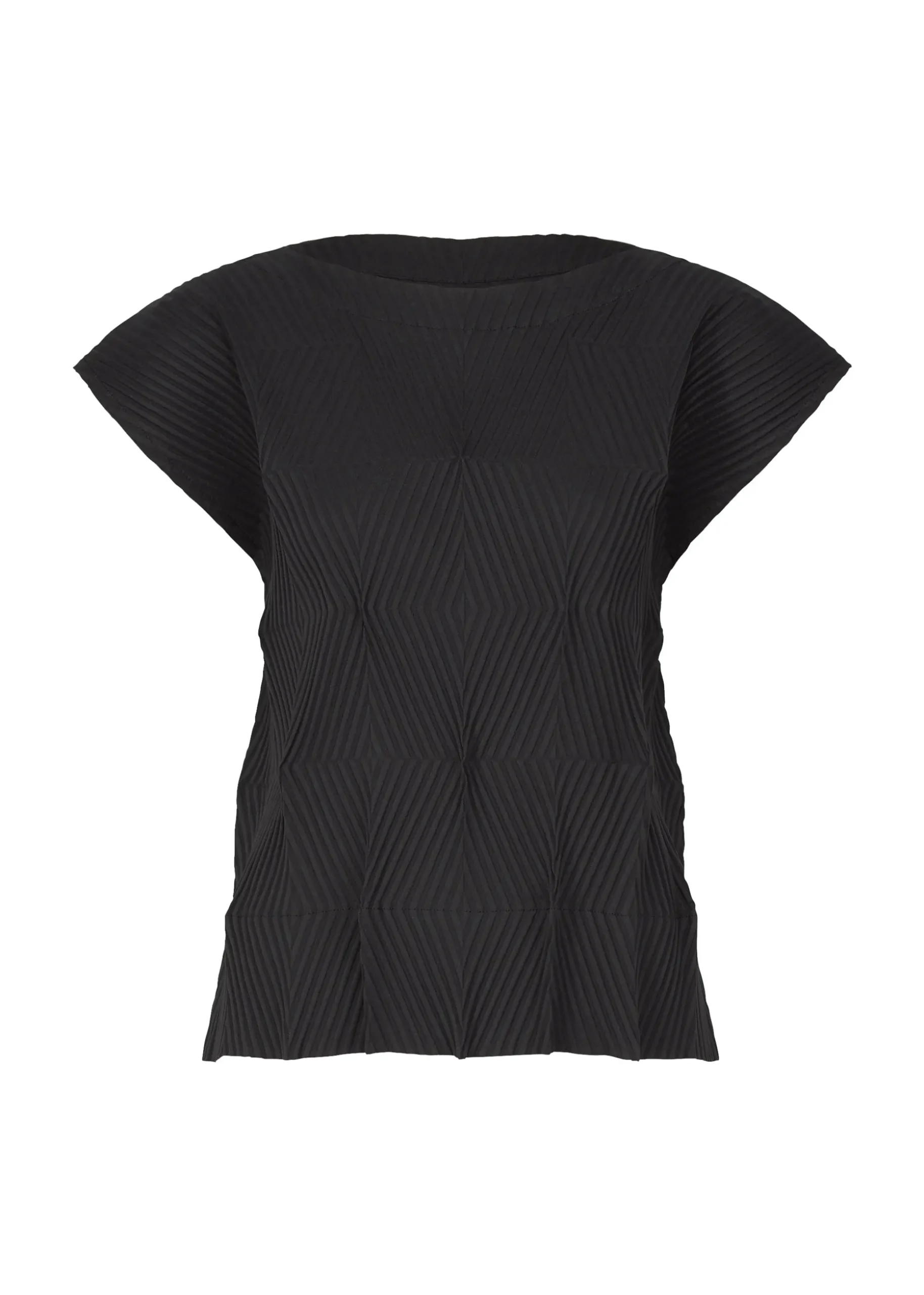This pleated shirt has a straight fit, short cap sleeves, and a crew neck.