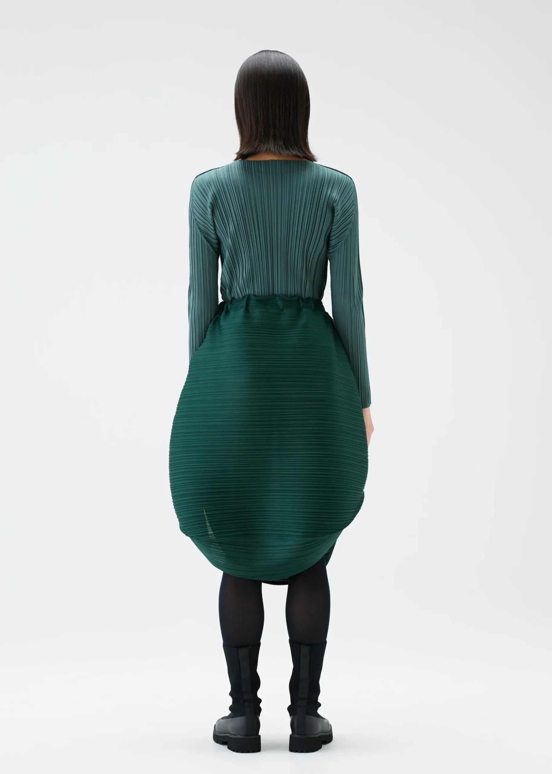 This skirt has the shape of a UFO when laid flat. Its horizontal pleats create a rounded silhouette.