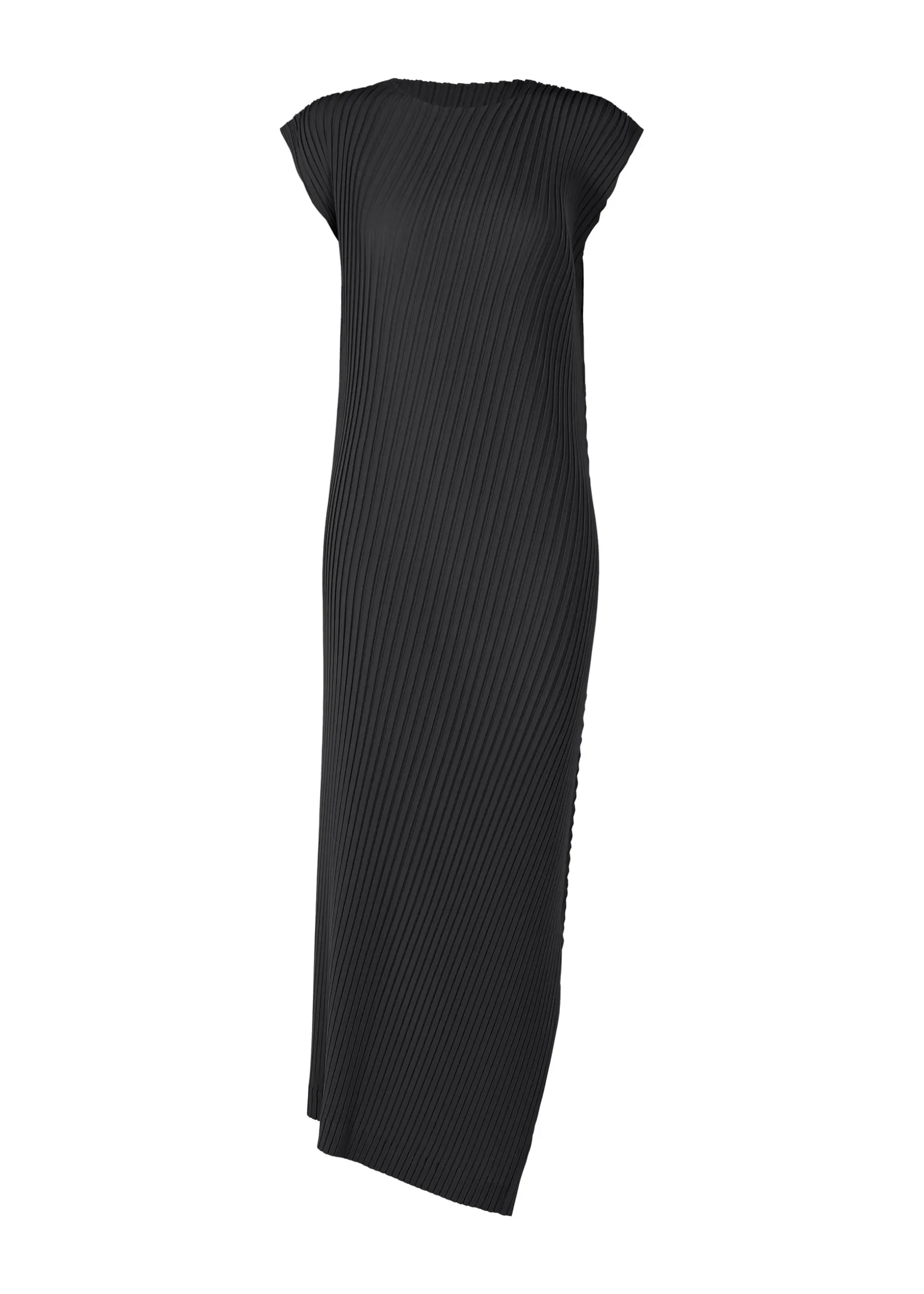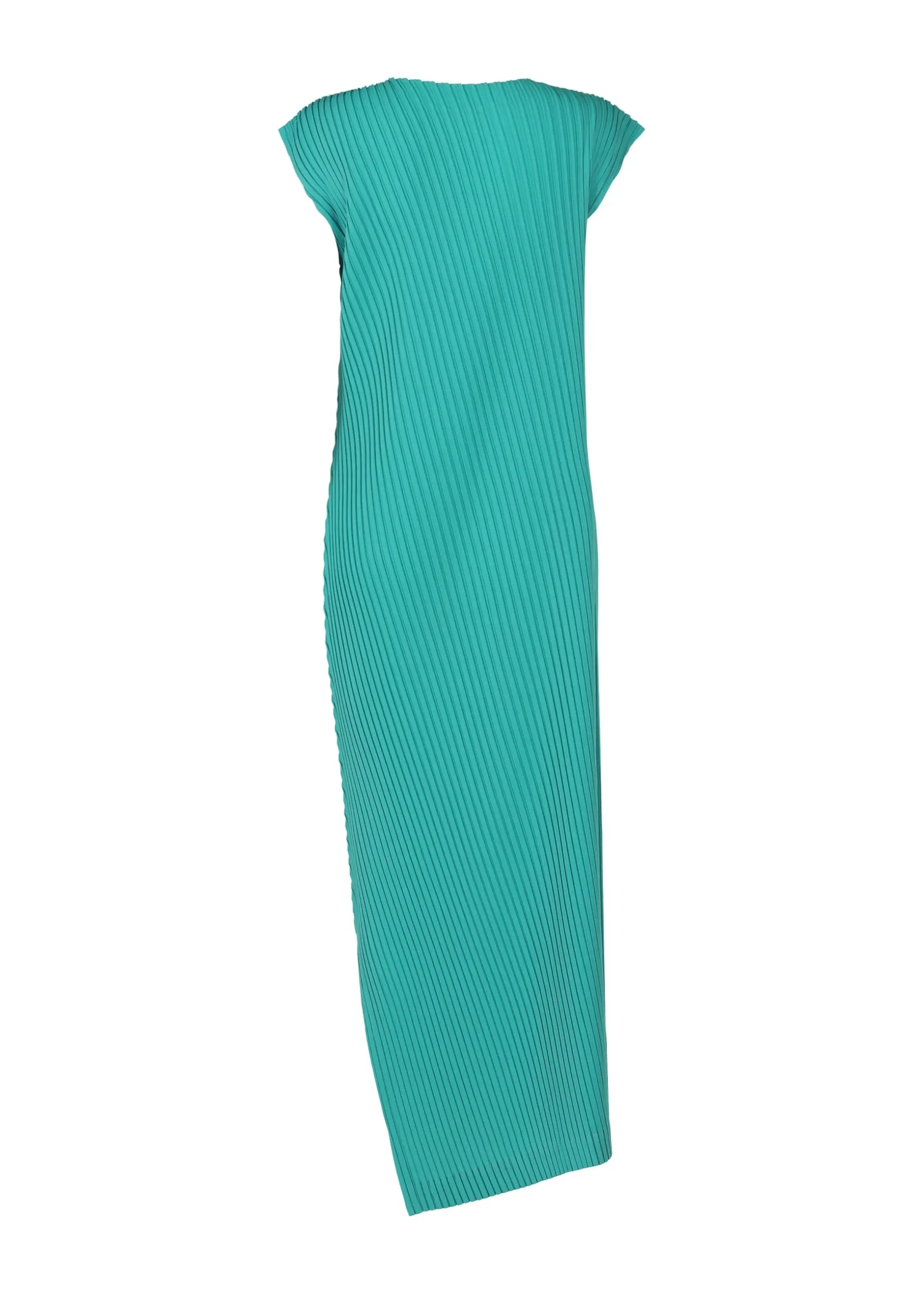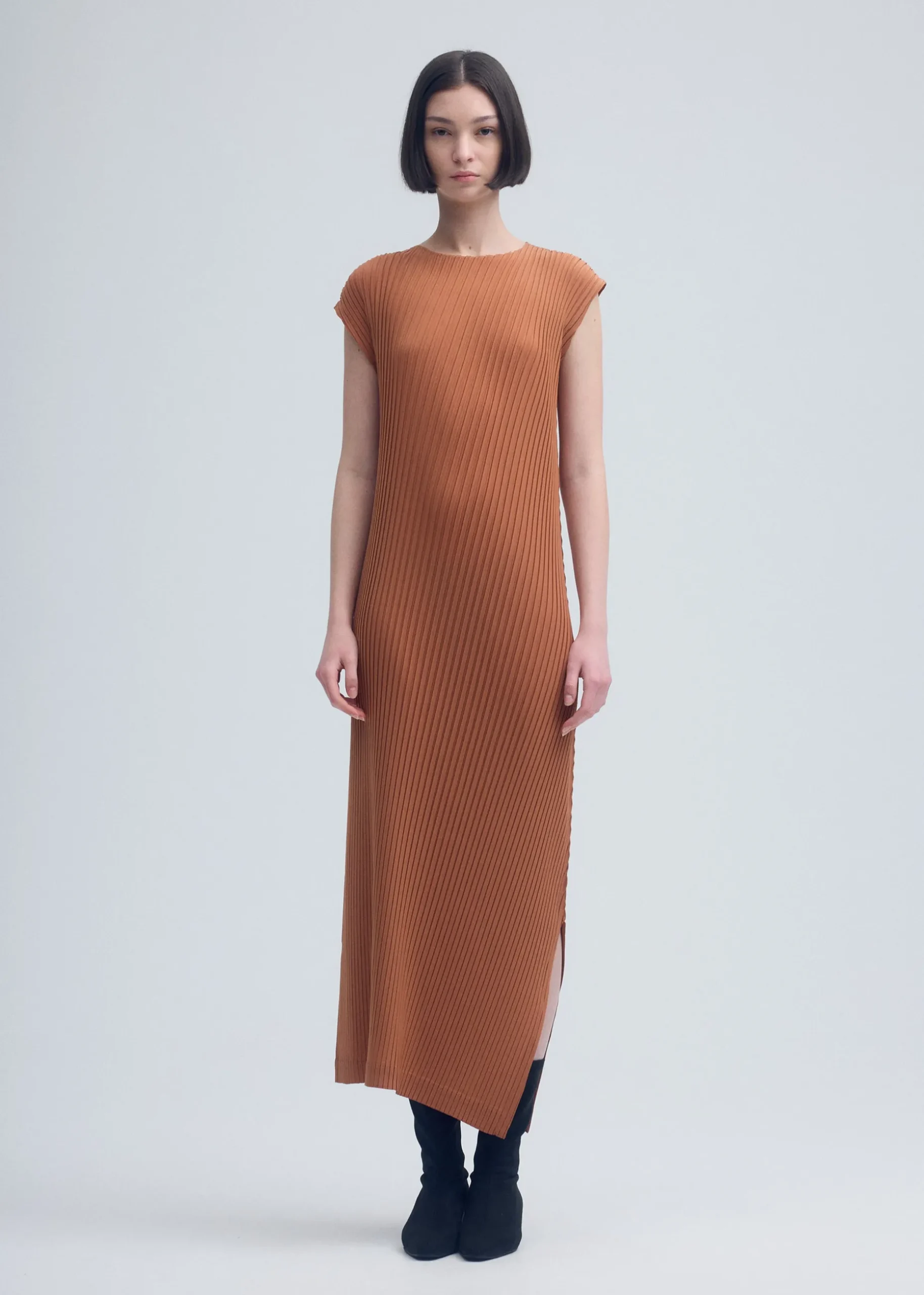 This pleated long dress is characterized by its design that seems to wrap the body, inspired by the concept of “enclothe.” Made from recycled polyester, it combines the unique versatility of solid colors with a flowing pleated design.