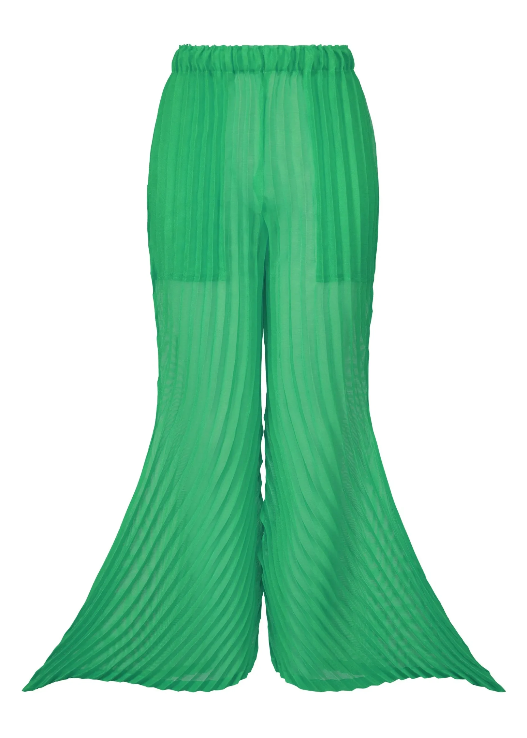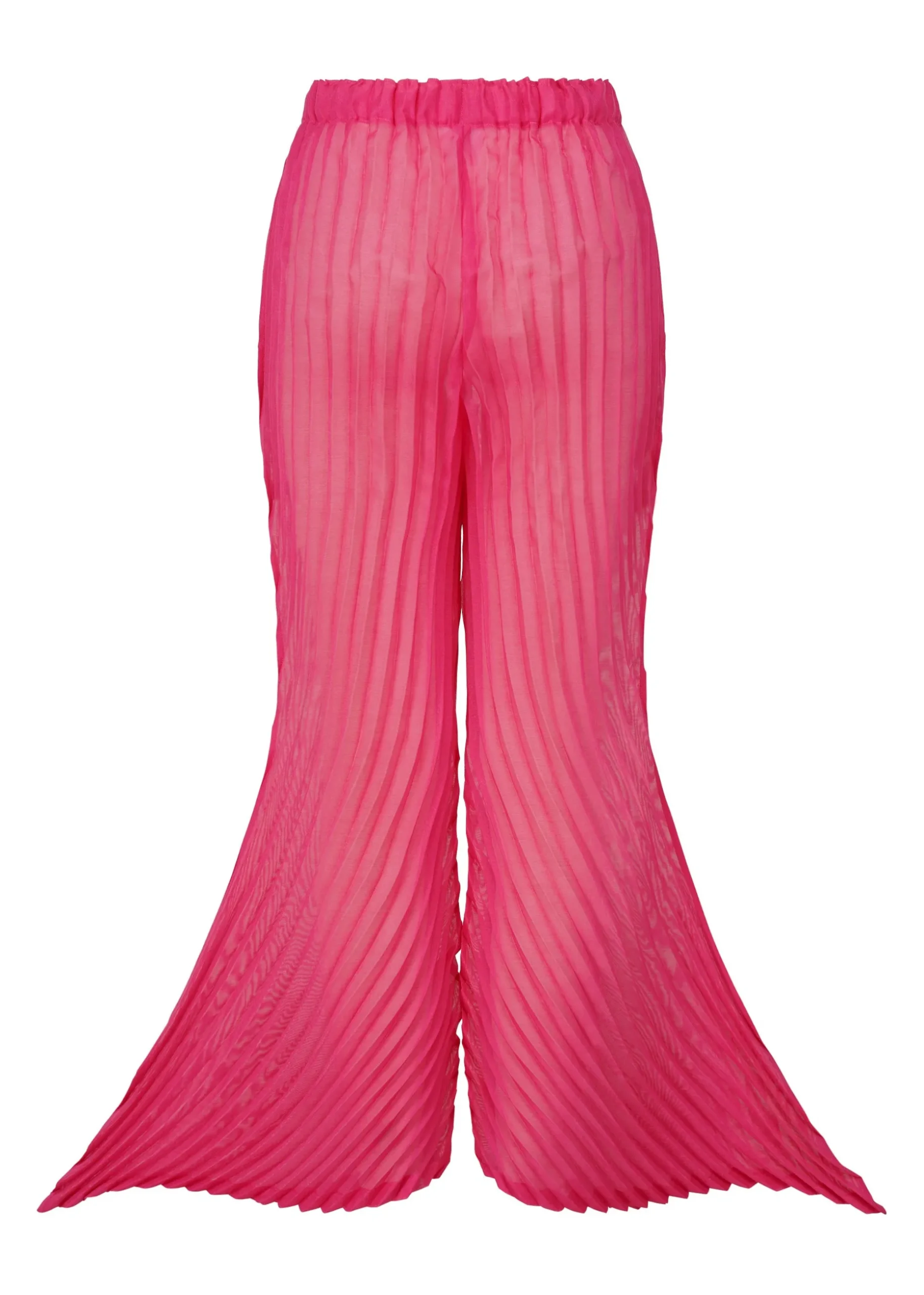 These pleated pants are characterized by their design with leaf-like details as well as their delicate sheerness. The material is made from thin, sheer polyester threads alternately woven with polyester spun threads, giving it a sheer look and taut feel. It is then hand-pleated with a combination of circular and perpendicular patterns to create leaf-like organic shapes. You can enjoy the depths of the pants’ color by layering them in outfits.