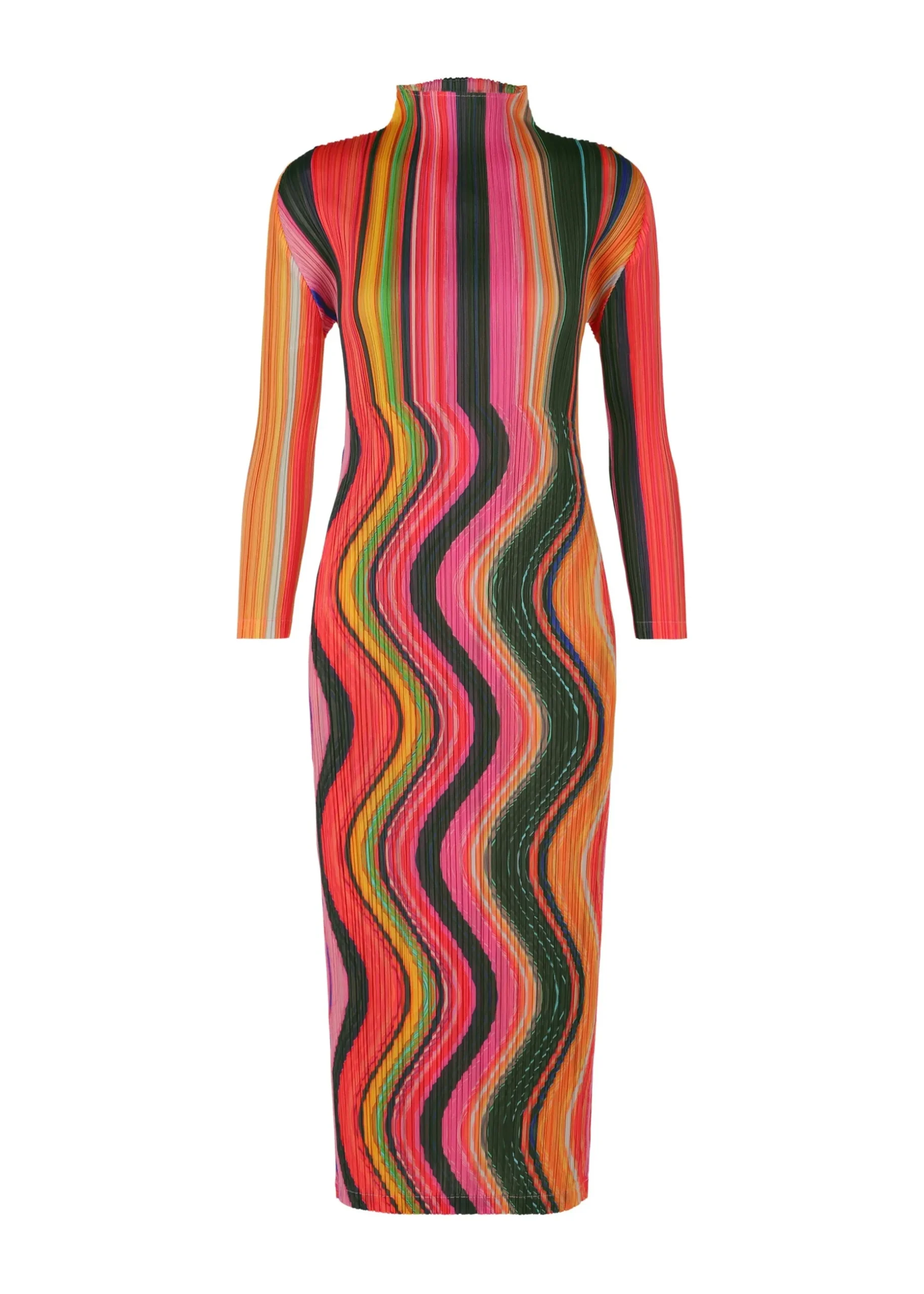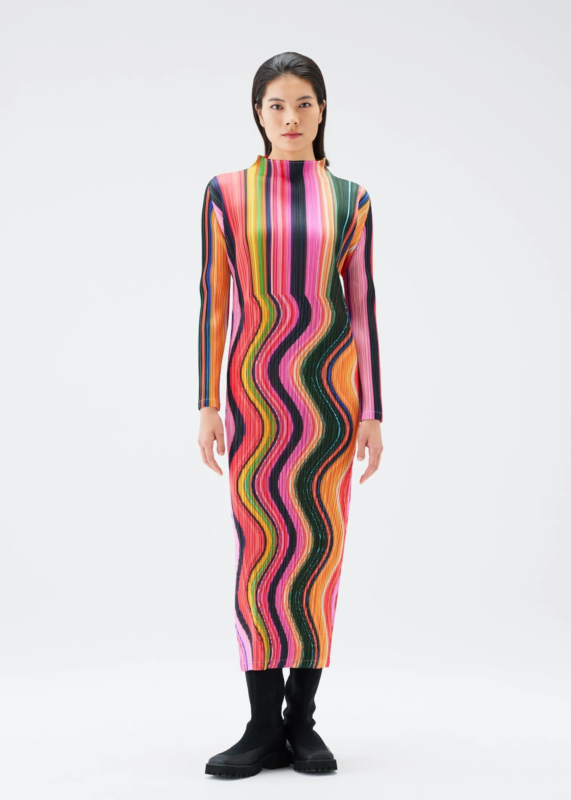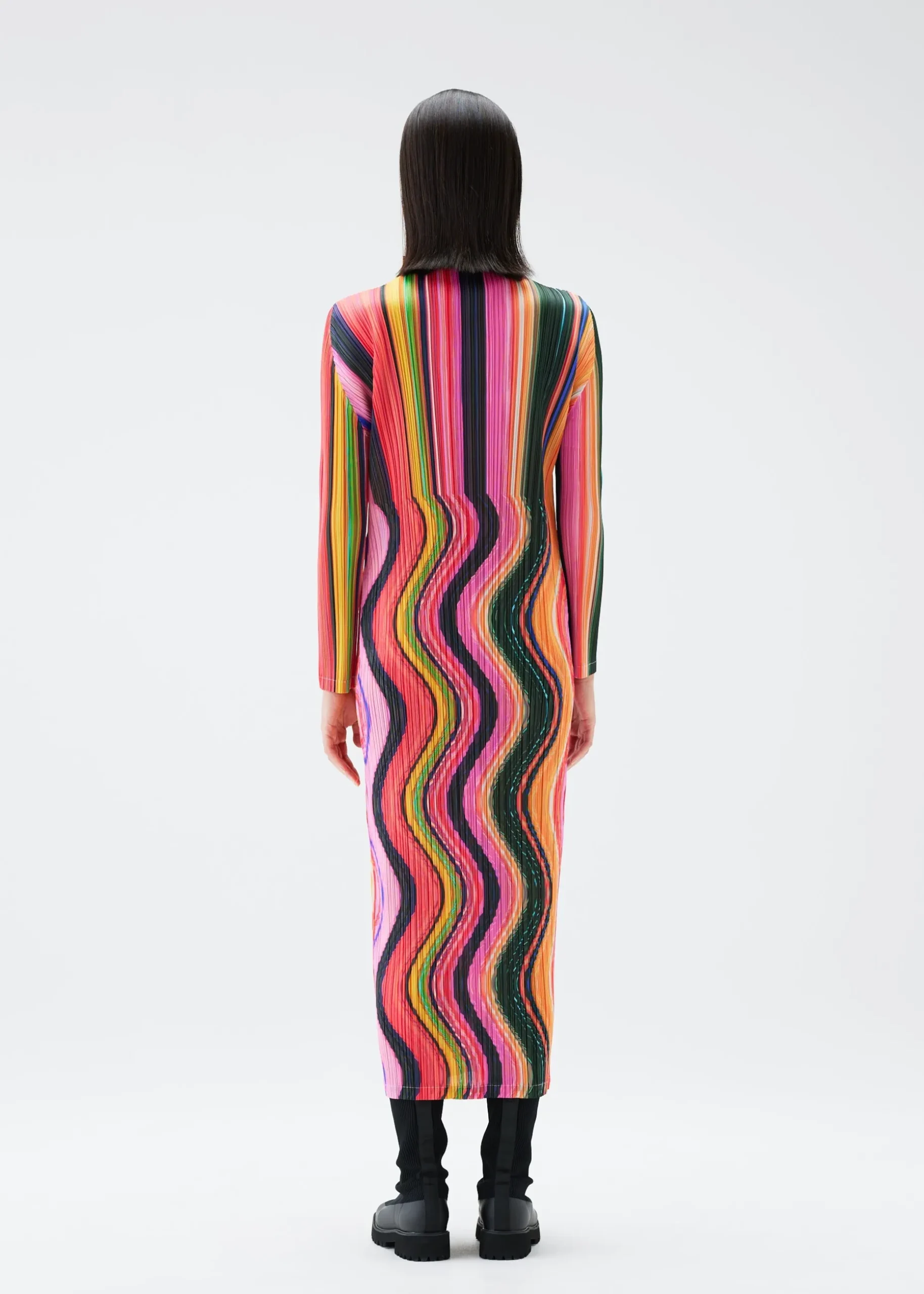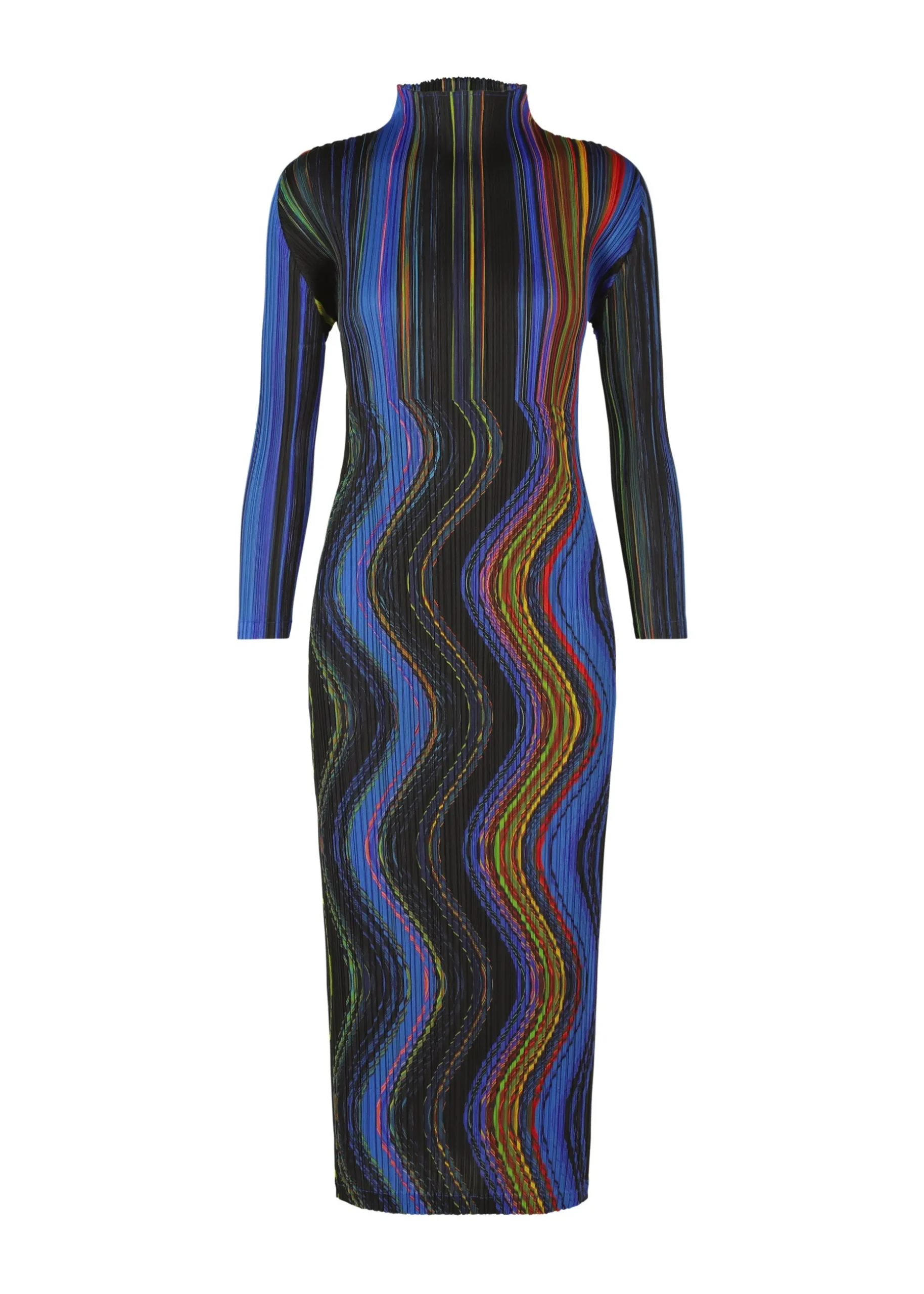 This high-neck, long-sleeved dress has a print that depicts the mysterious space-time continuum passed through when warping. The pattern was created by curving film during photography and then enlarging the photograph.
