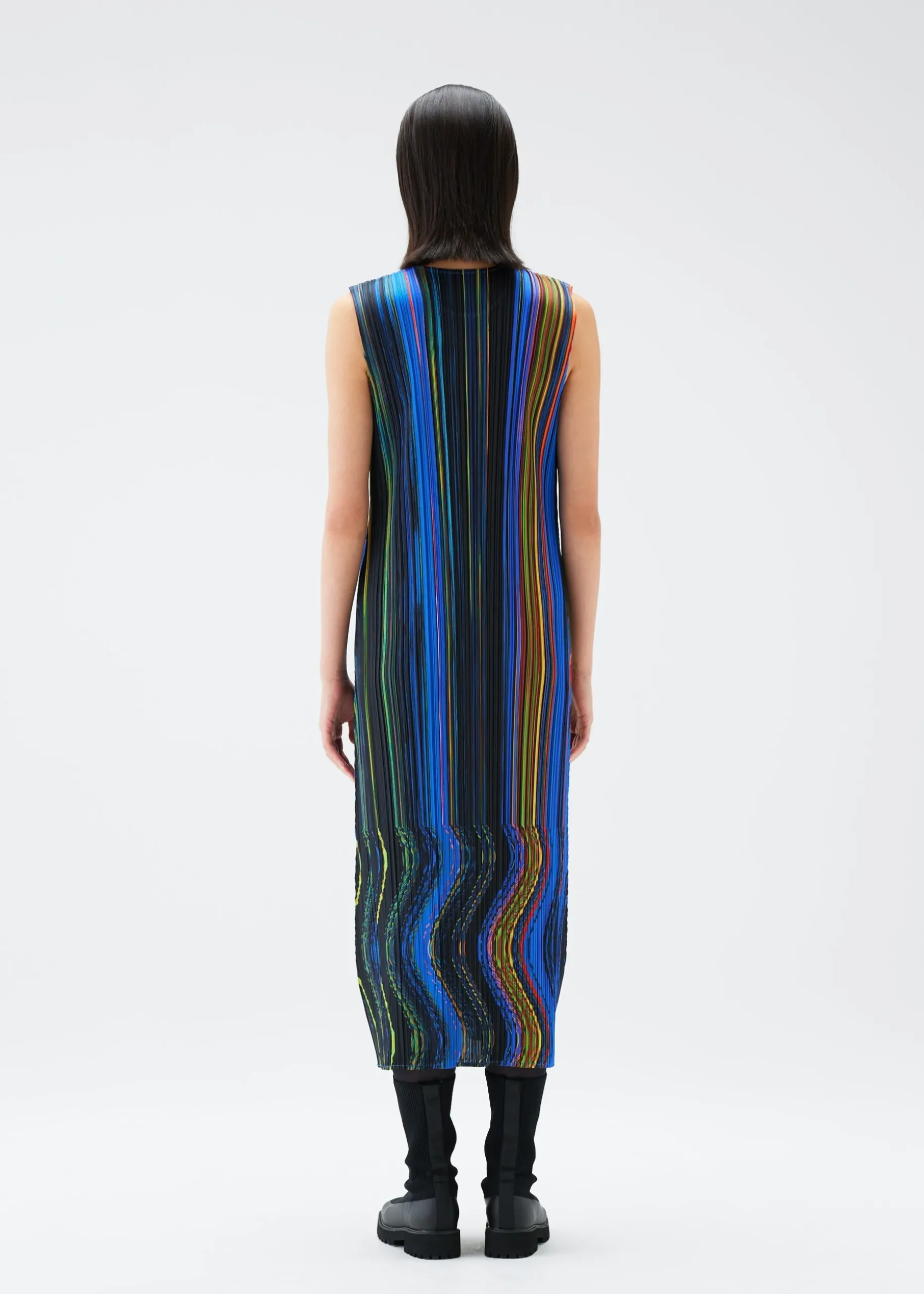 This round-neck, sleeveless dress has a print that depicts the mysterious space-time continuum passed through when warping. The pattern was created by curving film during photography and then enlarging the photograph.
