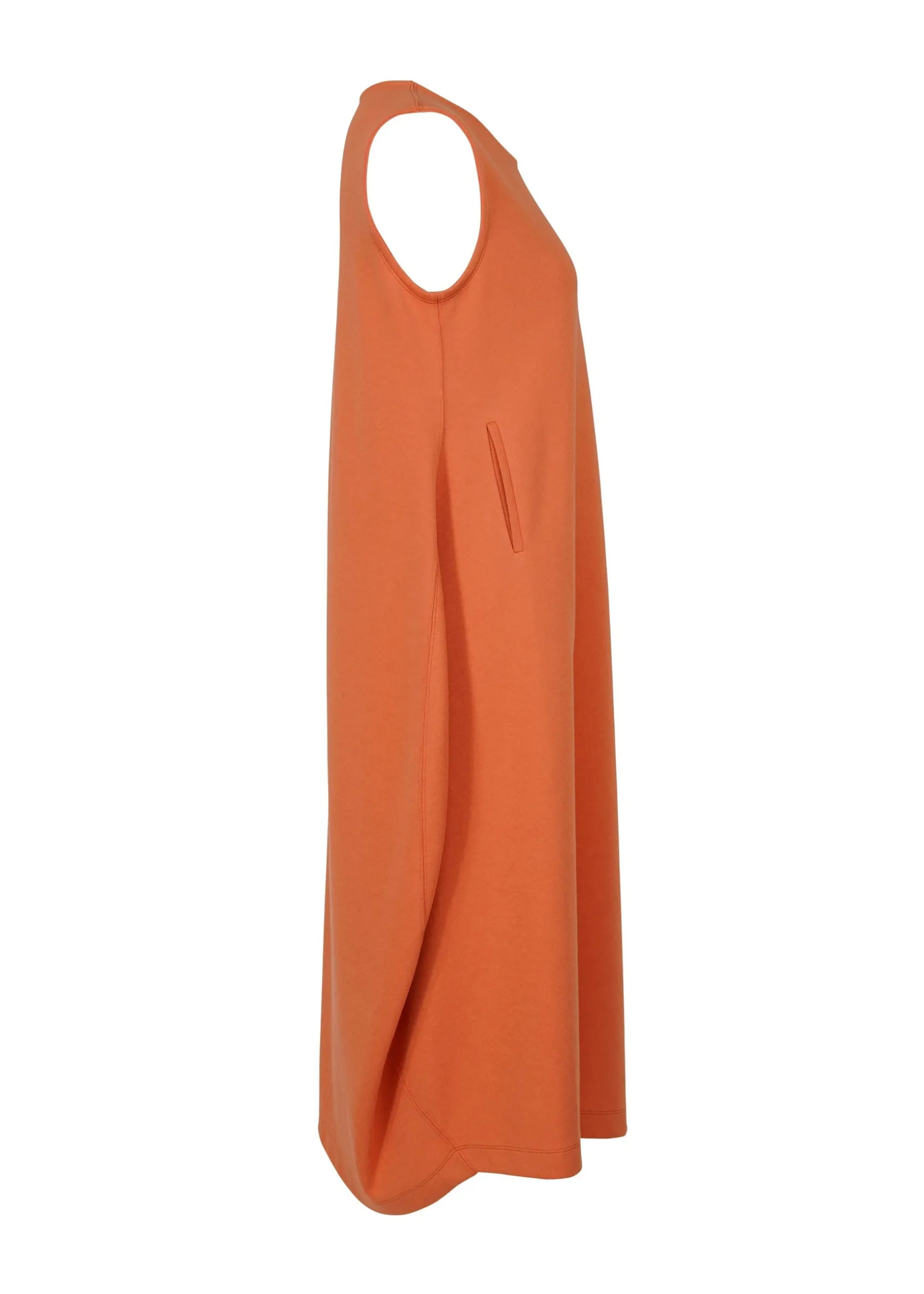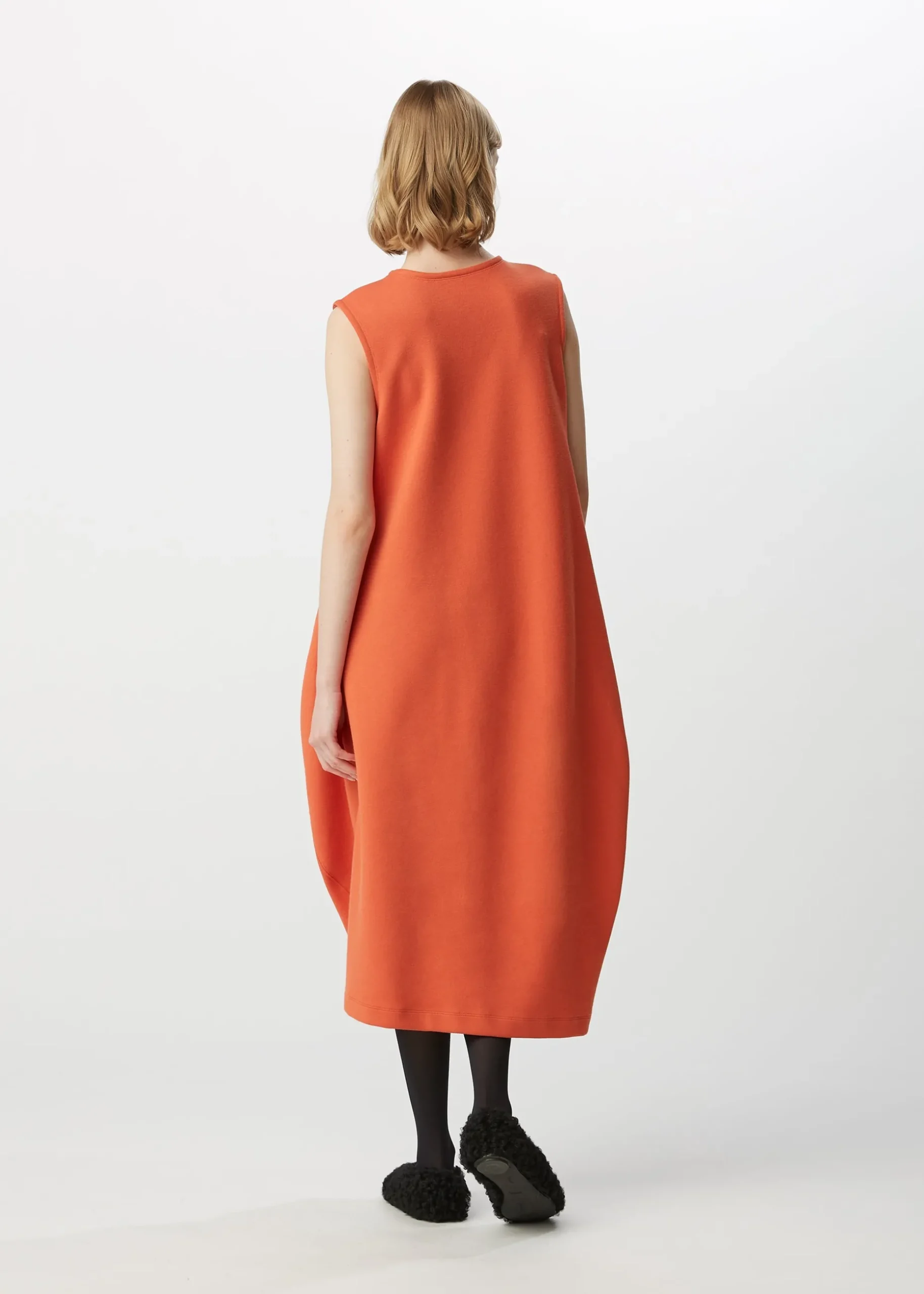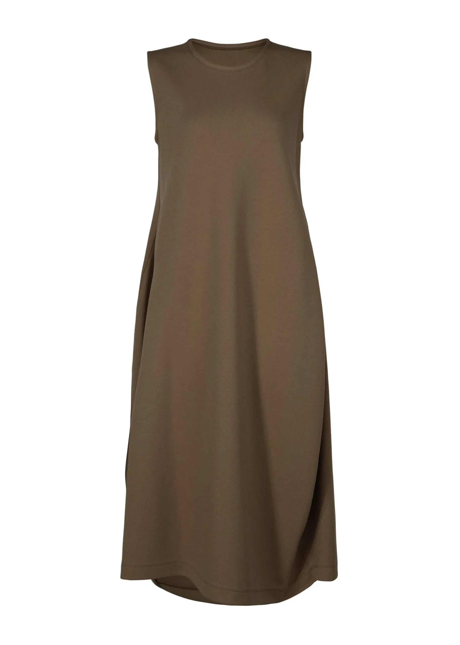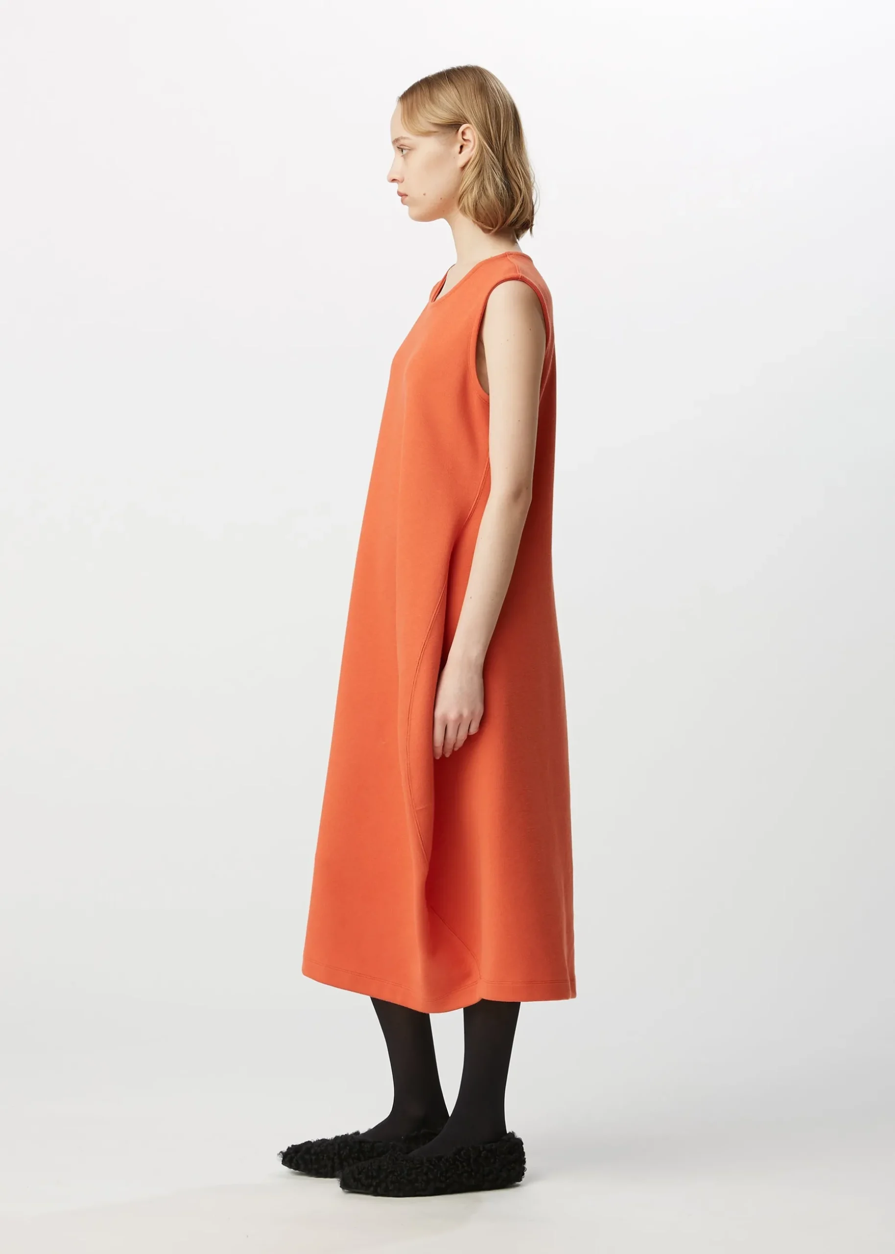 This dress is made from supple jersey material that stretches in both the vertical and horizontal directions. Organic cotton is used for the front and recycled polyester for the lining. This dress is characterized by their curved cut lines that look like waves.