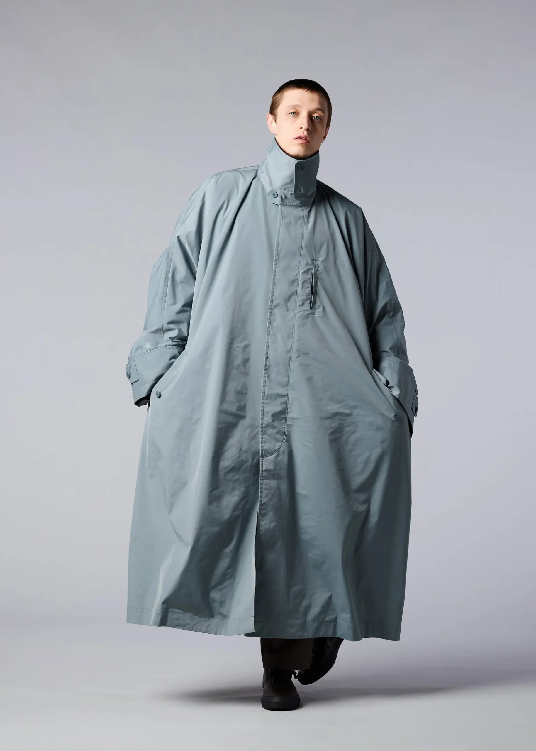 This coat is characterized by its wide width, dolman sleeves that flow smoothly to the ends, and long length. The polyester taffeta fabric uses high multi-thread yarns for the warp threads, and is characterized by its stretch, smooth texture, and matte luster.