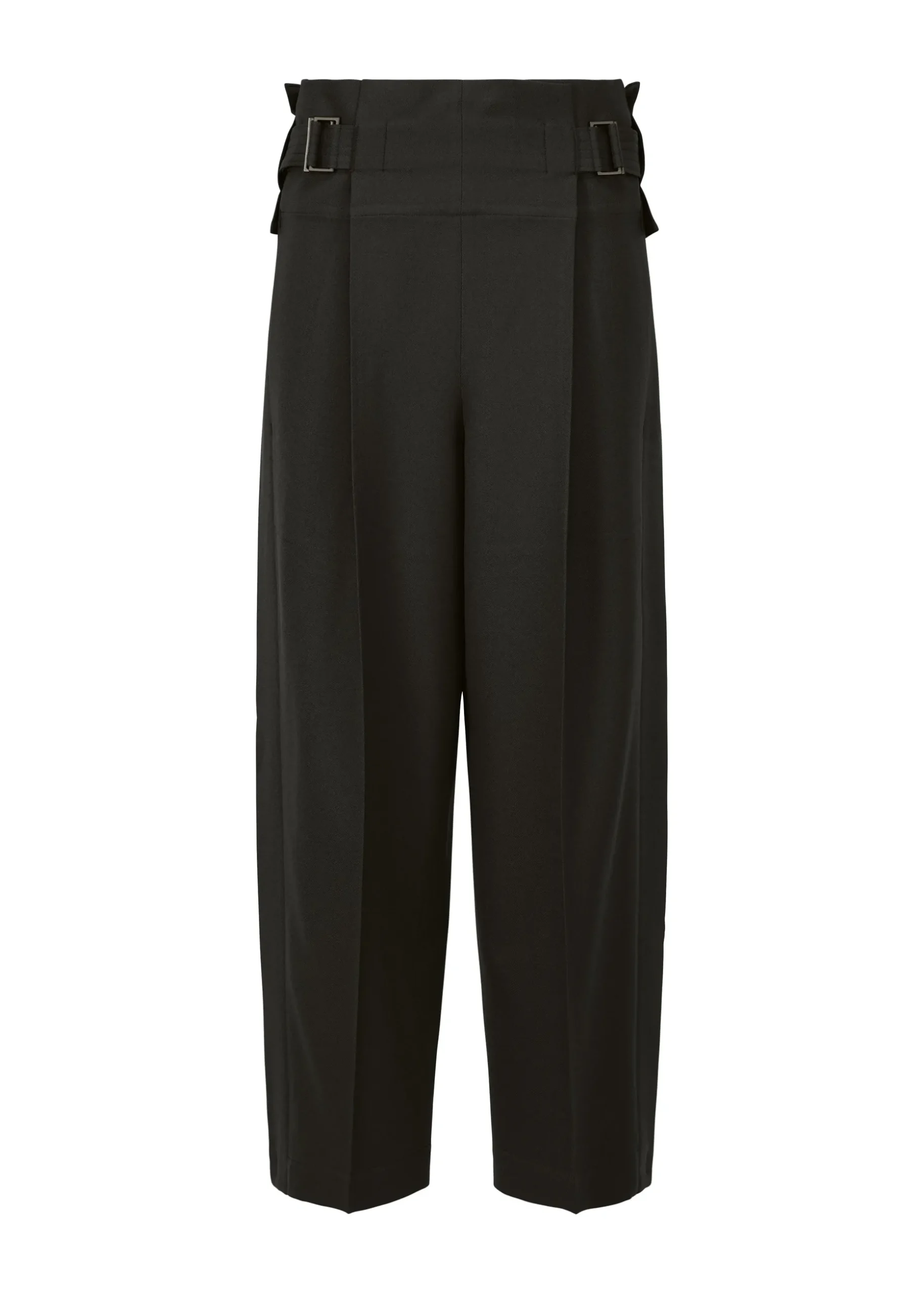 These pants are made from wool-like recycled polyester fabric with tucks that folds flat.