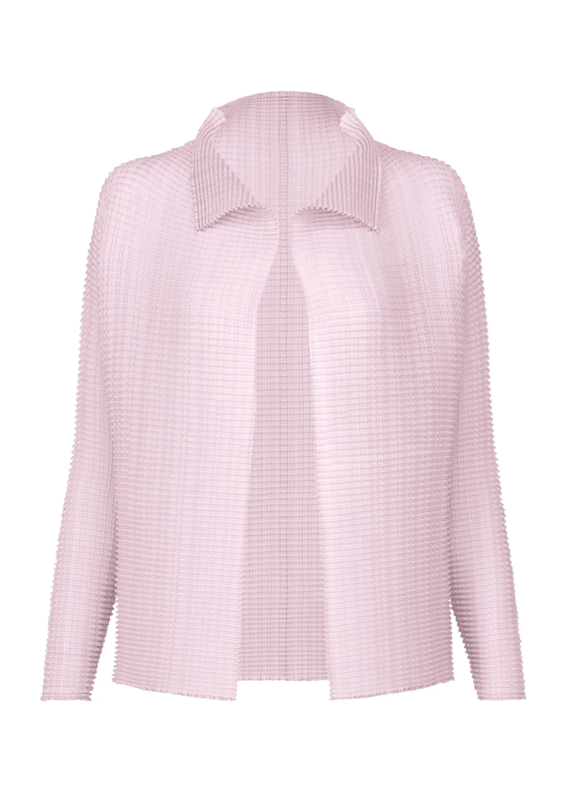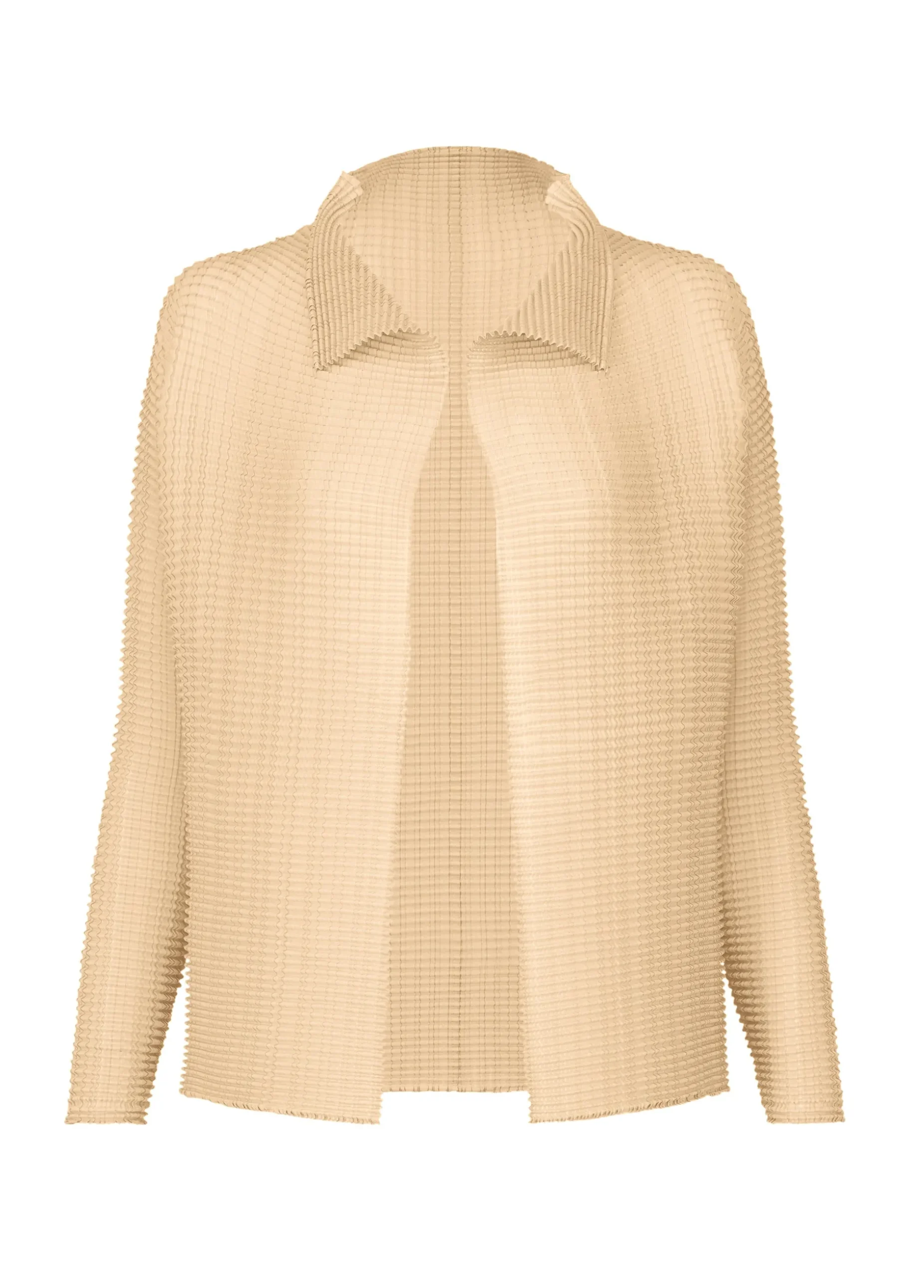 A stretchy long-sleeved cardigan made of recycled polyester fabric with vertical and horizontal pleats.