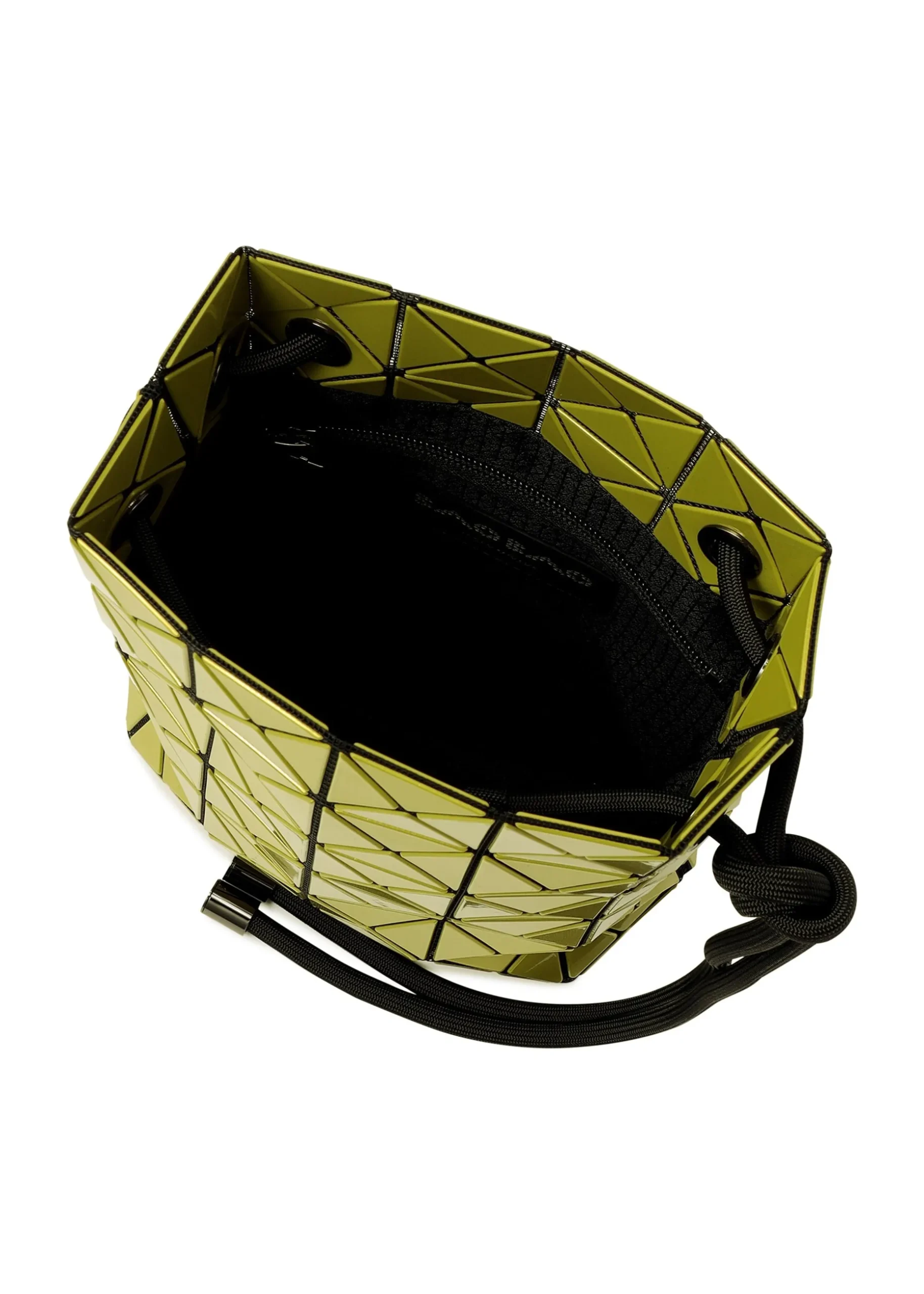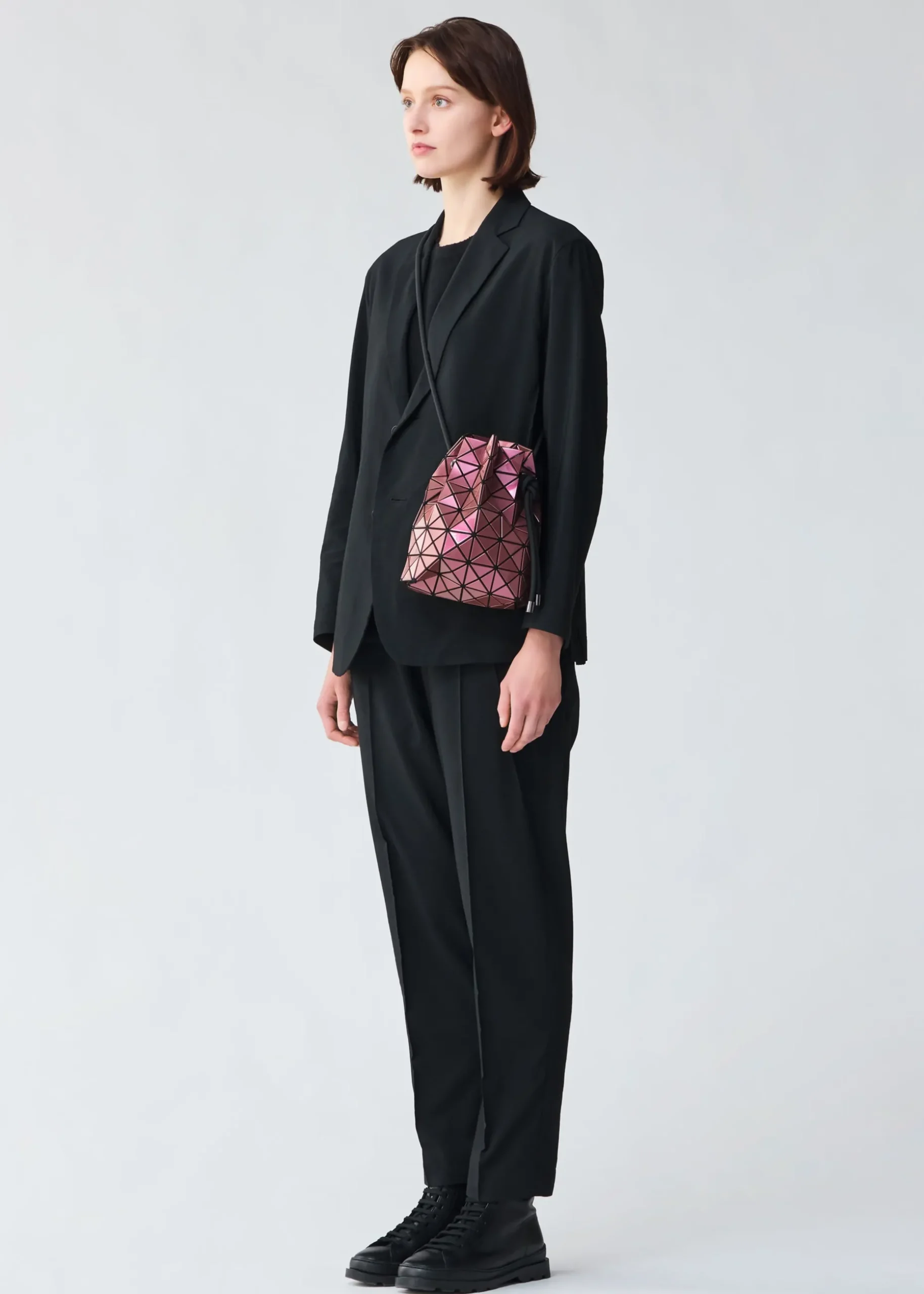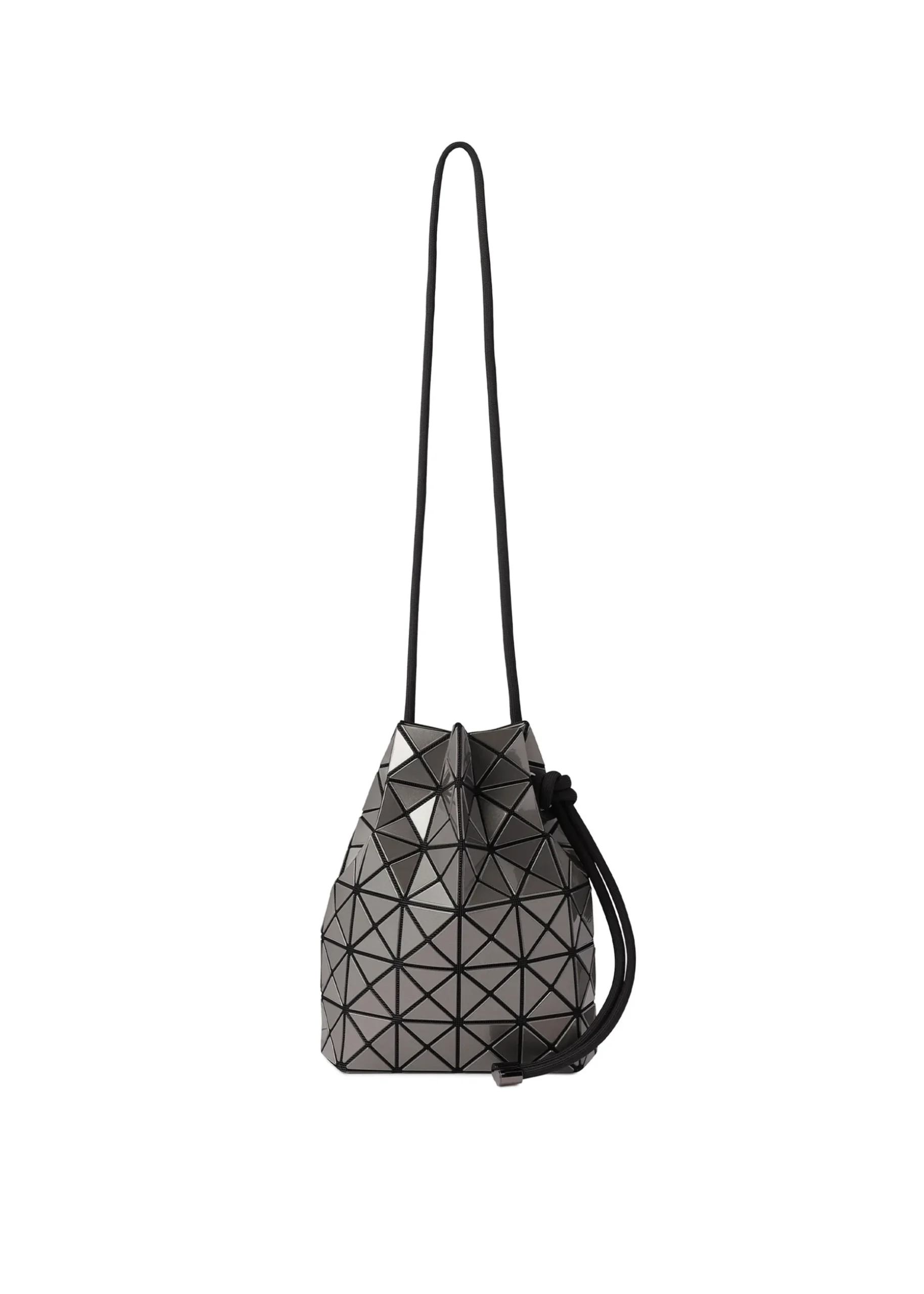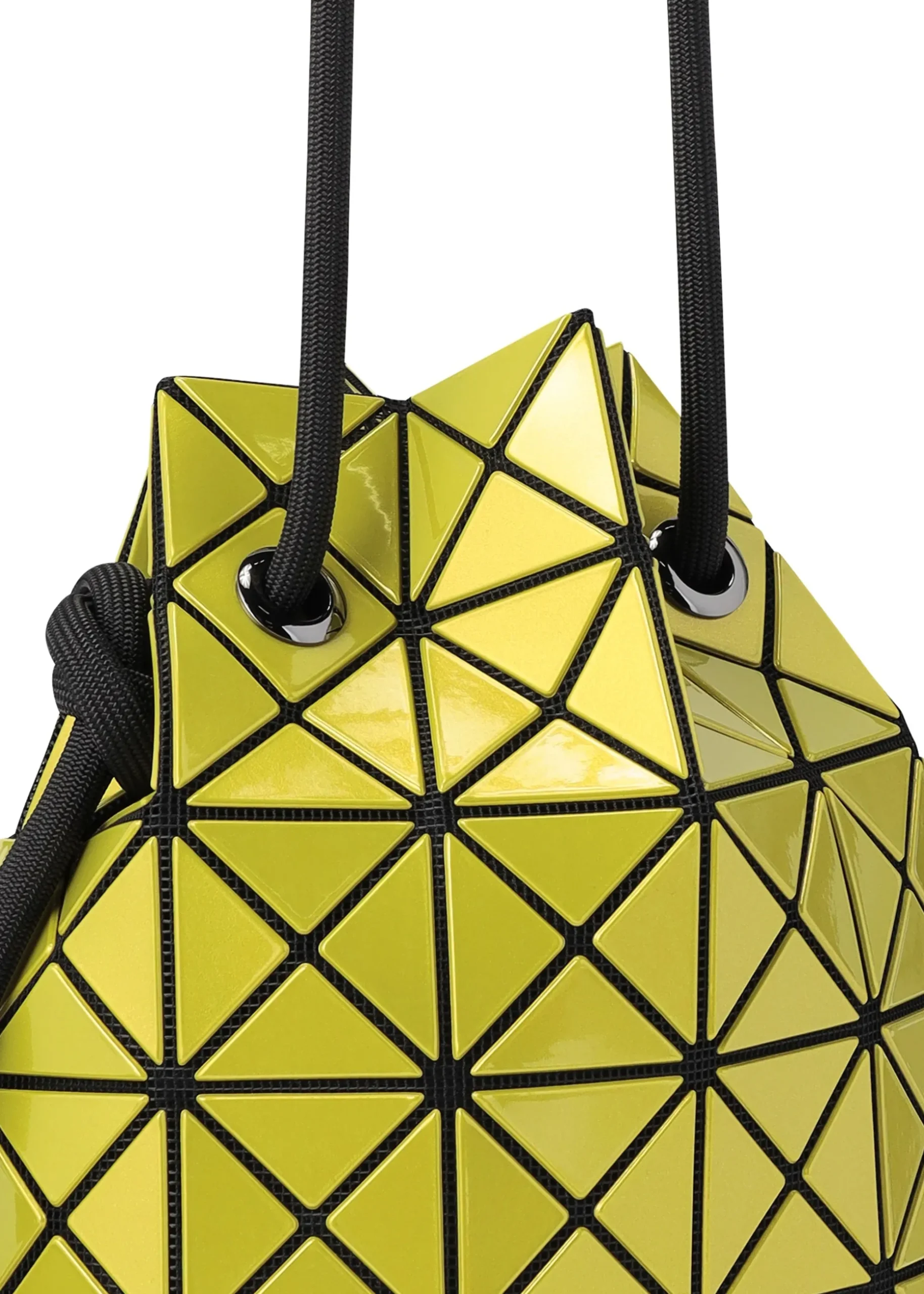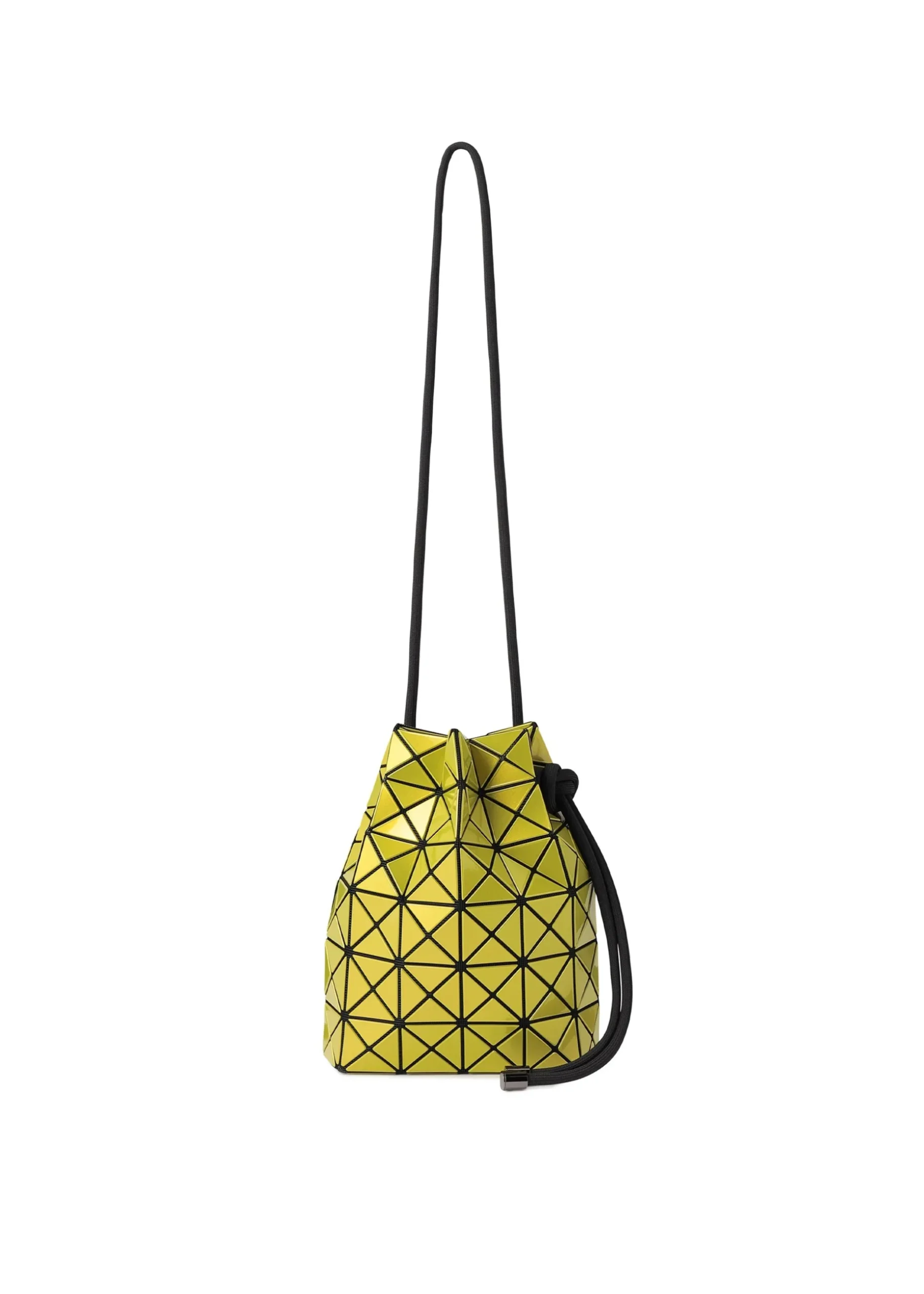 This drawstring bag is made from polarized metallic enamel material. The triangular pieces beautifully change colors depending on the angle of view. When the cord is tightened, the bag becomes three-dimensional, and the enamel material reflects the light to create abundant looks. The design allows the bag to be carried in two ways: as a cross-body bag when the cord is a single layer, or as a shoulder bag when it is doubled up.