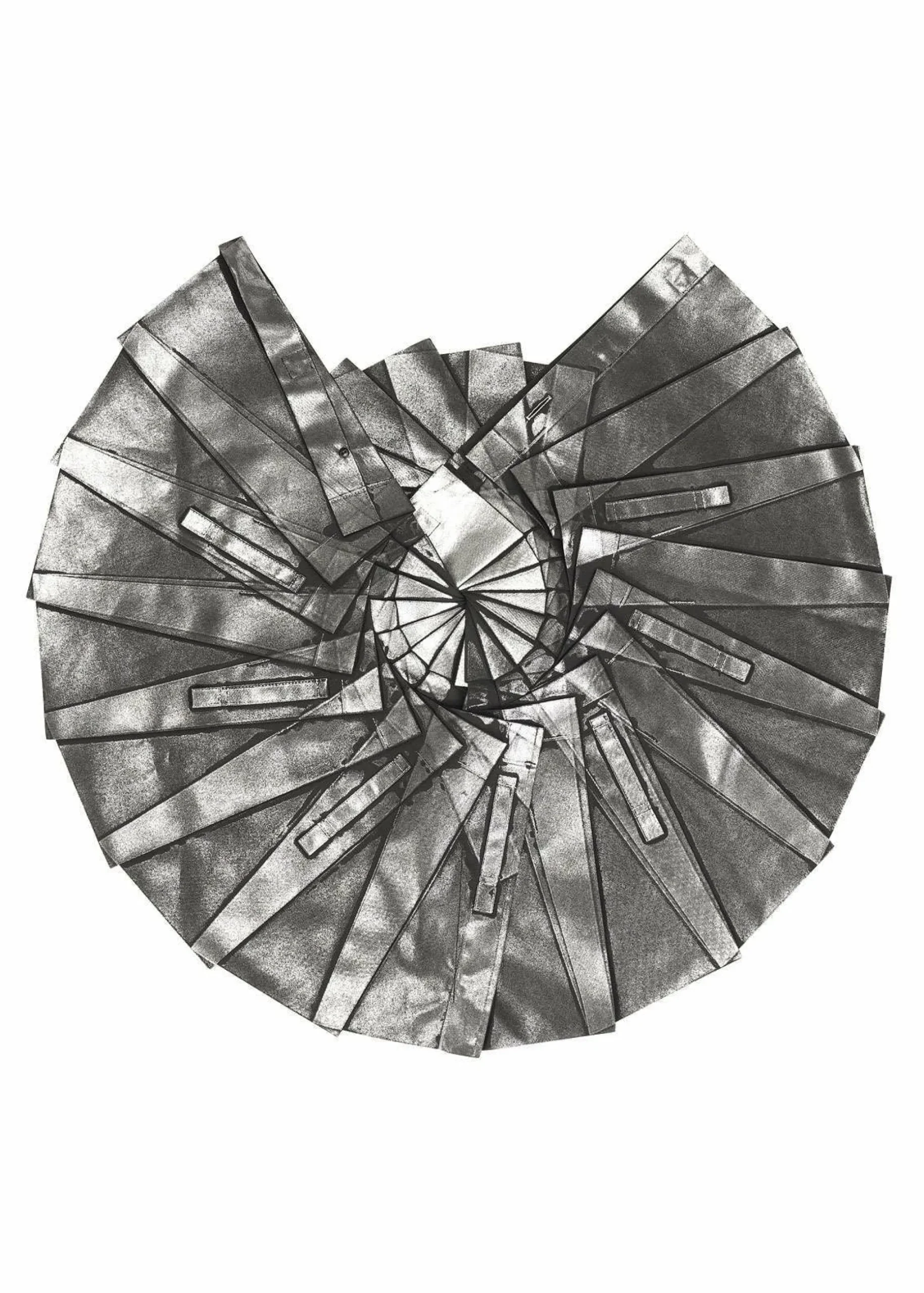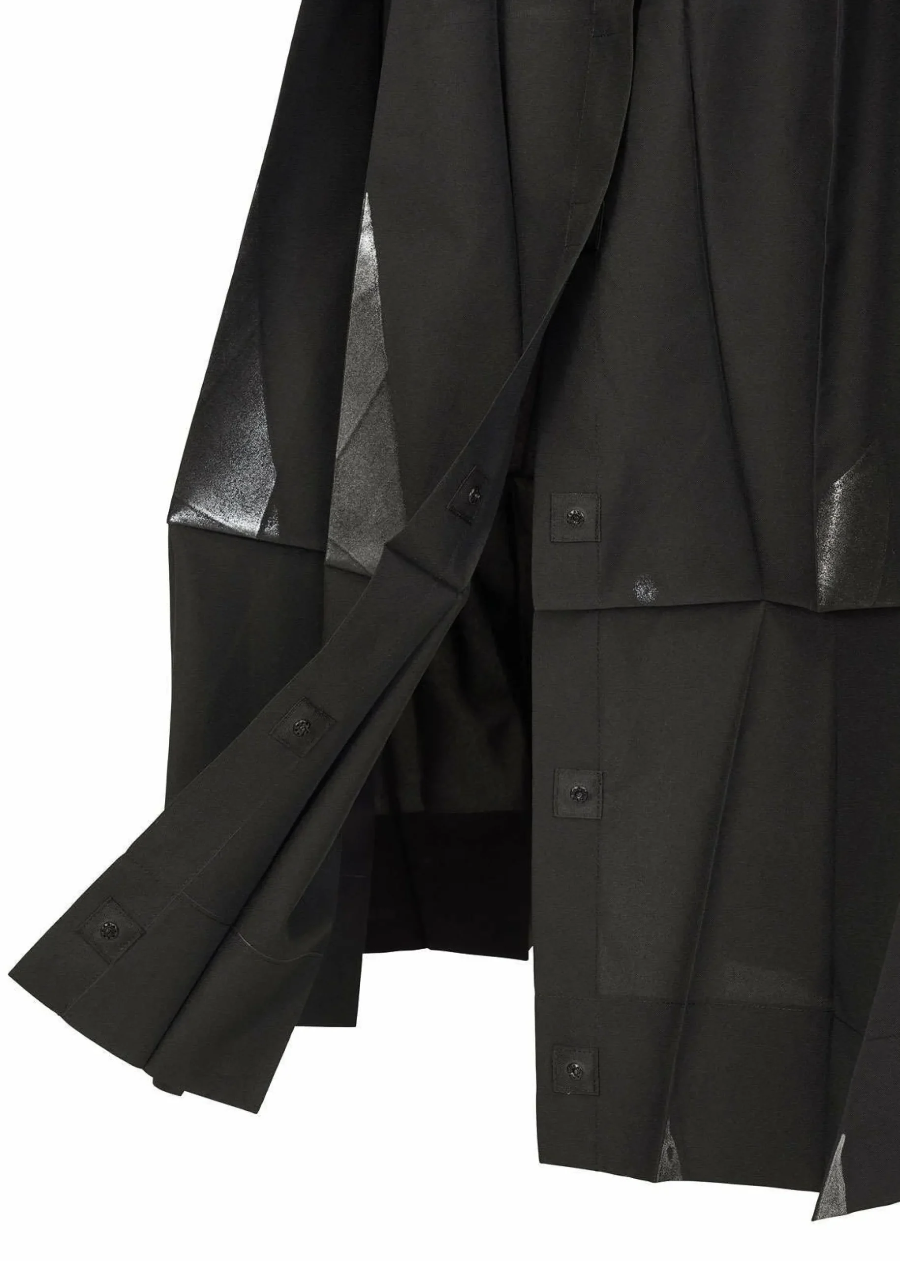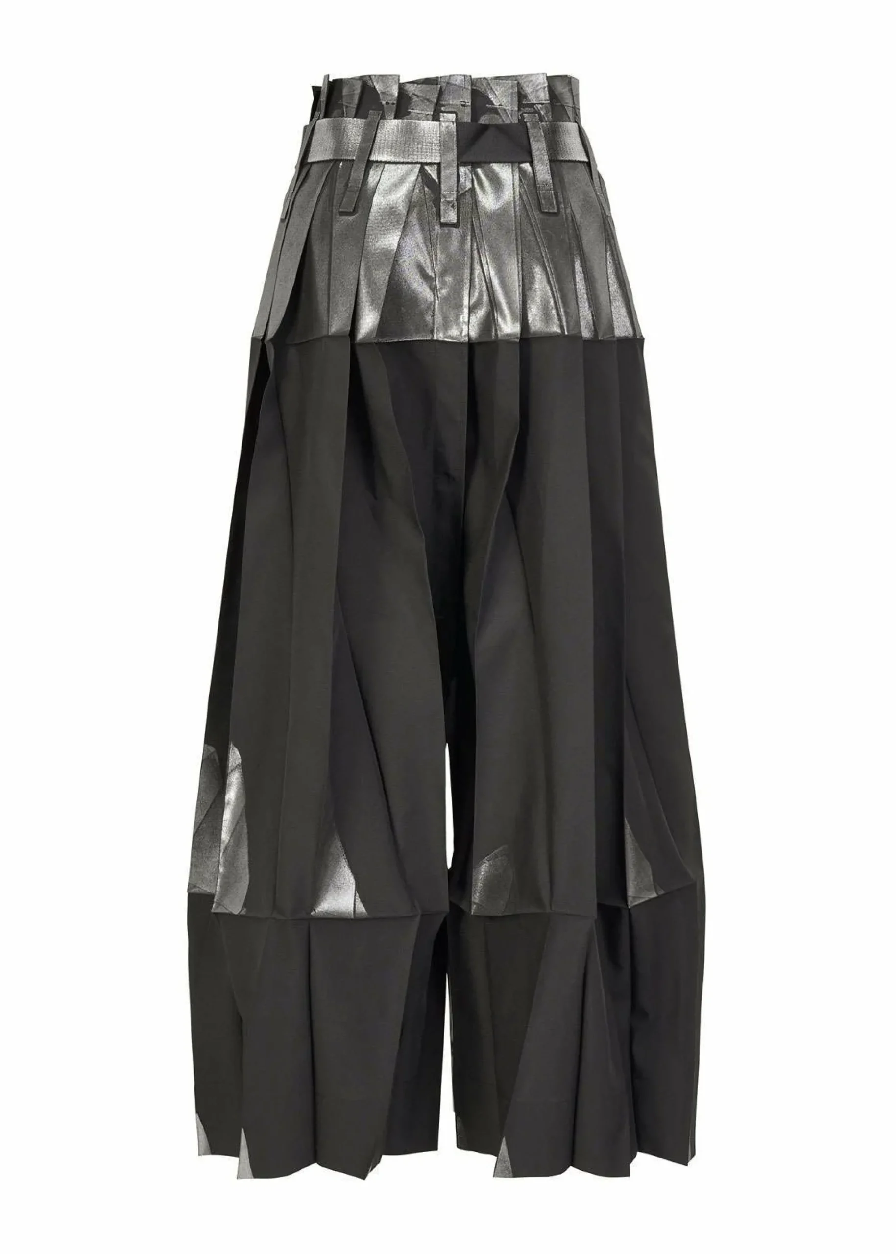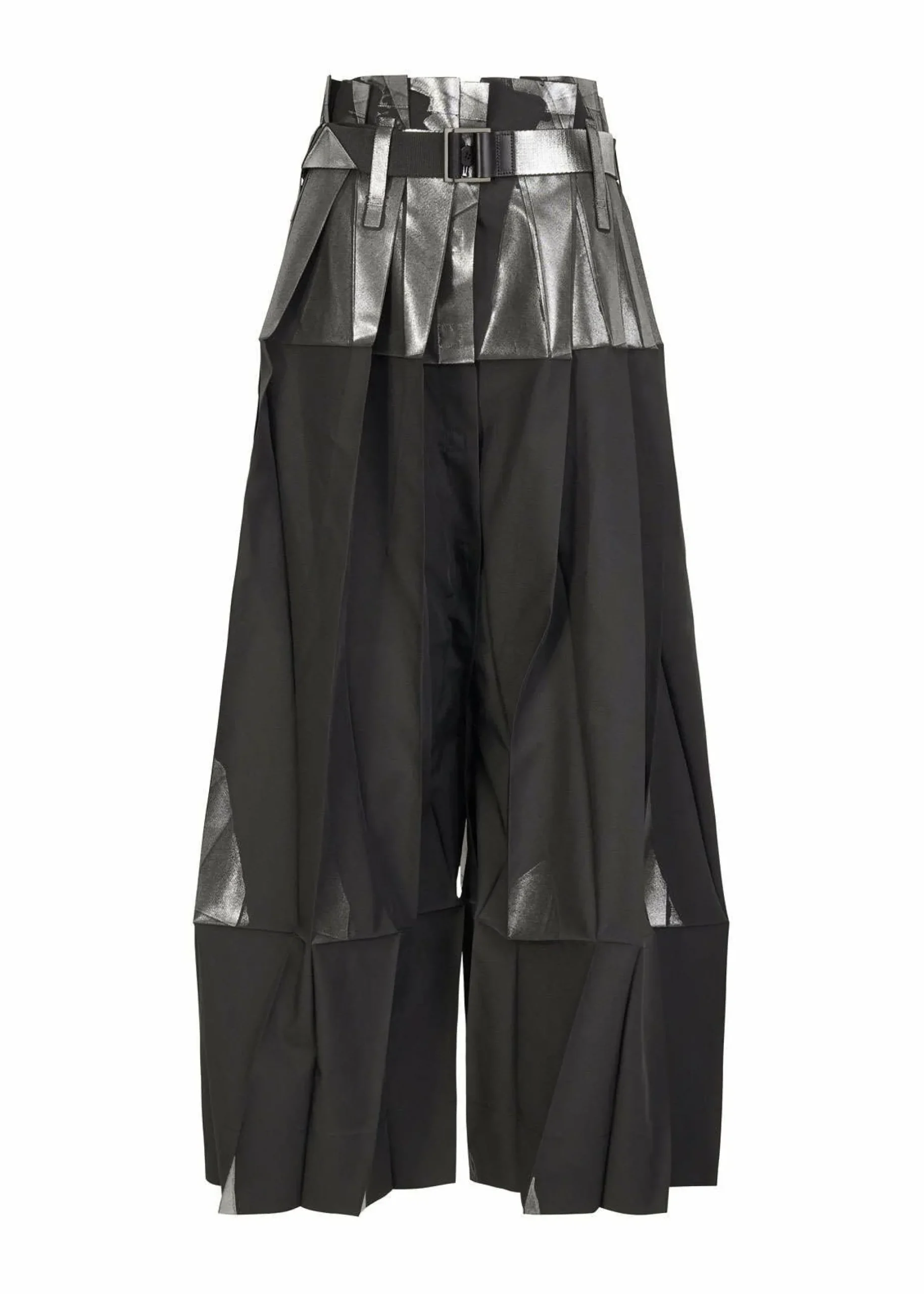 Pants made from recycled polyester fabric. By applying foil while folded flat, the foil scatters and creates shadows when worn. By replacing the snap buttons, it can also be worn as a skirt. It has a flat design when folded.
