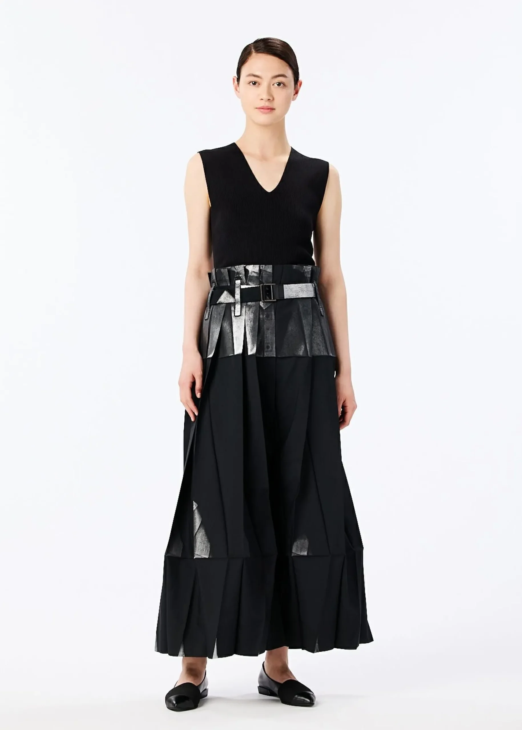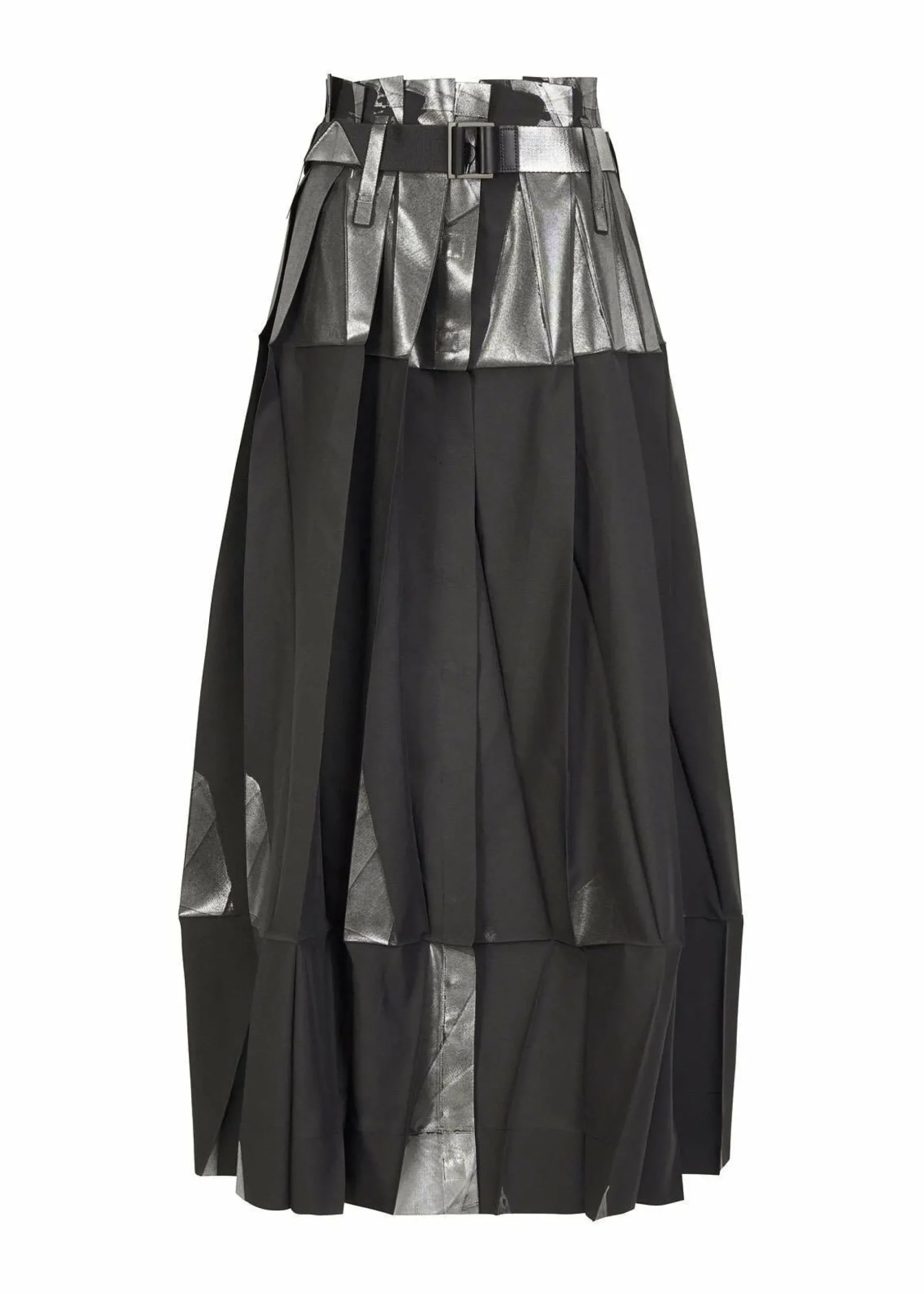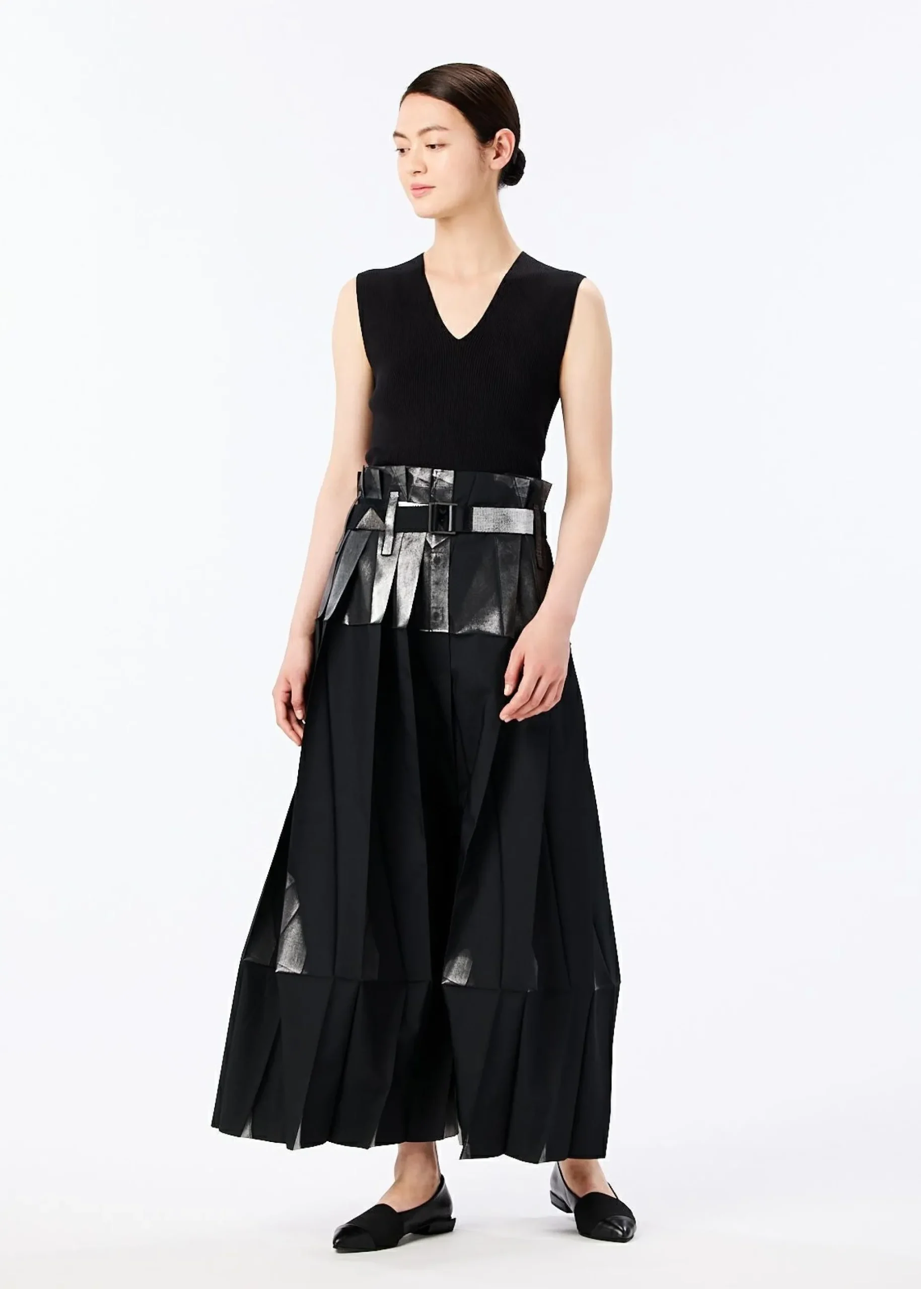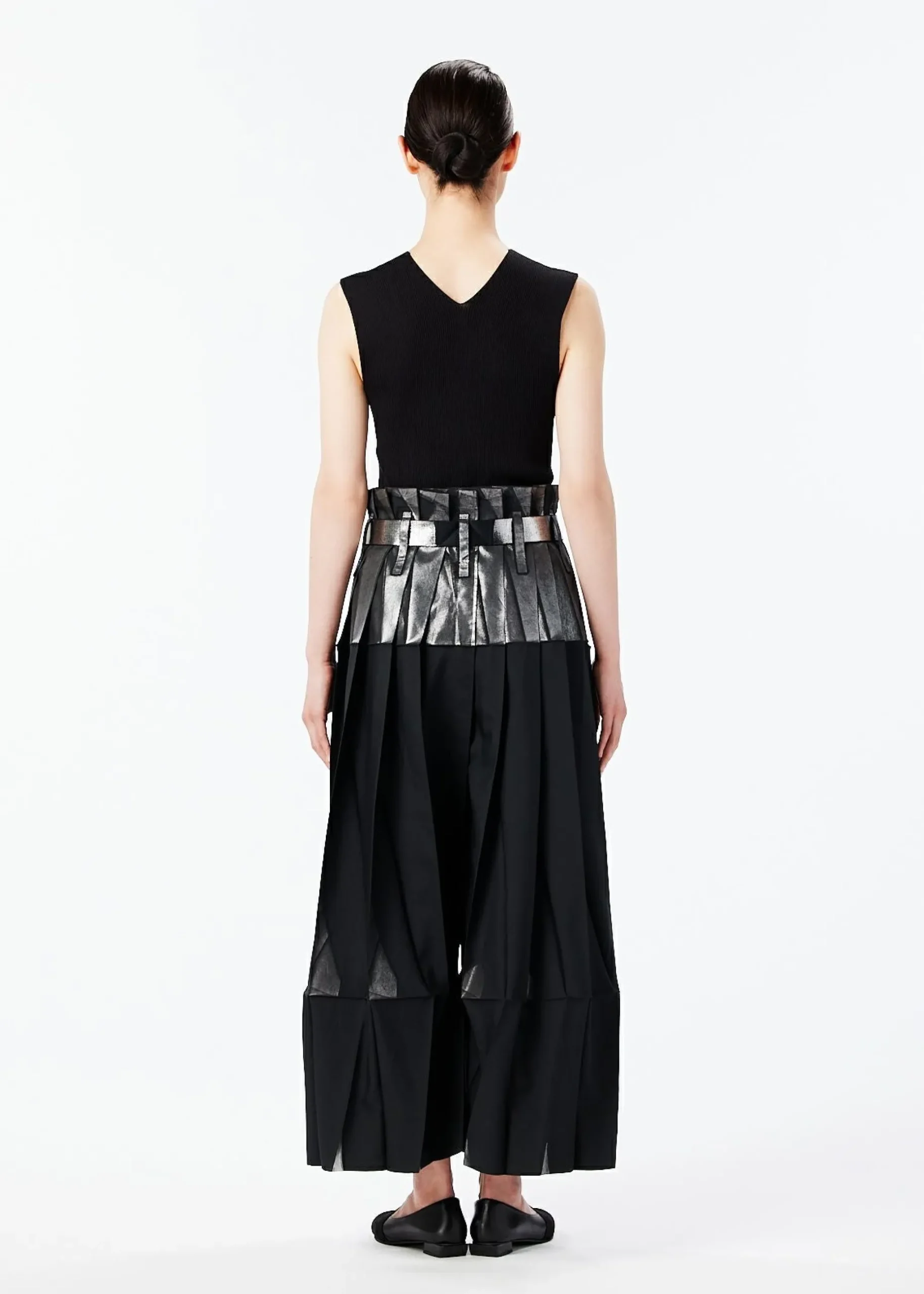 Pants made from recycled polyester fabric. By applying foil while folded flat, the foil scatters and creates shadows when worn. By replacing the snap buttons, it can also be worn as a skirt. It has a flat design when folded.