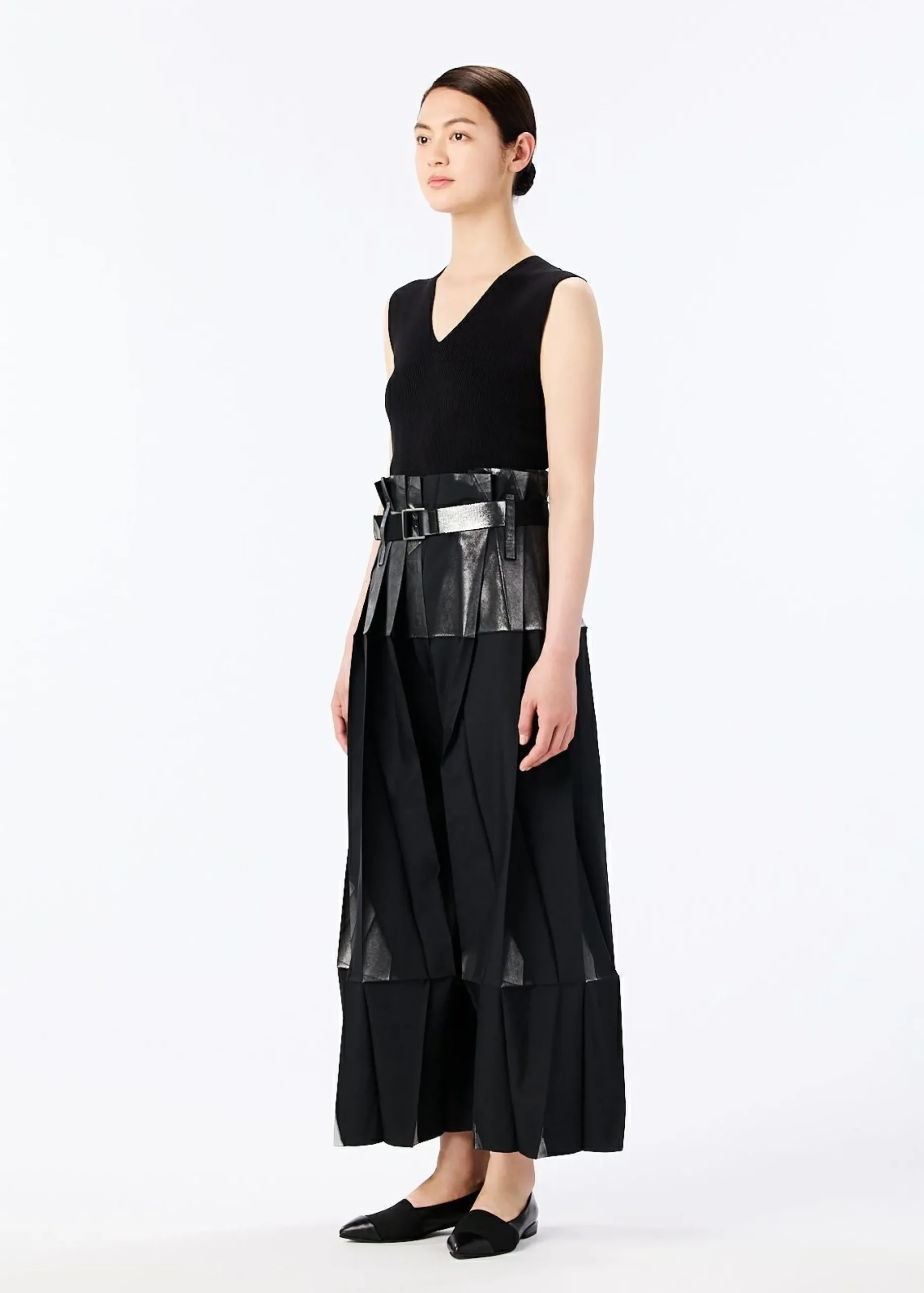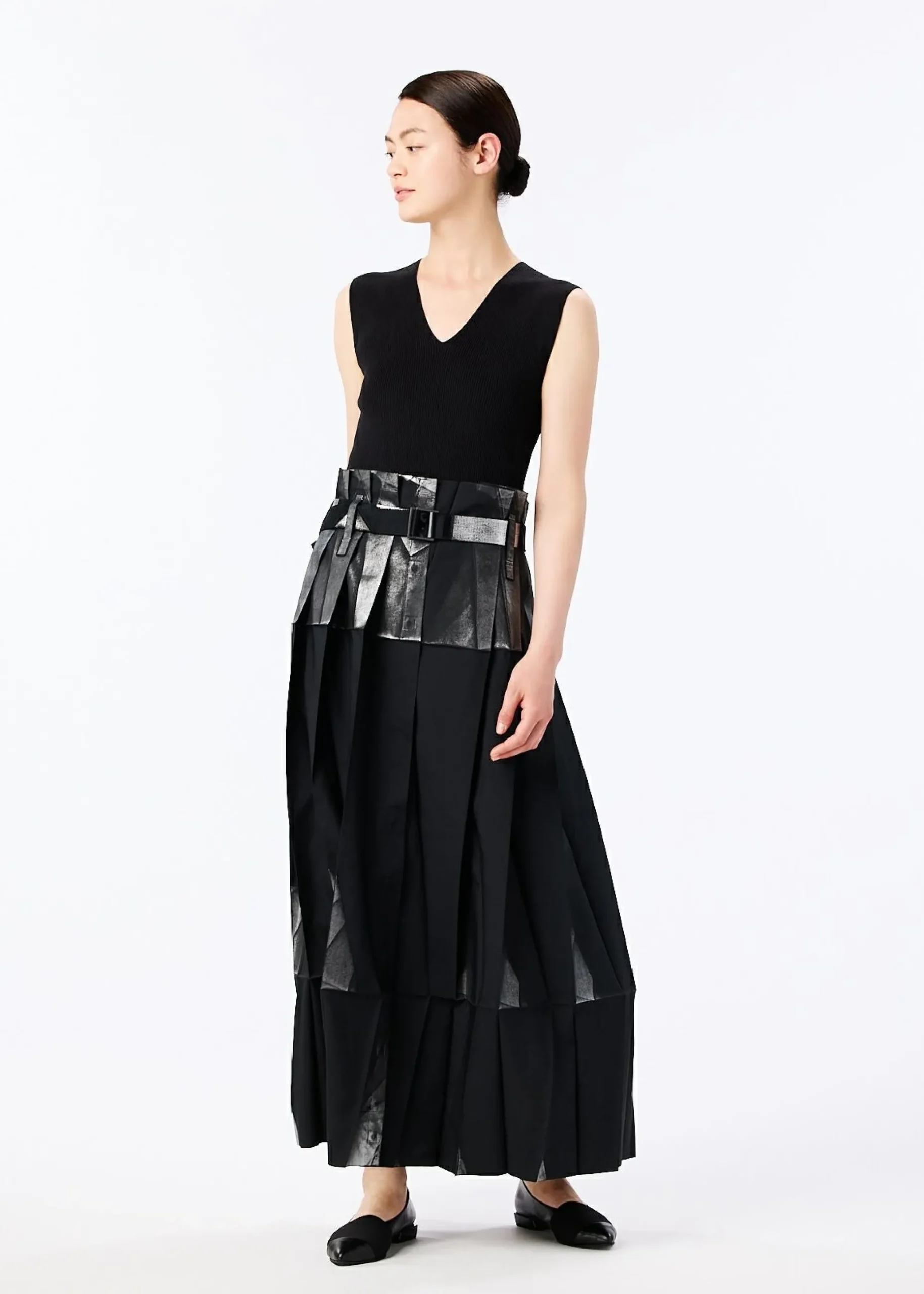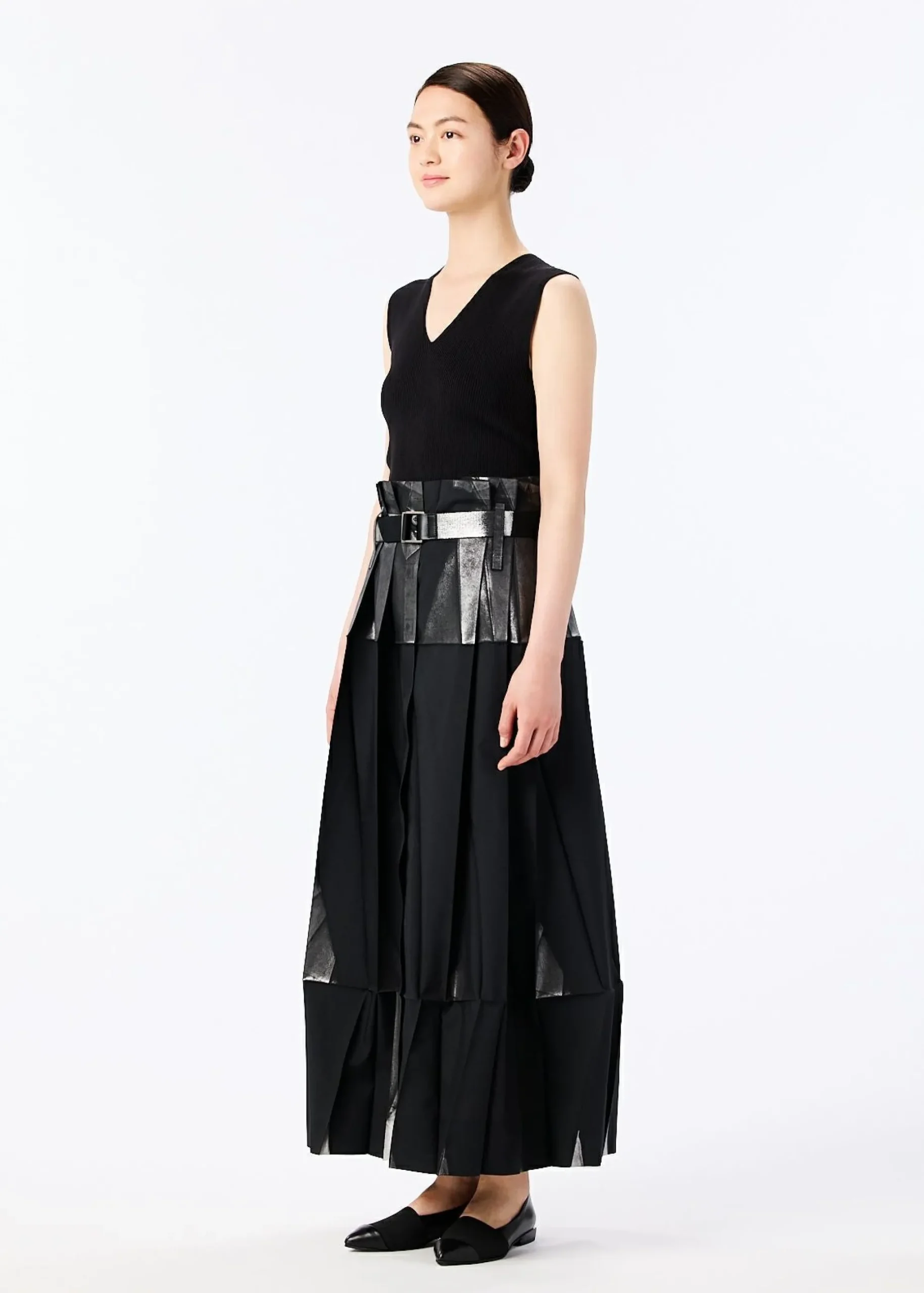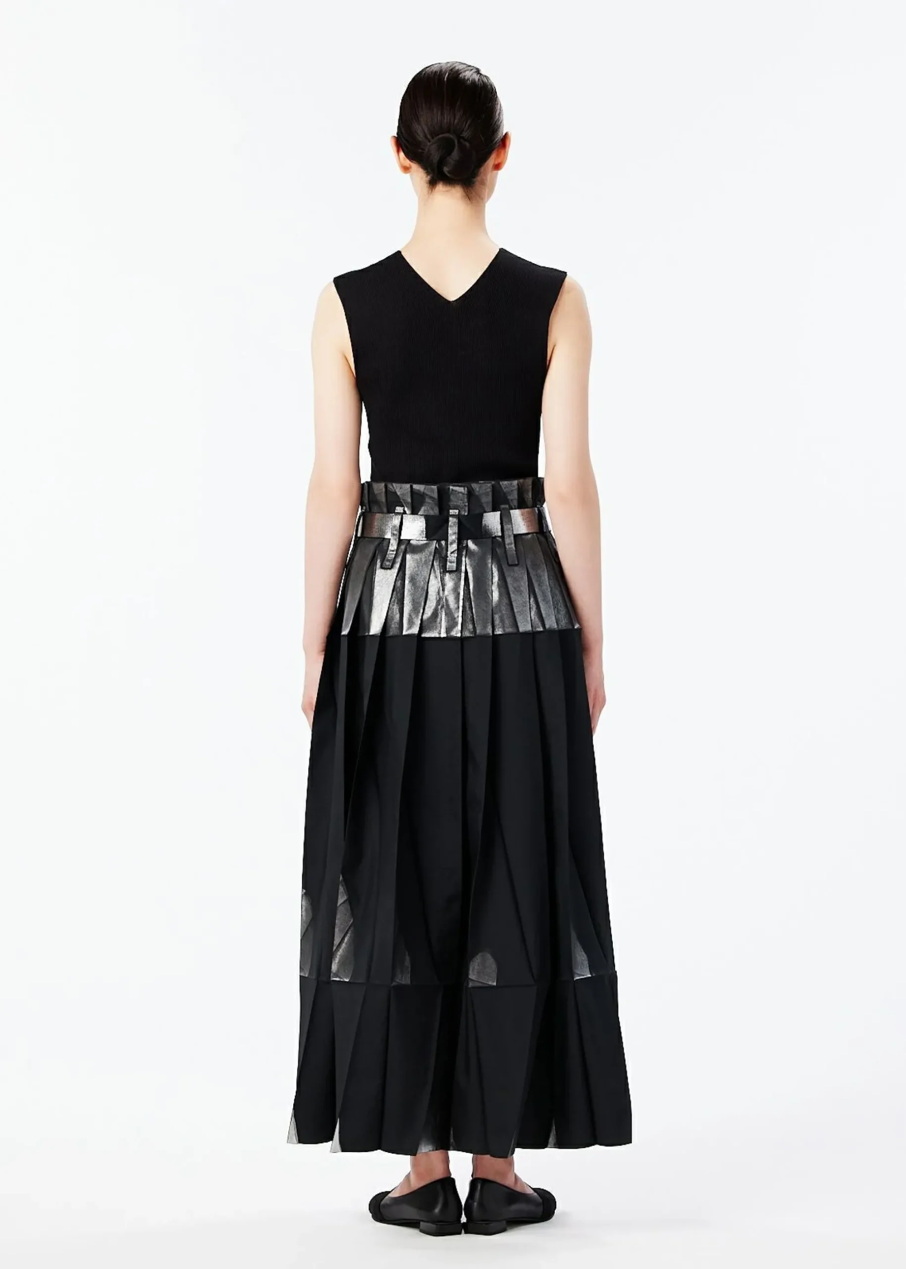 Pants made from recycled polyester fabric. By applying foil while folded flat, the foil scatters and creates shadows when worn. By replacing the snap buttons, it can also be worn as a skirt. It has a flat design when folded.