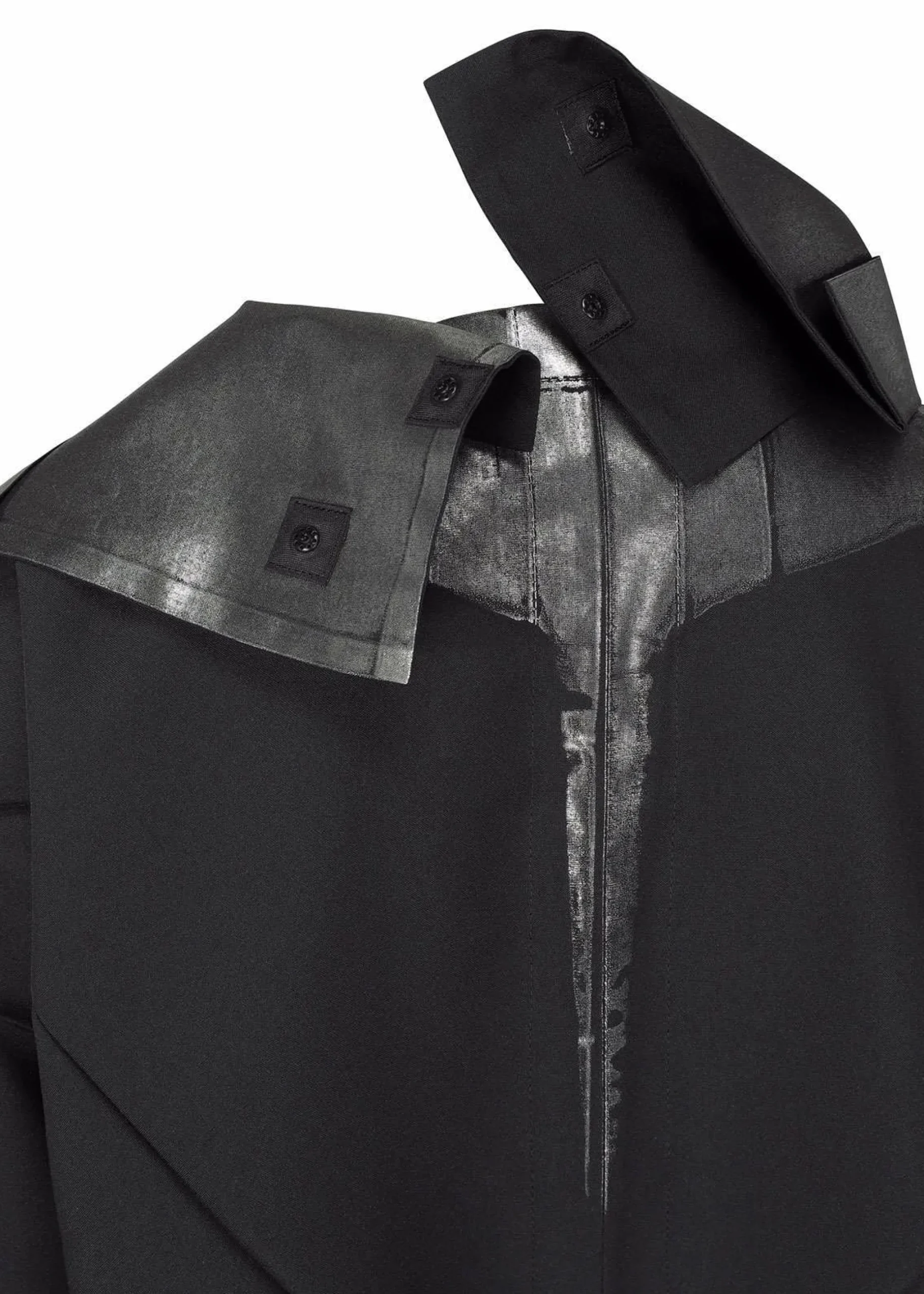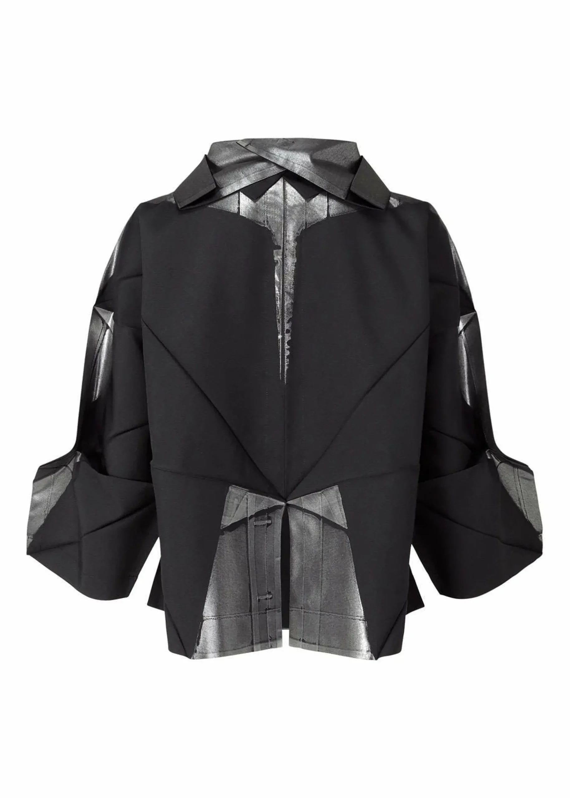 Jacket made from recycled polyester fabric. By applying foil while folded flat, the foil scatters and creates shadows when worn. It has a flat design when folded.