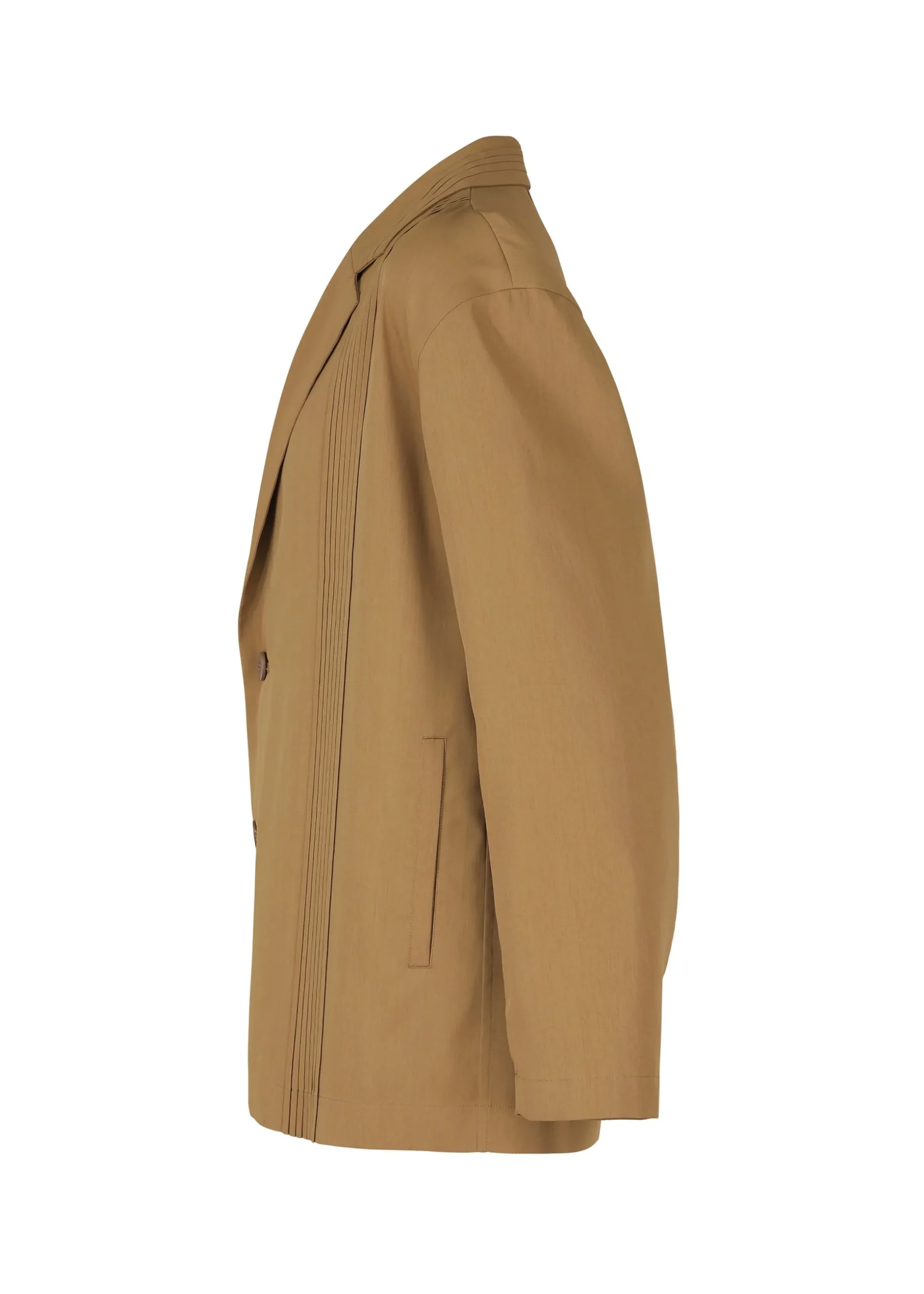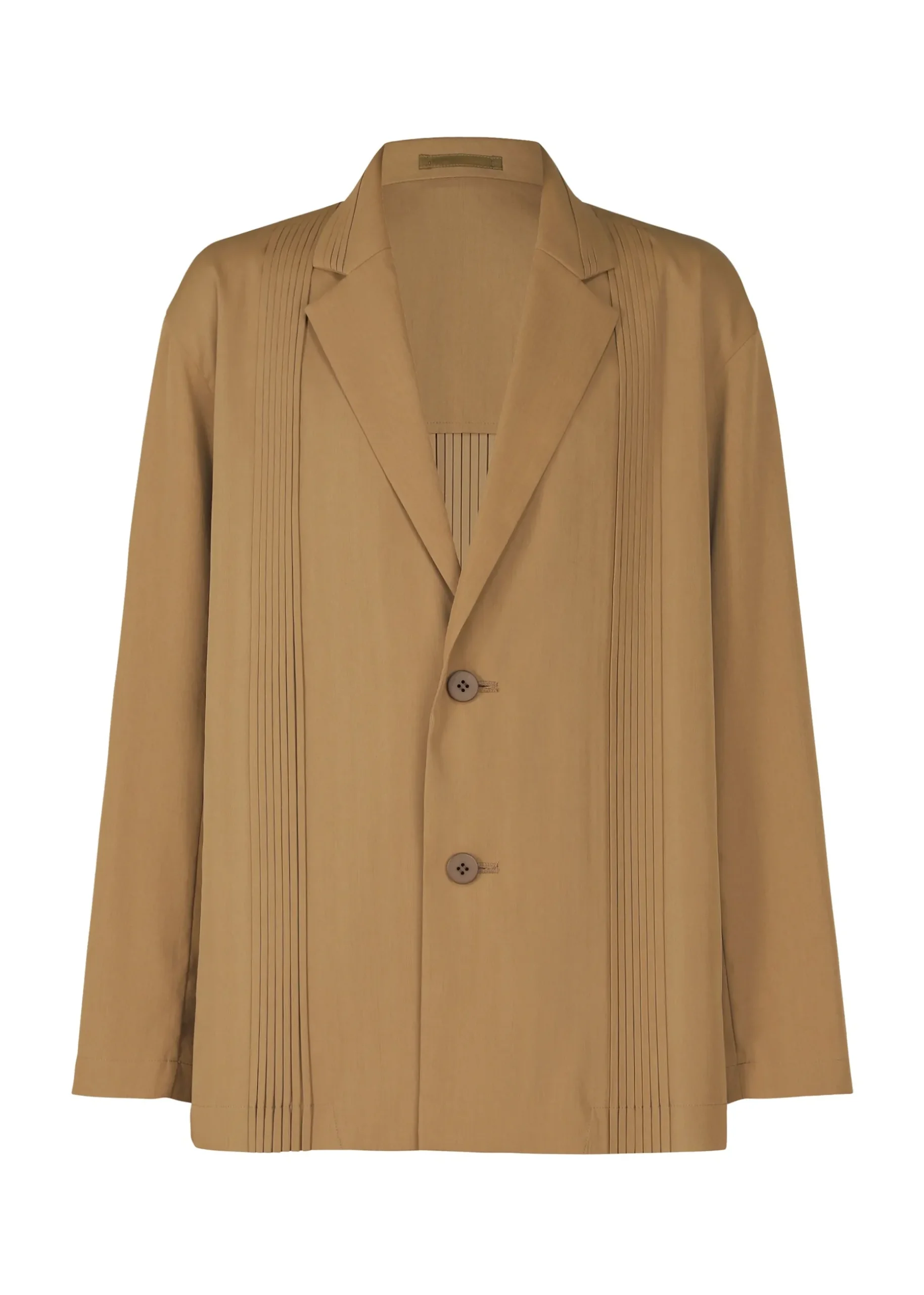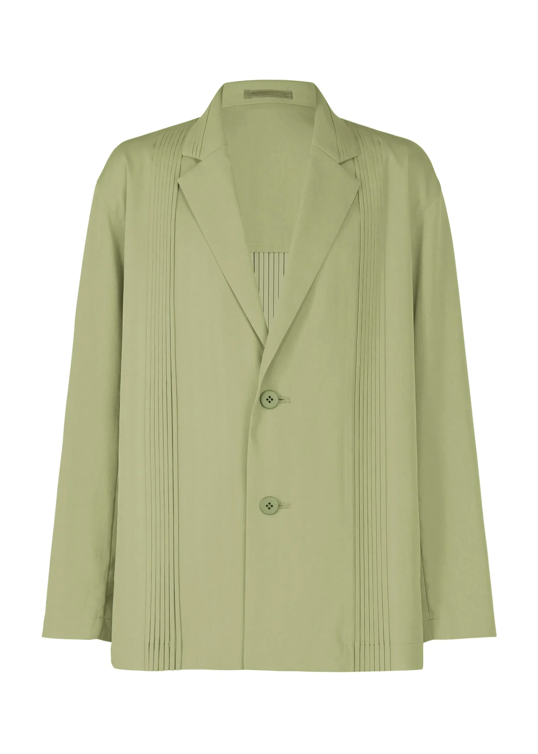This jacket is characterized by its uneven textile. Strongly twisting the thread gives it elasticity at the product dyeing stage, creating a unique look.